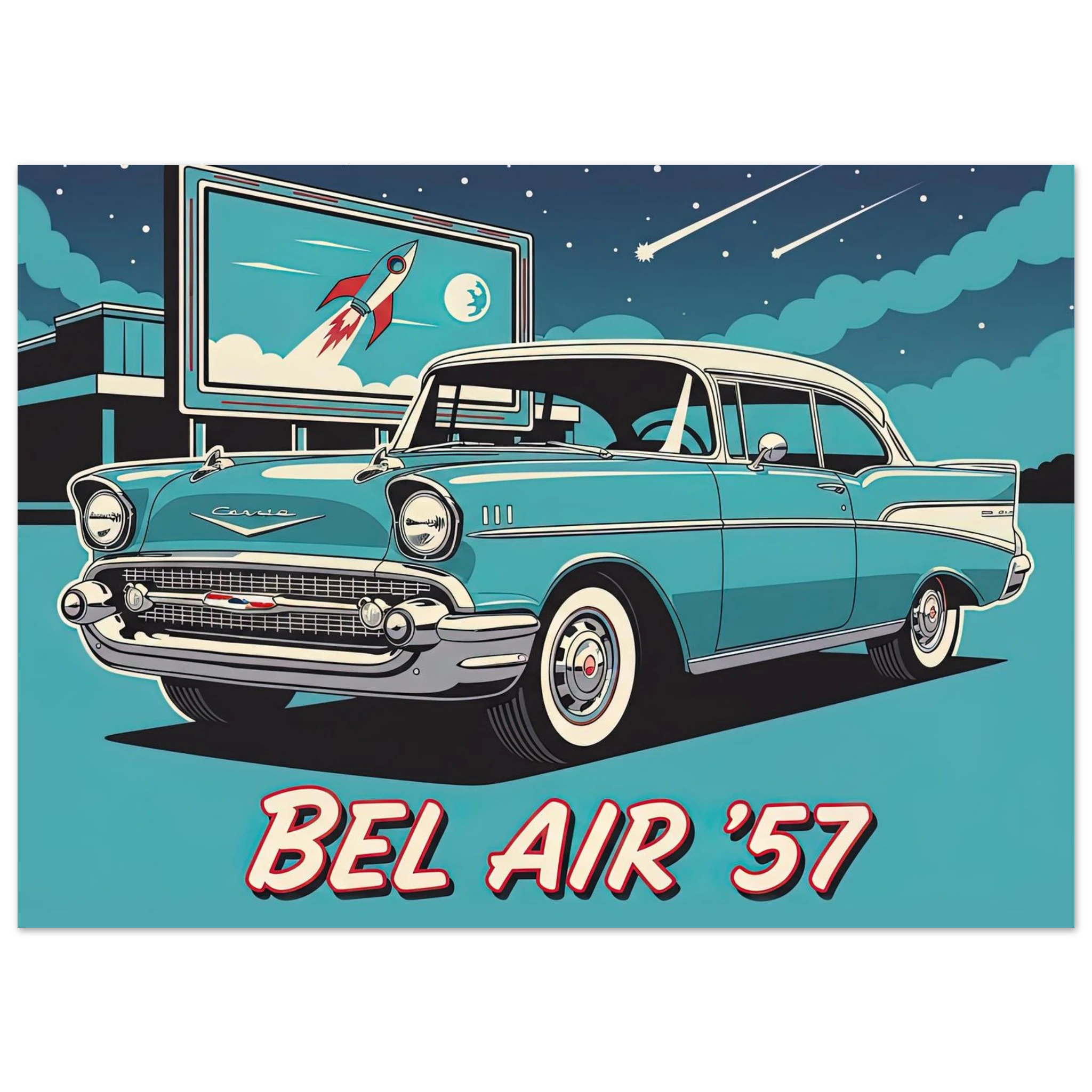 Chevrolet Bel Air 1957 turquesa ilustrado estilo poster vintage. Drive-in al fondo, chromes brillantes, aletas icónicas. Arte cultura automovilística americana años 50.