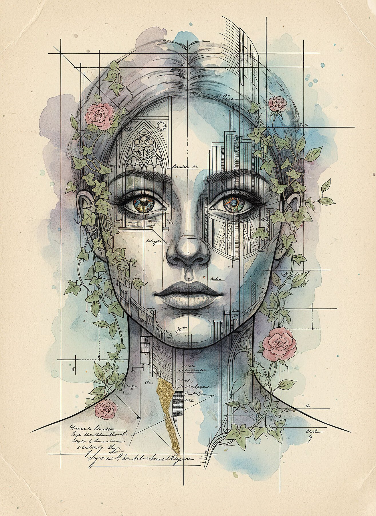 “Arquitectura Emocional” es una metáfora visual poderosa sobre la construcción de la identidad y la estructura emocional del ser. El rostro de la mujer se integra con planos arquitectónicos y fachadas de edificios, donde arcos góticos representan aspiraciones espirituales y detalles Art Deco simbolizan elegancia y fortaleza. Las líneas técnicas precisas contrastan con hiedras y rosas trepadoras que crecen orgánicamente a través de las estructuras, recordándonos que la naturaleza emocional siempre encuentra grietas en nuestras defensas cuidadosamente construidas. Las aguadas de acuarela representan emociones como patrones climáticos que bañan los edificios del alma. Los esbozos arquitectónicos vintage collageados añaden capas de historia personal. Una pieza para arquitectos del alma, terapeutas y cualquiera en proceso de reconstrucción personal.