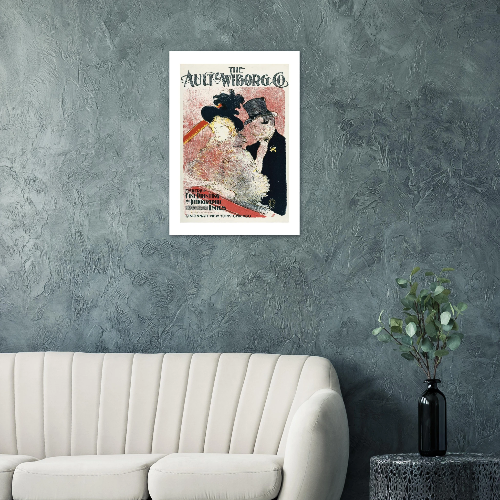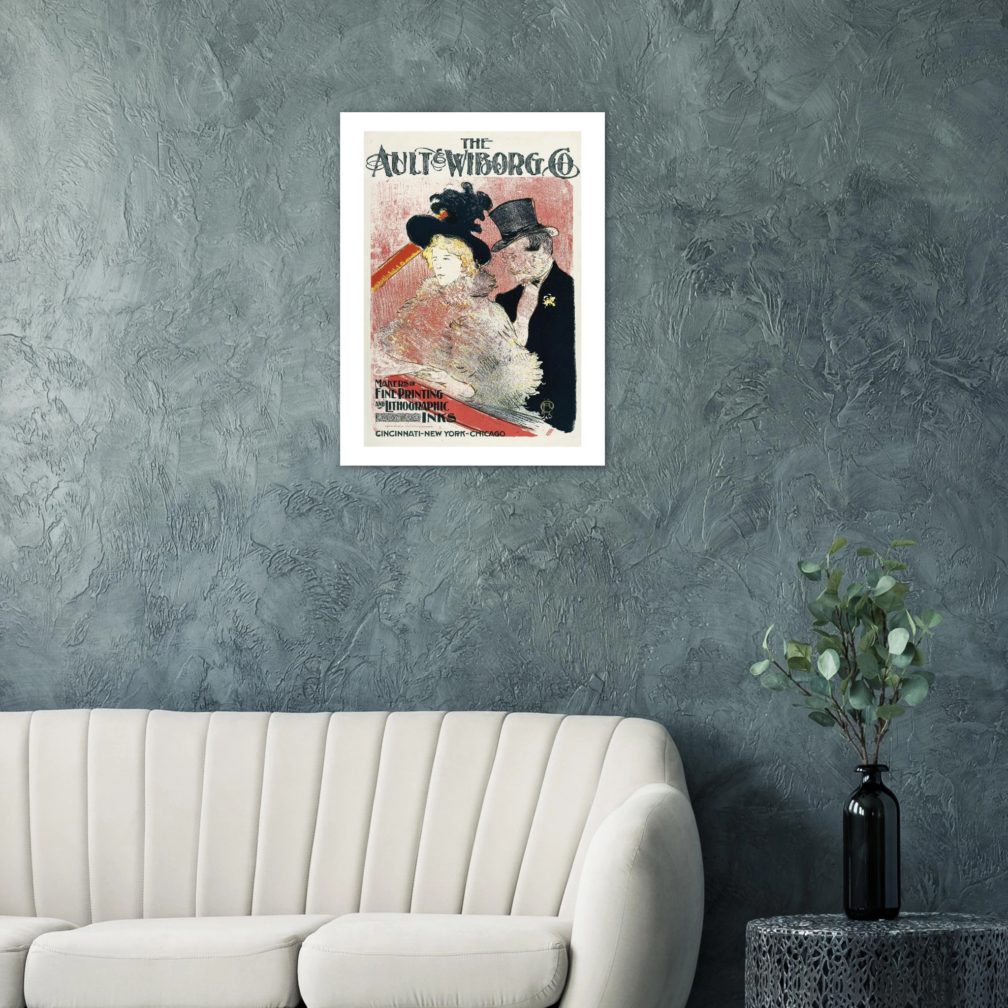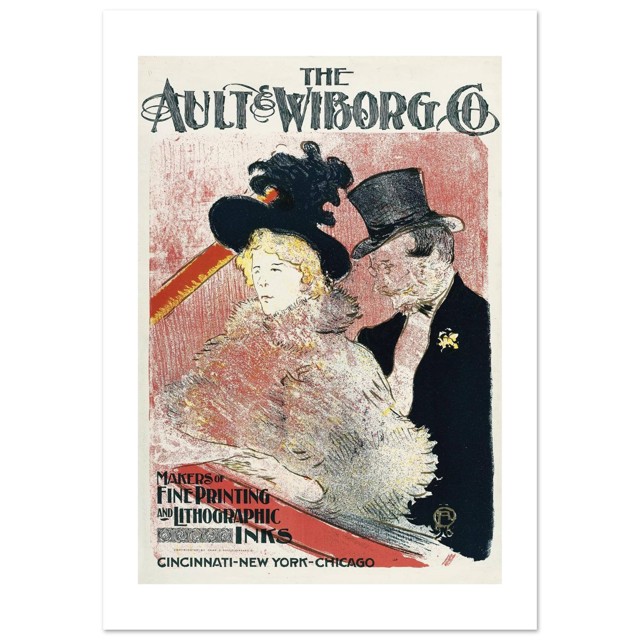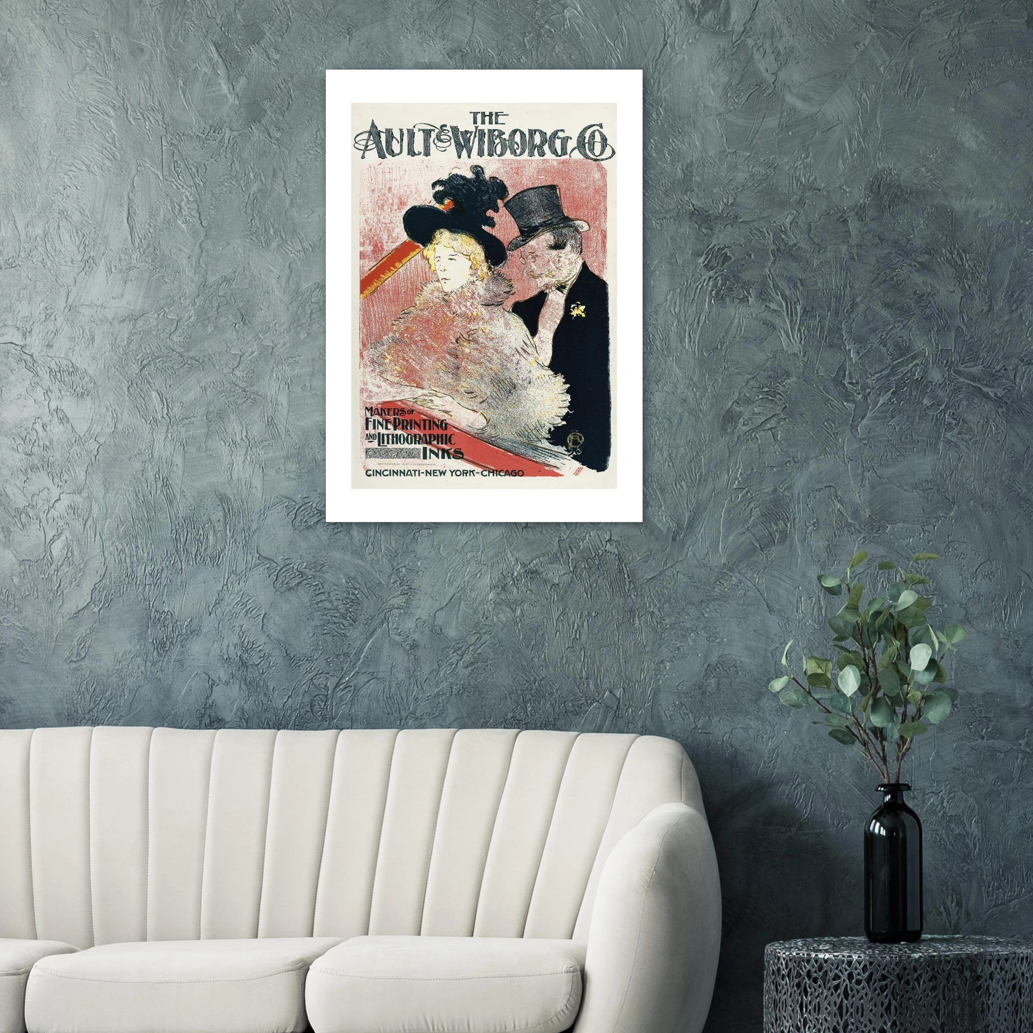Este cartel publicitario de 1896 fue creado para promocionar las tintas de imprenta de la empresa estadounidense Ault & Wiborg en el mercado francés. Toulouse-Lautrec enfrenta el desafío de hacer visualmente atractivo un producto técnico e industrial, transformándolo en una pieza de diseño memorable.