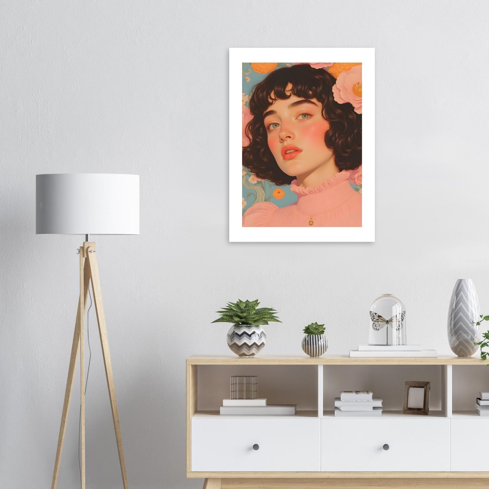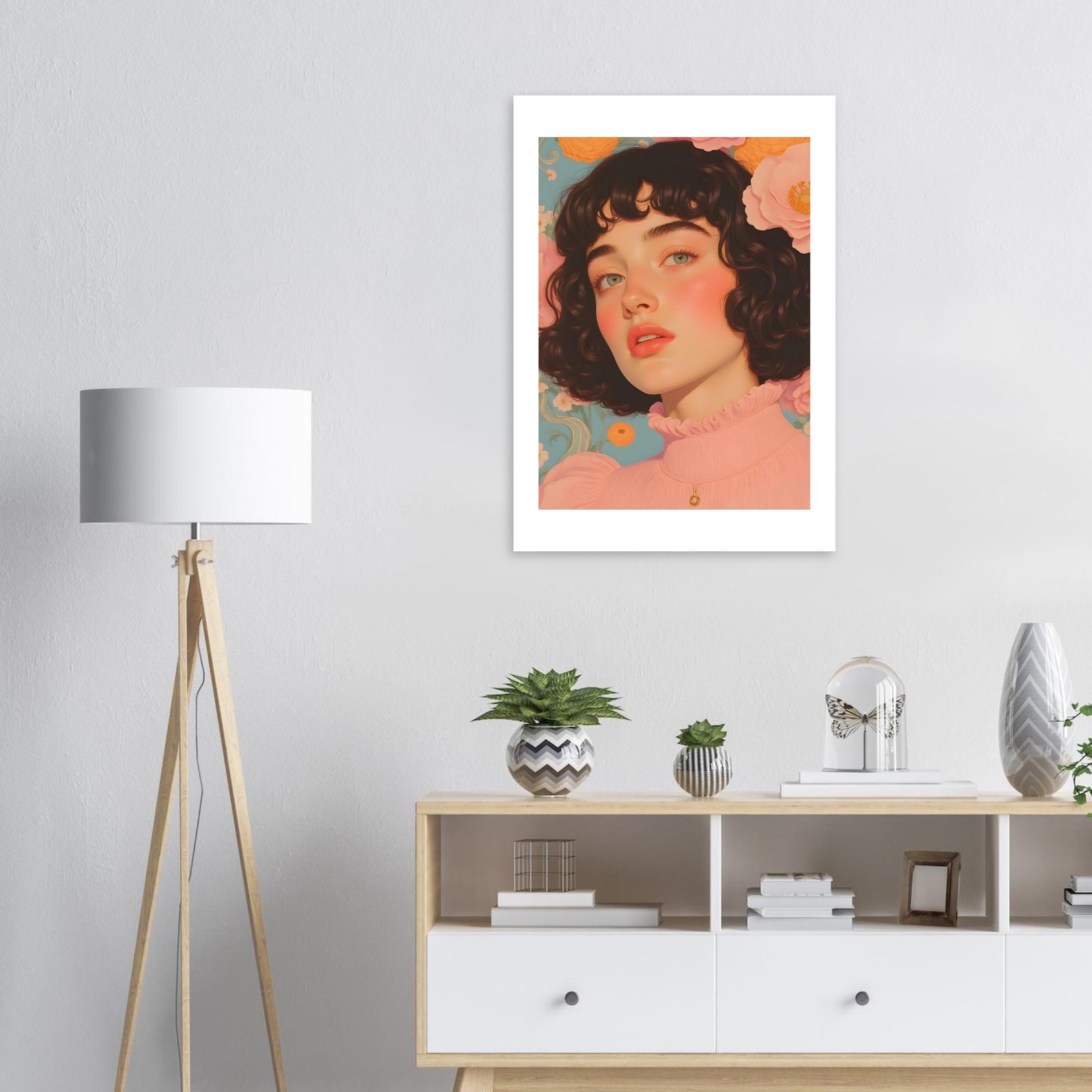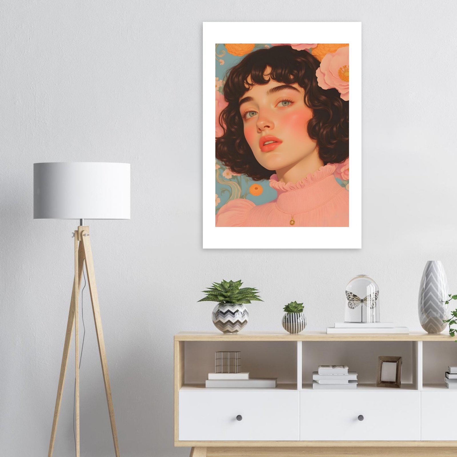Este retrato digital captura la belleza serena de una joven morena de ojos claros, representada en una paleta de suaves tonos pastel que realza su expresión delicada.