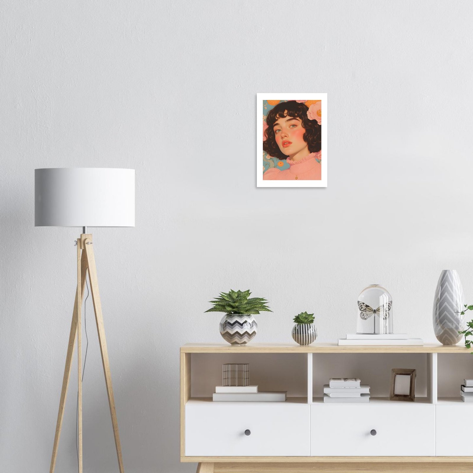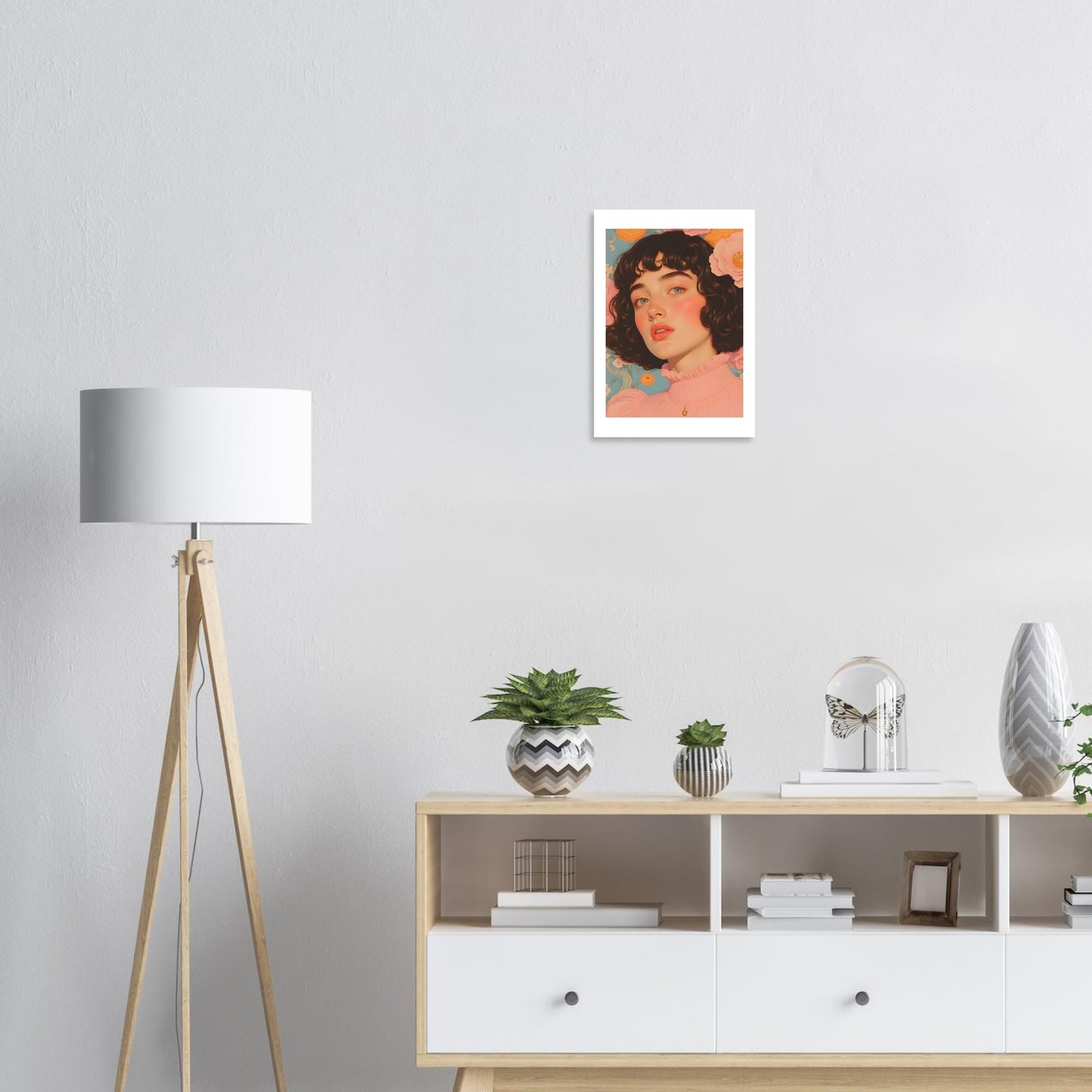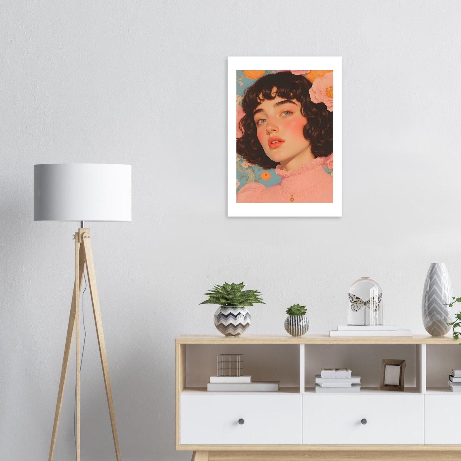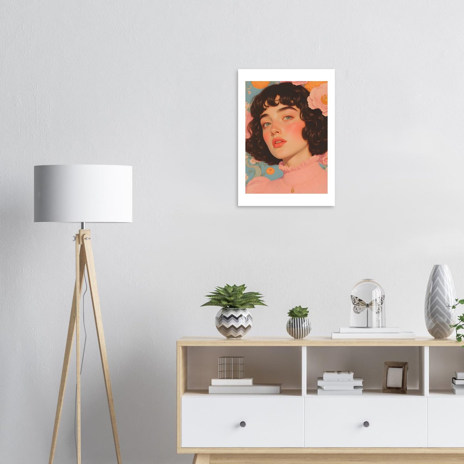Este retrato digital captura la belleza serena de una joven morena de ojos claros, representada en una paleta de suaves tonos pastel que realza su expresión delicada.