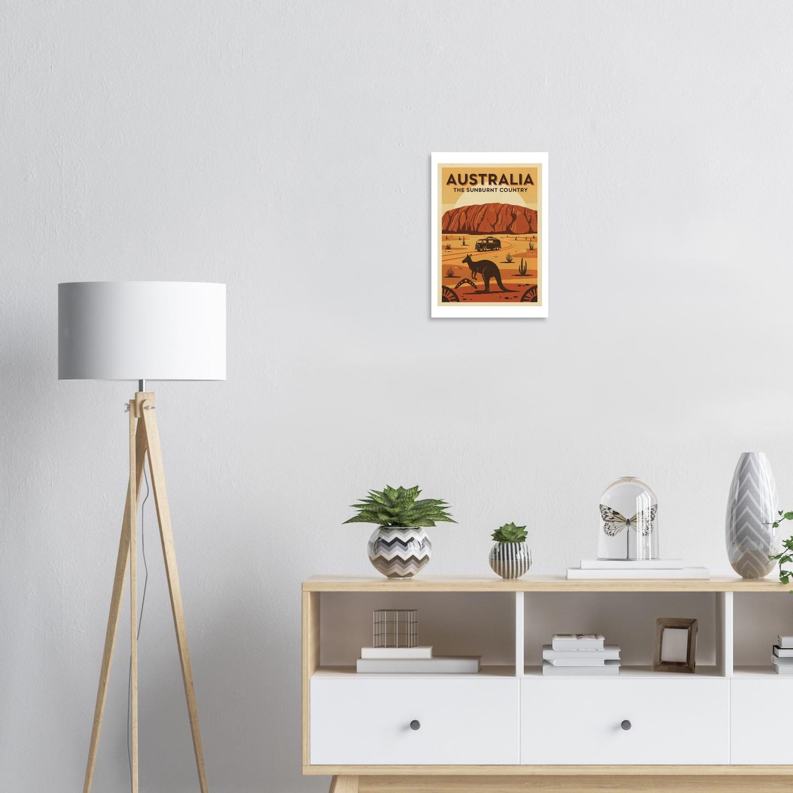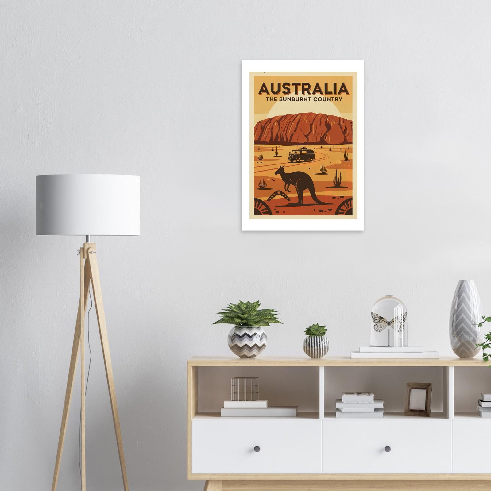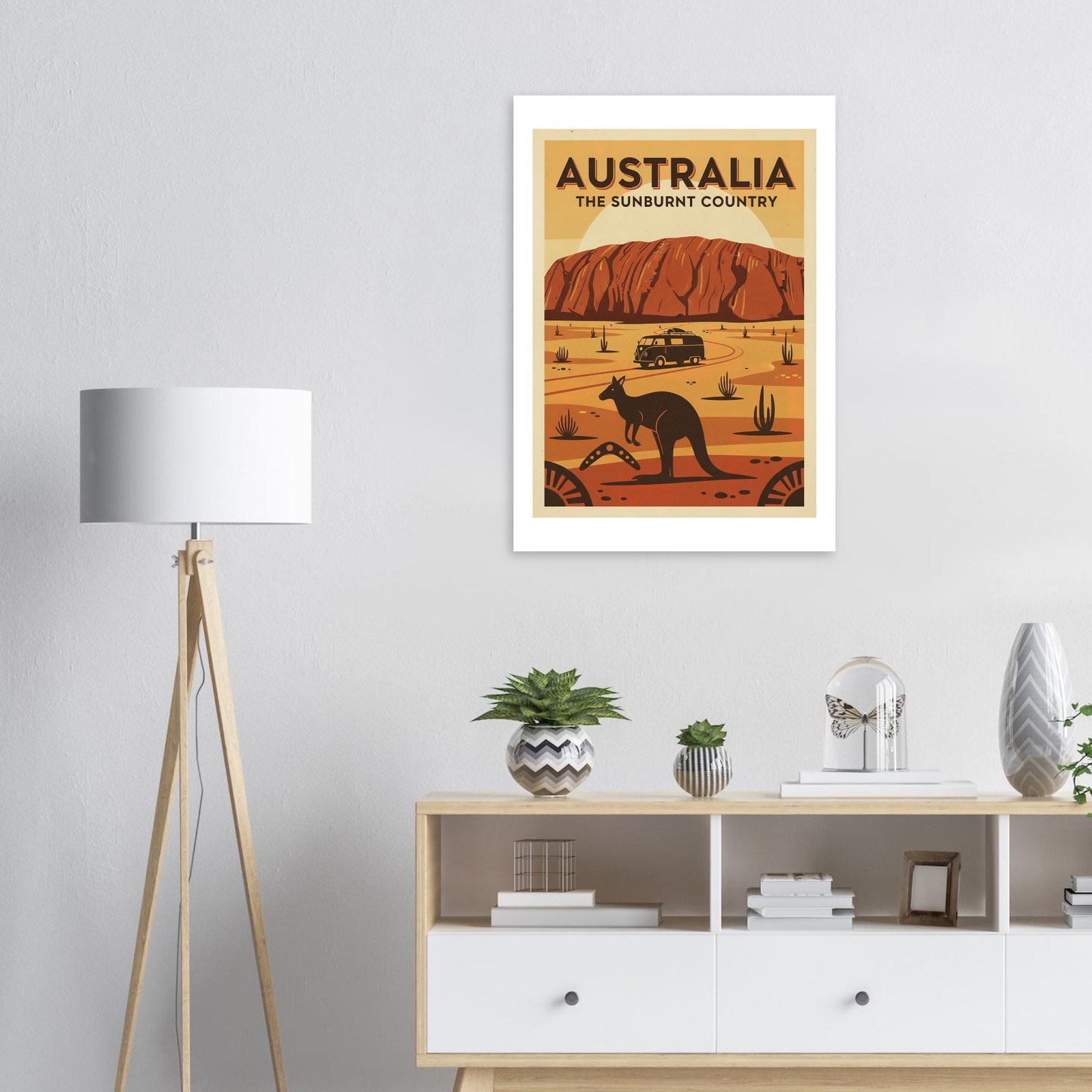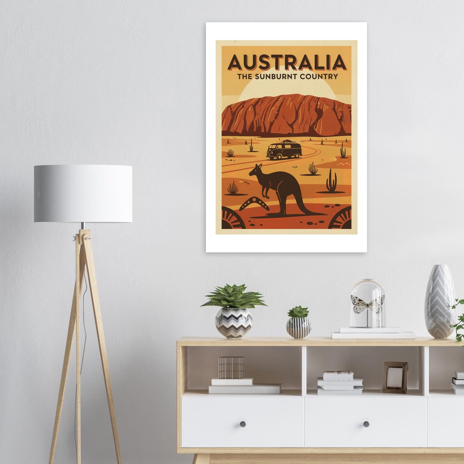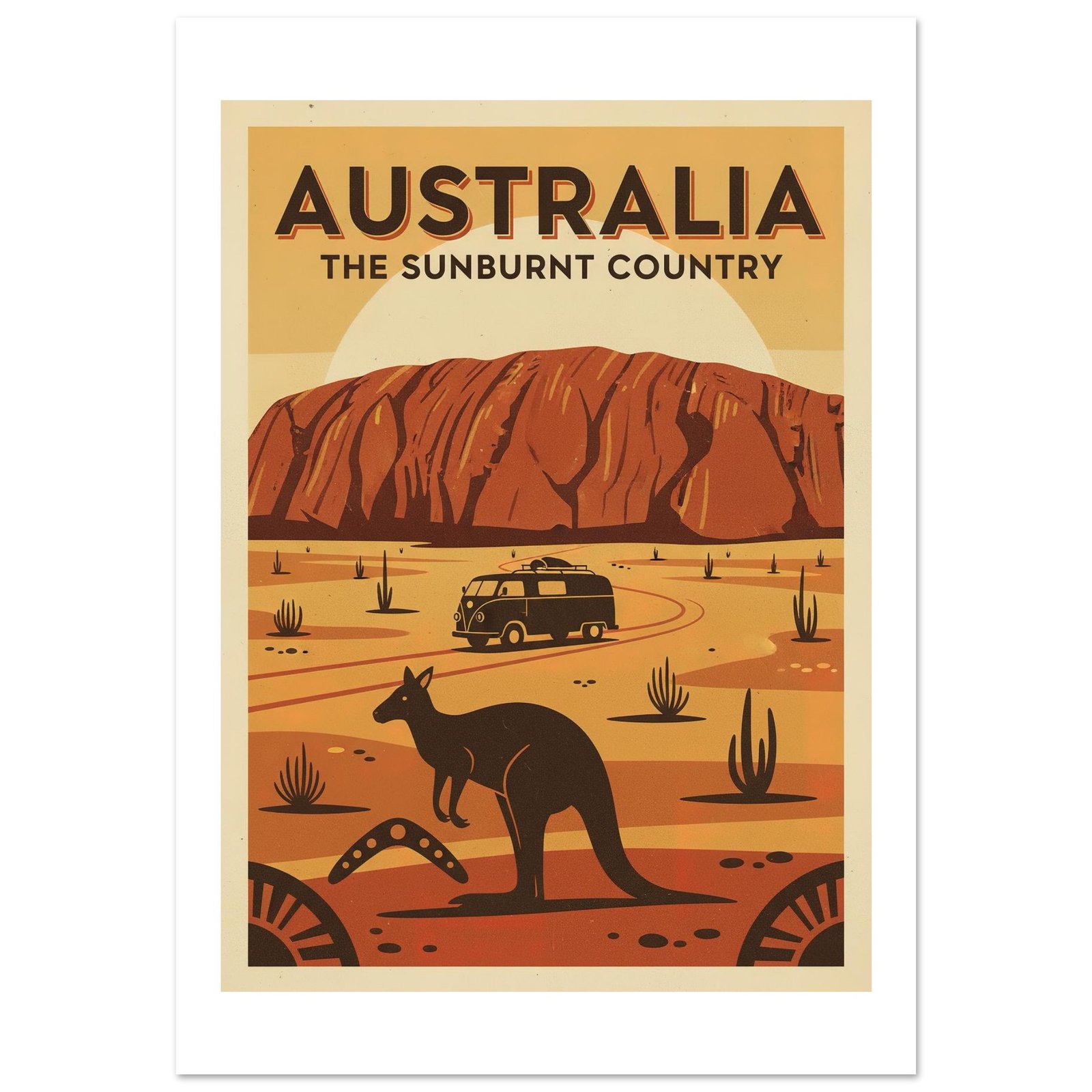 Explora la belleza salvaje de Australia con este póster vintage del outback. Inspirado en los carteles turísticos de los años 50 que promocionaban el interior australiano como destino de aventura, esta pieza celebra los iconos naturales más reconocibles del continente. Los colores cálidos del desierto y las influencias del arte aborigen crean una composición única que captura el espíritu aventurero de down under. Ideal para viajeros y amantes de la naturaleza.