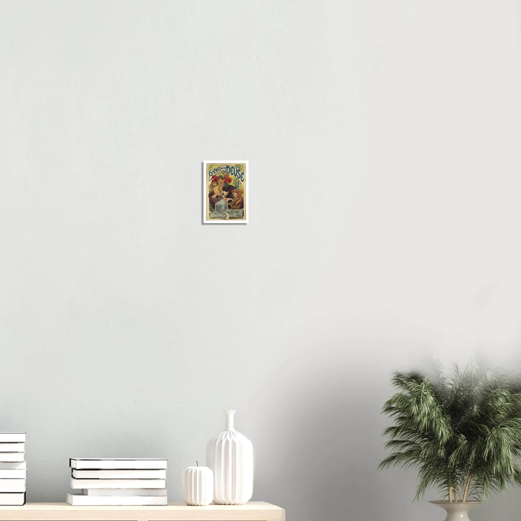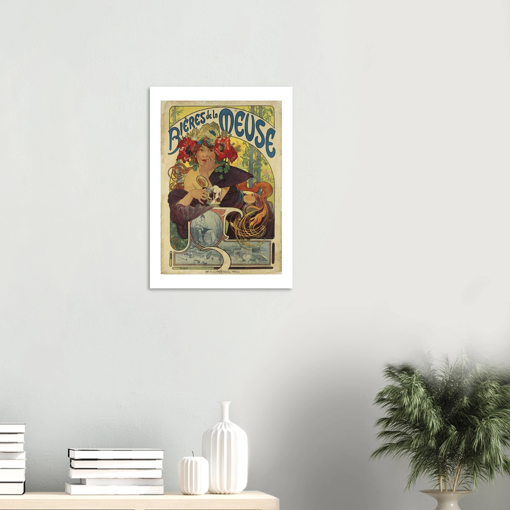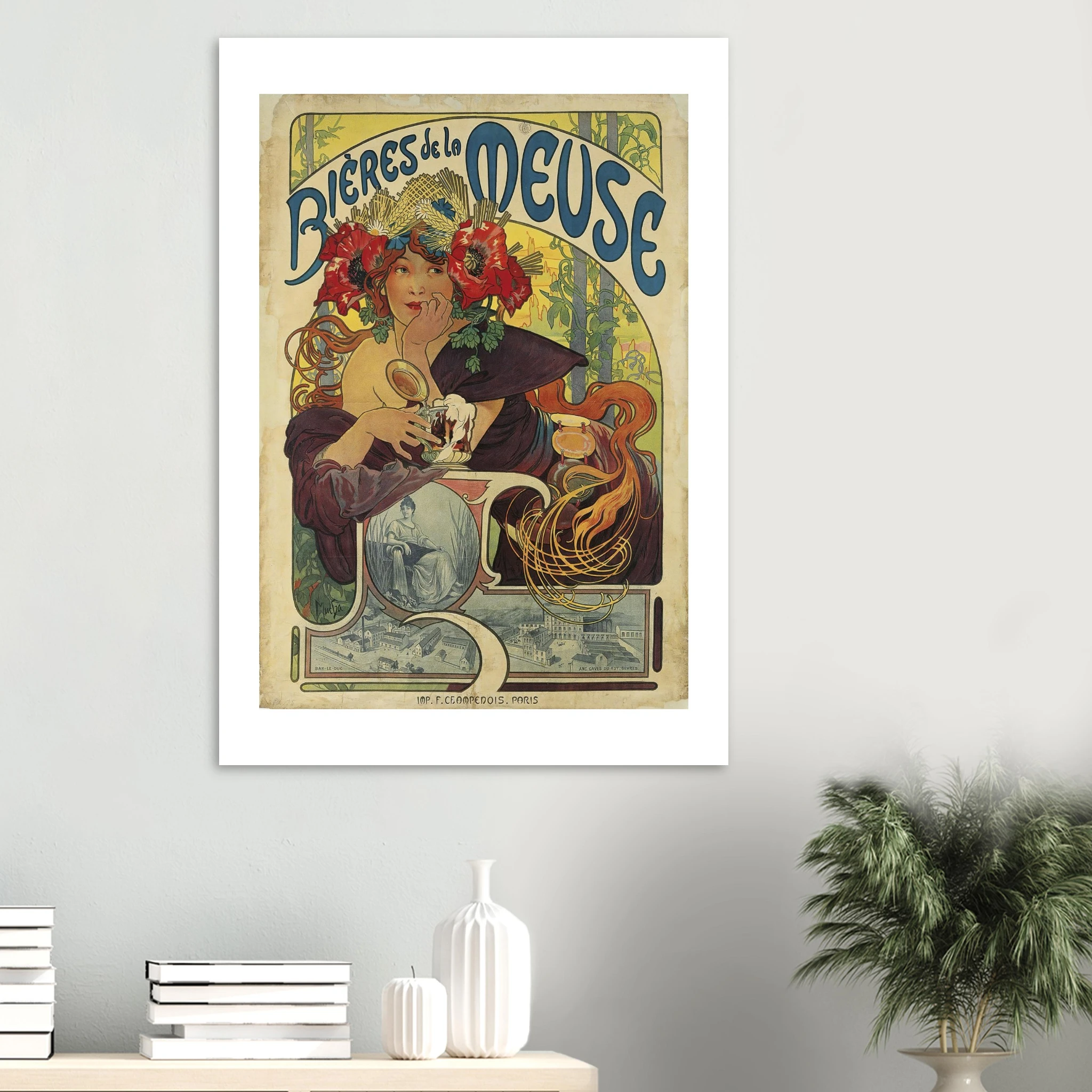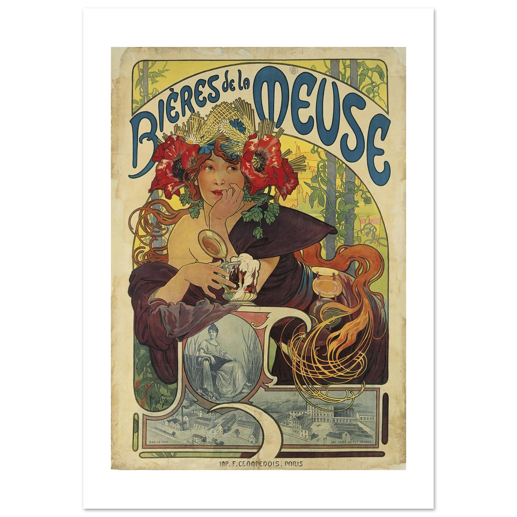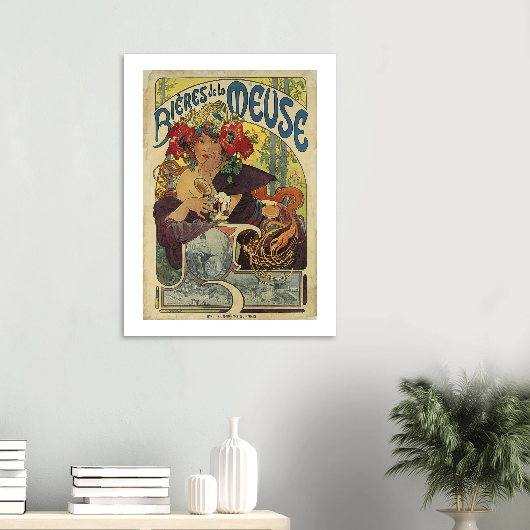 Este cartel publicitario de 1897 es una de las obras comerciales más célebres de Alphonse Mucha, encargada por la cervecería del río Mosa (Meuse) en Francia. La composición presenta a una mujer de cabello ondulante rojizo en actitud seductora, sosteniendo una jarra de cerveza recién servida mientras está rodeada por una exuberante corona de hojas de lúpulo, el ingrediente principal de la cerveza.