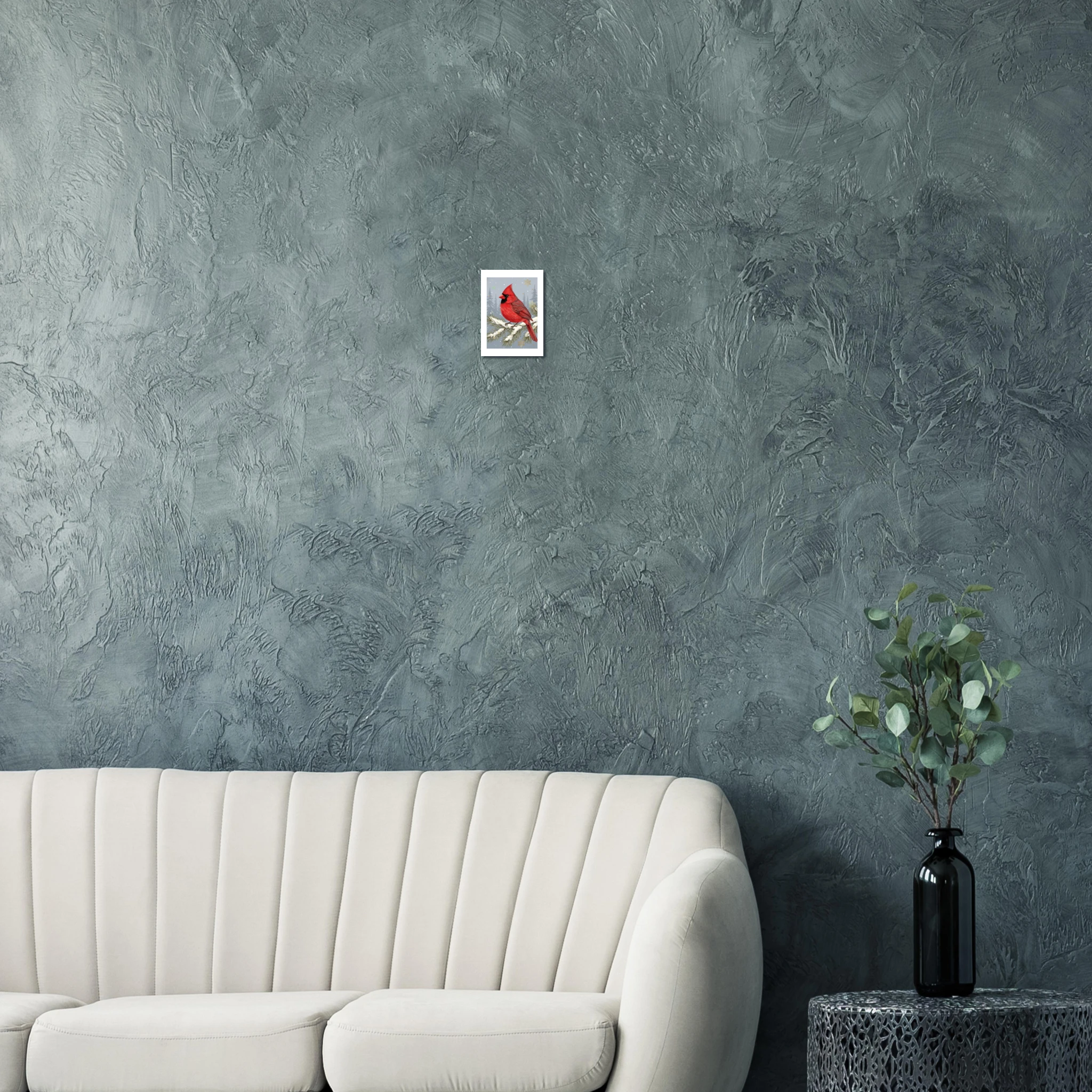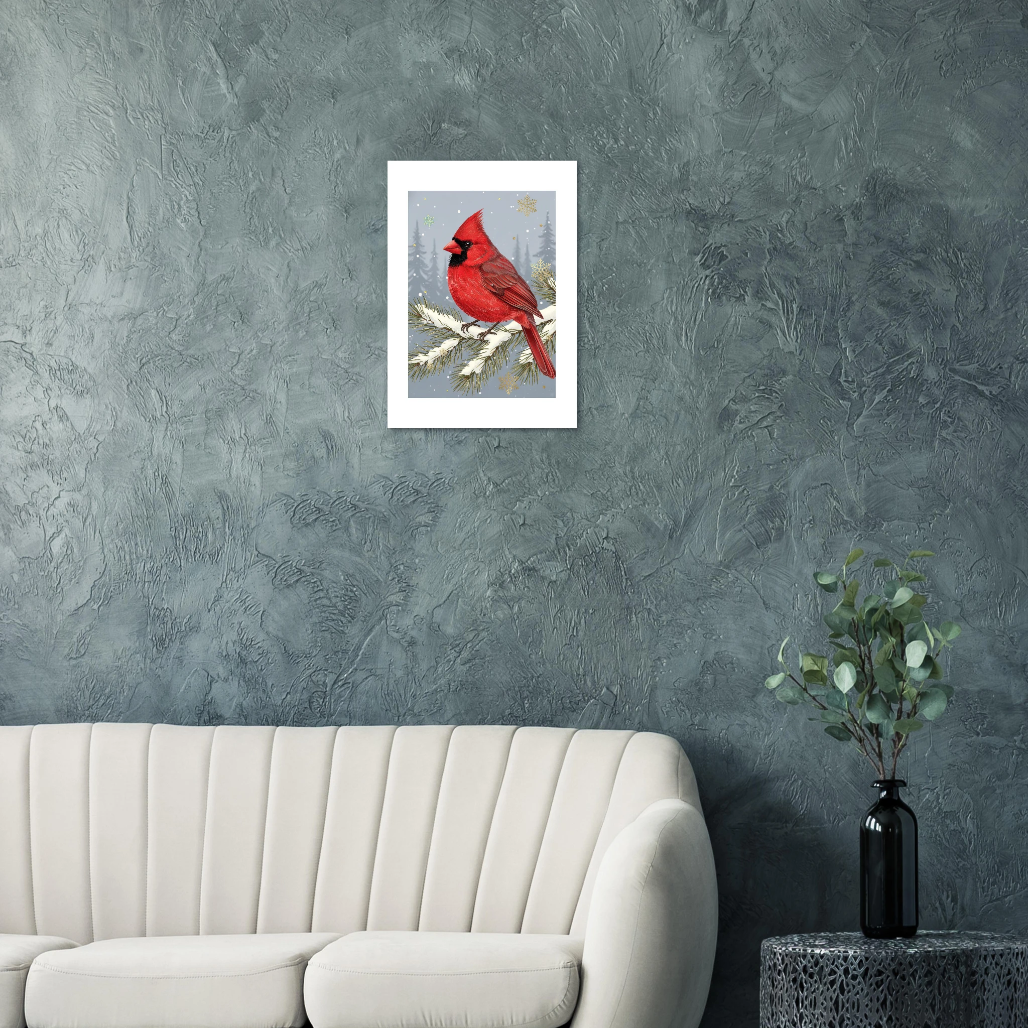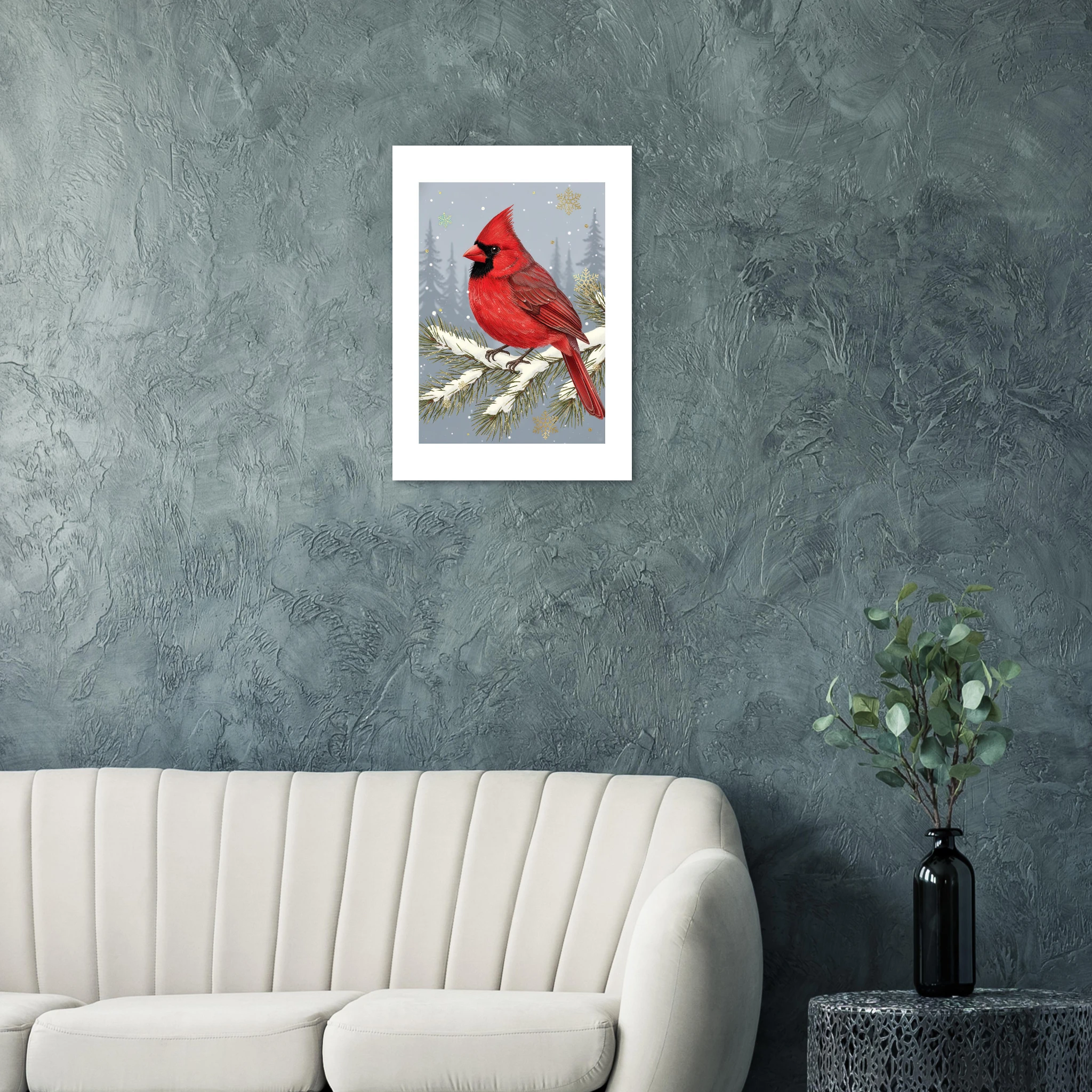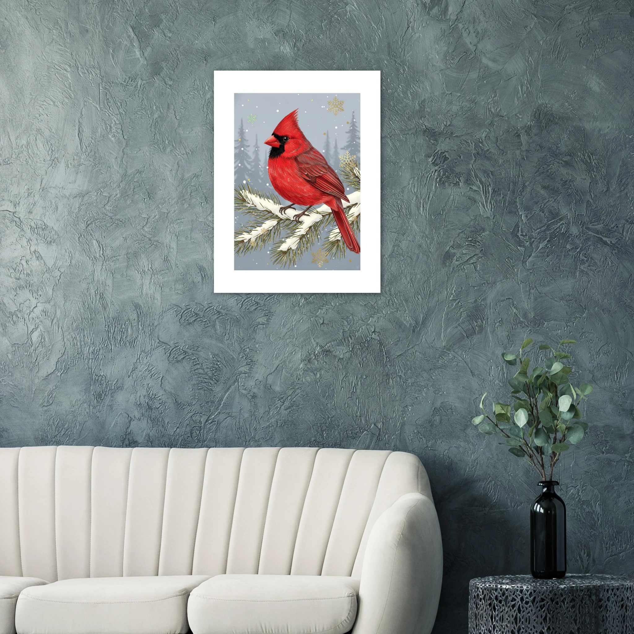 Pájaro cardenal en todo su esplendor rojo vibrante posado delicadamente en rama de pino nevada. El contraste entre el rojo intenso del ave y el fondo gris-azul apagado crea drama visual elegante. Los copos de nieve caen suavemente mientras la textura detallada de las plumas añade realismo. Una celebración de la belleza natural invernal con simplicidad escandinava. Perfecta para amantes de la naturaleza que buscan Navidad con conexión auténtica al invierno.