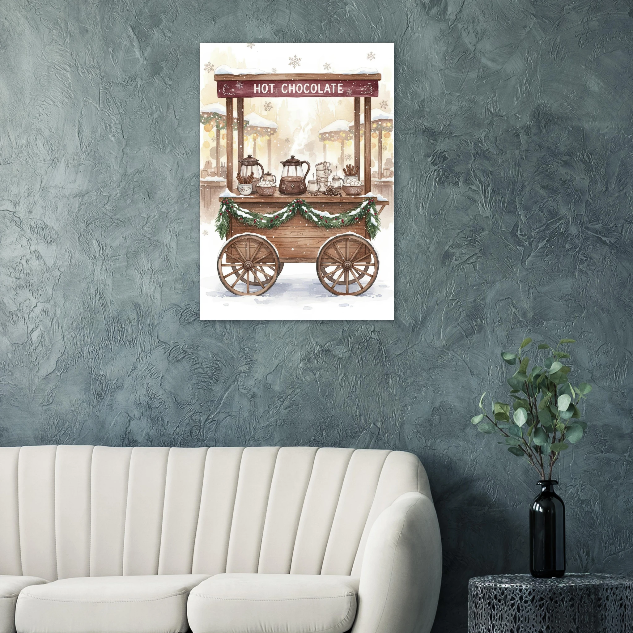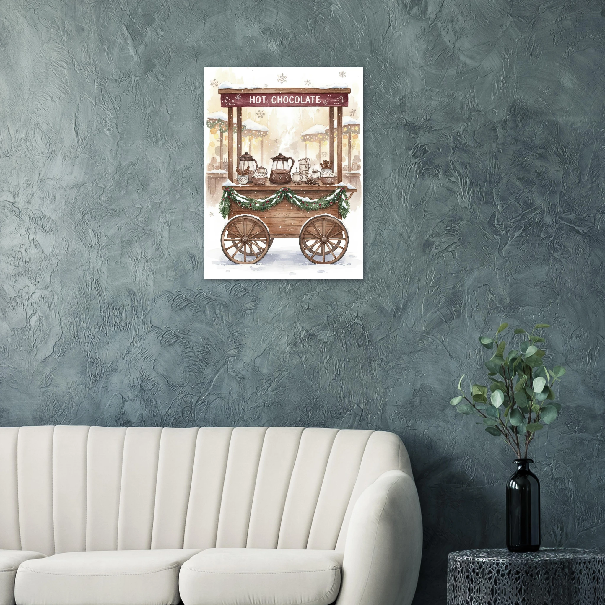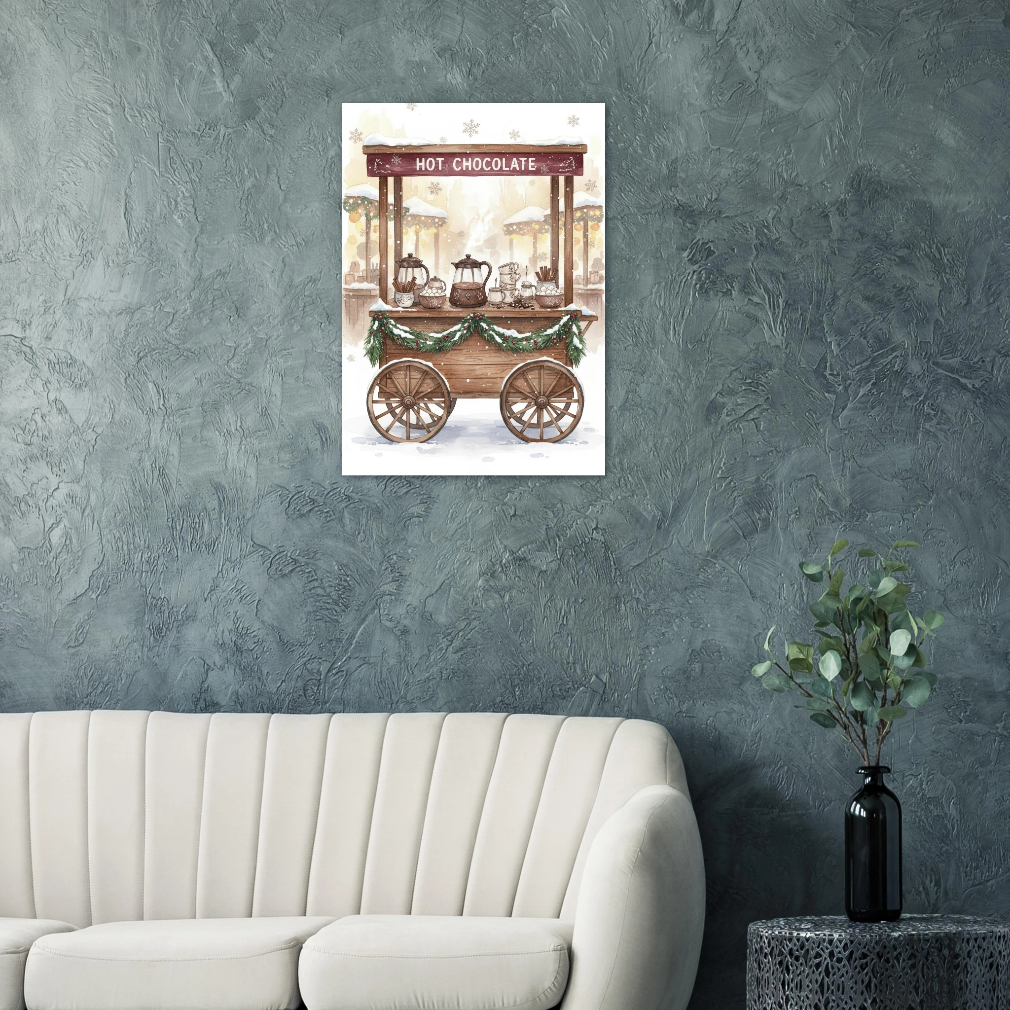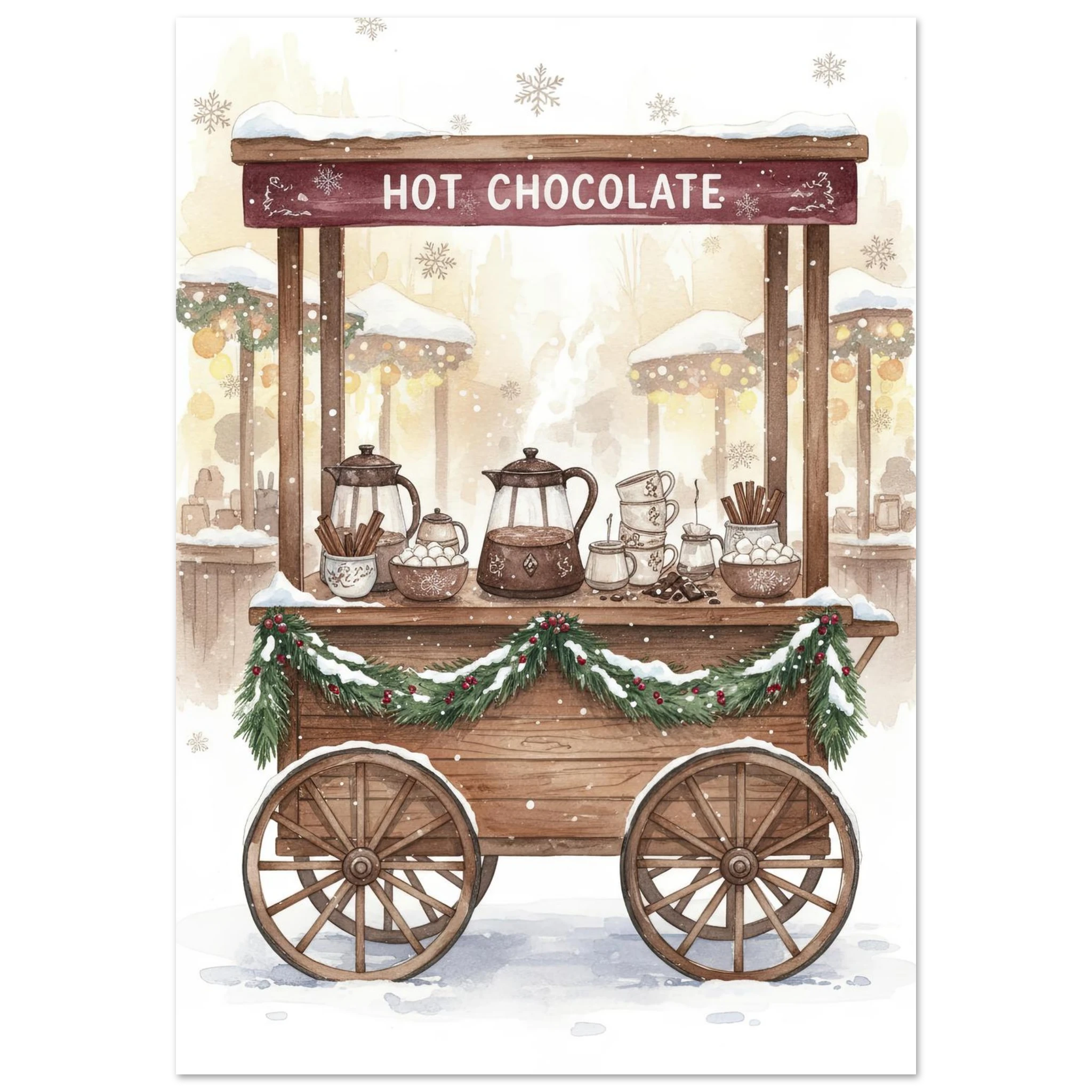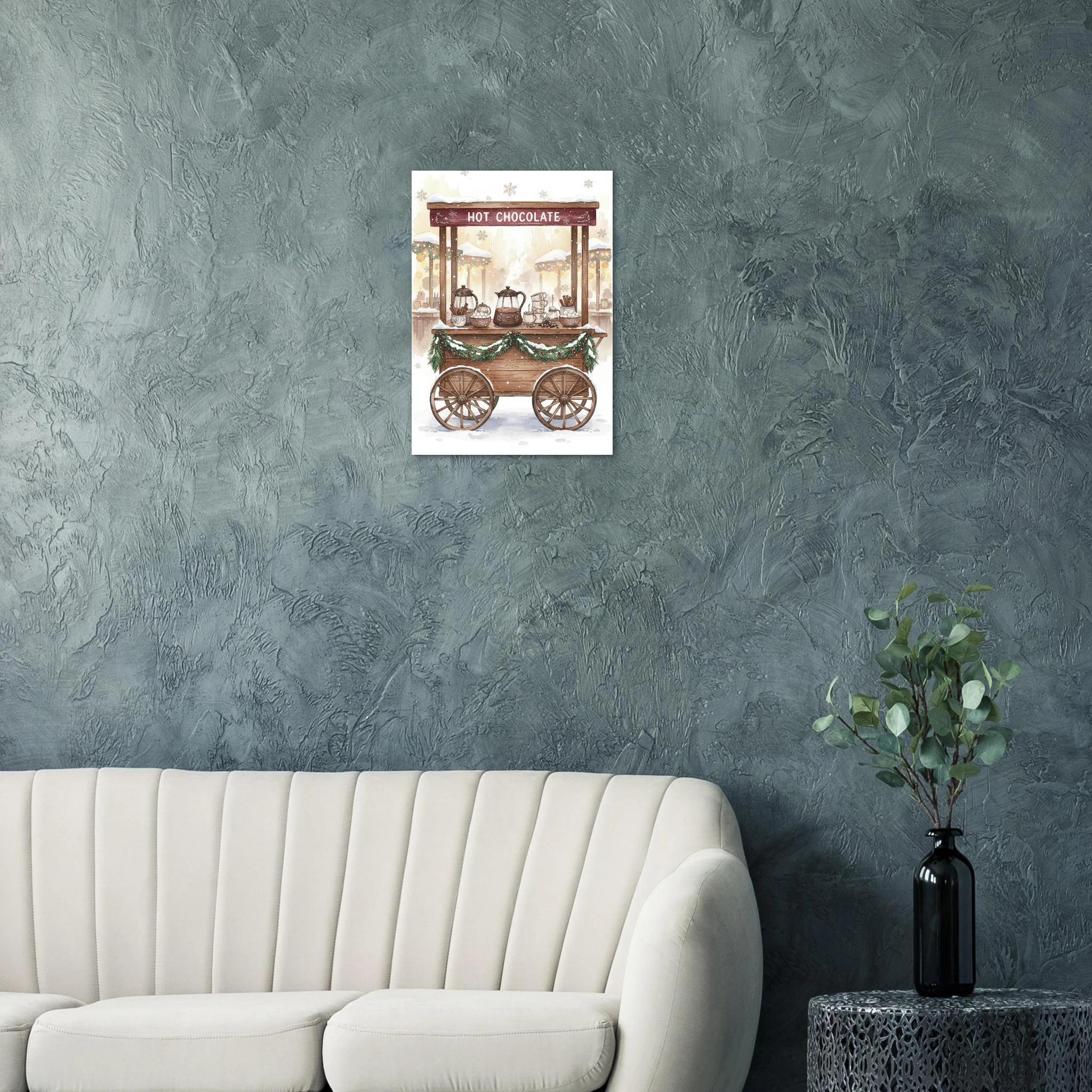 Carrito vintage de chocolate caliente pintado en acuarela con tazas humeantes, malvaviscos y canela. Los tonos burdeos, crema y verde bosque crean una paleta cálida y acogedora. Las pinceladas sueltas y los colores que se funden capturan la atmósfera festiva de los mercados navideños tradicionales. Perfecta para cocinas o comedores que buscan arte gastronómico con espíritu navideño nostálgico.