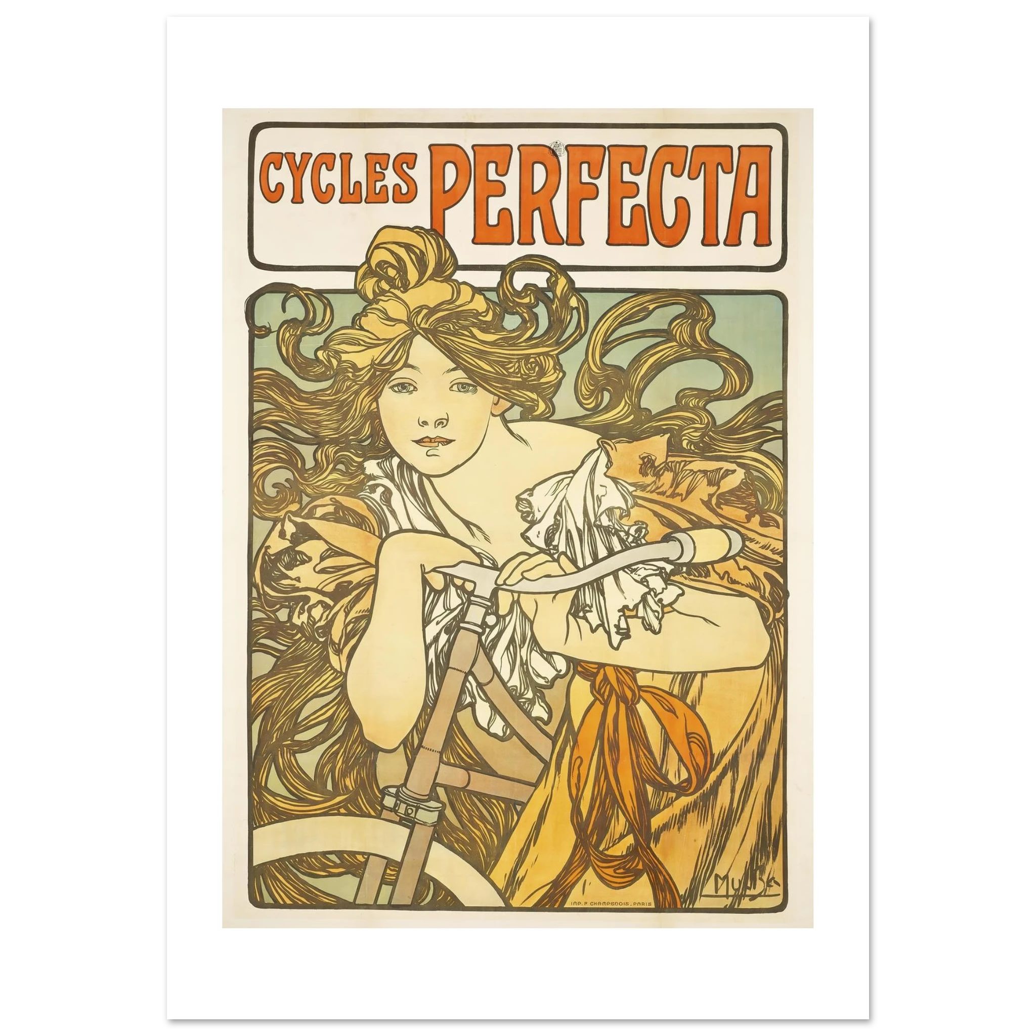 Este extraordinario cartel de 1897 para Cycles Perfecta captura perfectamente el espíritu revolucionario del ciclismo femenino en la Belle Époque. Mucha presenta a una mujer moderna y emancipada, con su cabello característicamente ondulante al viento, simbolizando la libertad que la bicicleta proporcionaba a las mujeres de la época.
