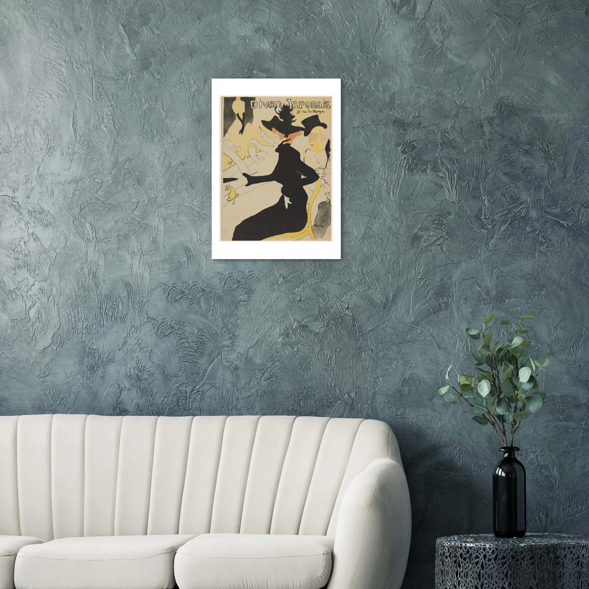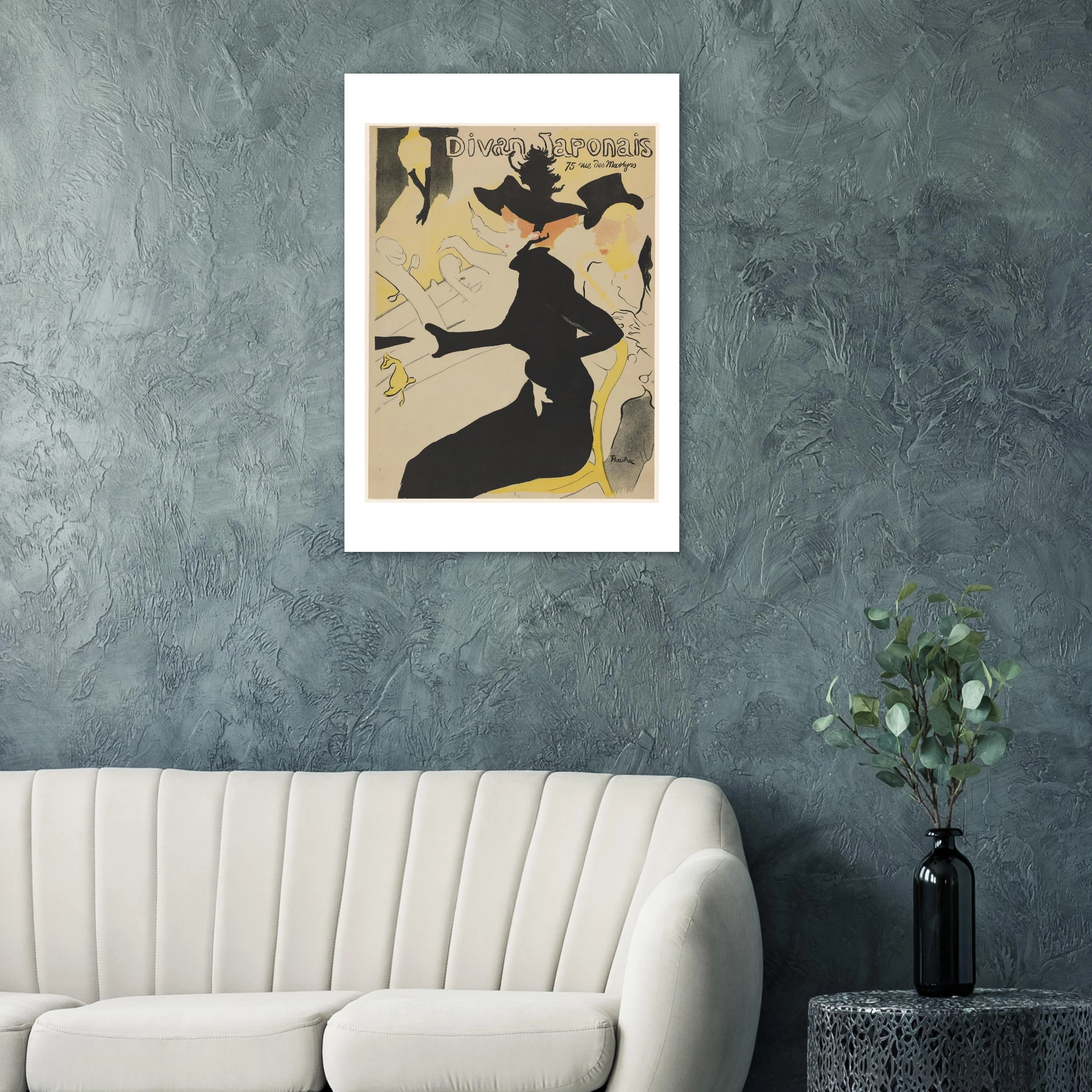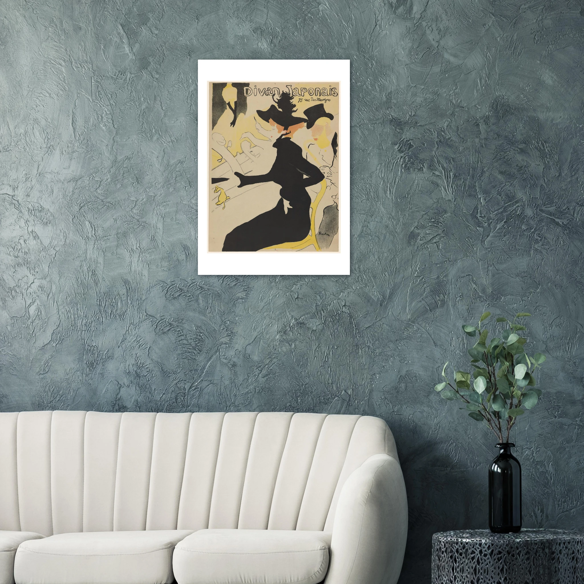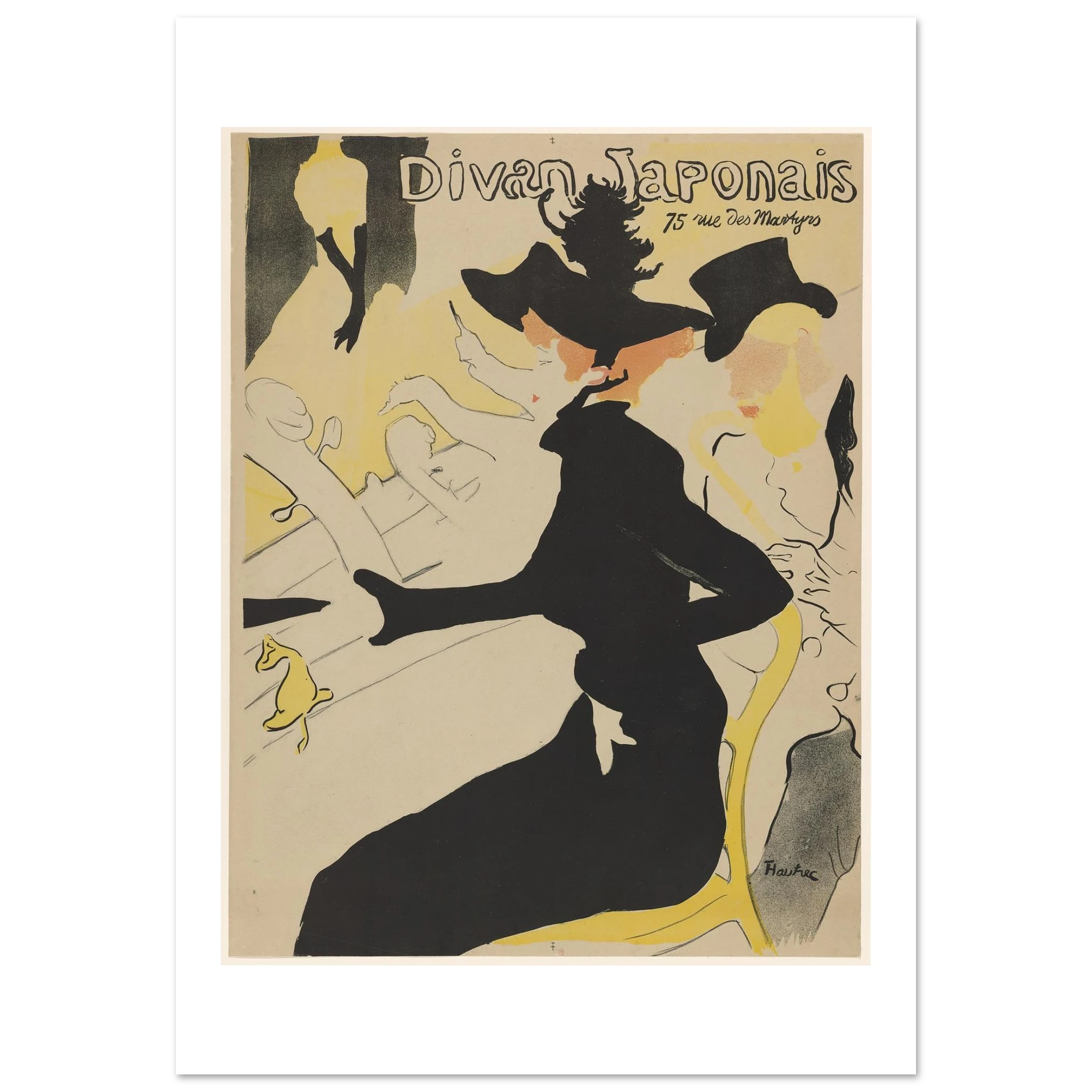 Creado en 1892, este póster para el Divan Japonais representa un momento crucial tanto en la carrera de Toulouse-Lautrec como en la historia del diseño gráfico. La obra muestra al crítico de arte Édouard Dujardin acompañado por la bailarina Jane Avril, mientras que en el escenario aparece decapitada (por el encuadre) la famosa cantante Yvette Guilbert, reconocible por sus característicos guantes negros largos.