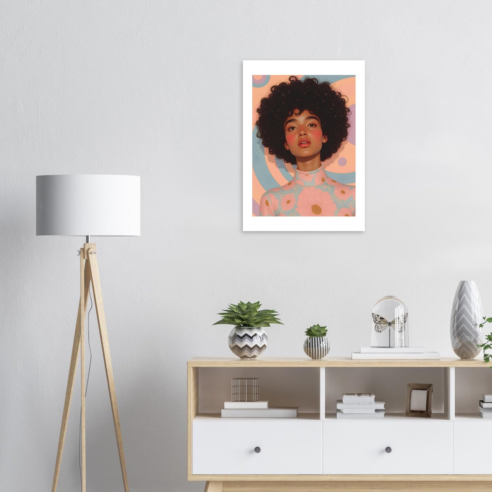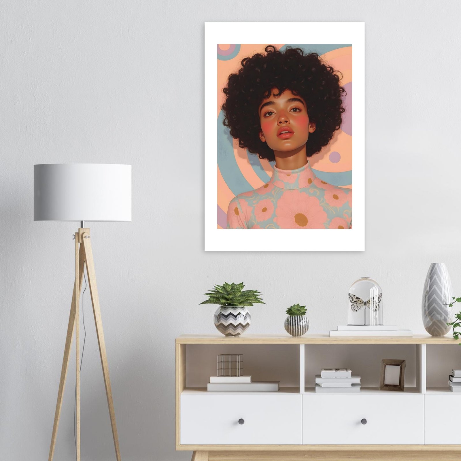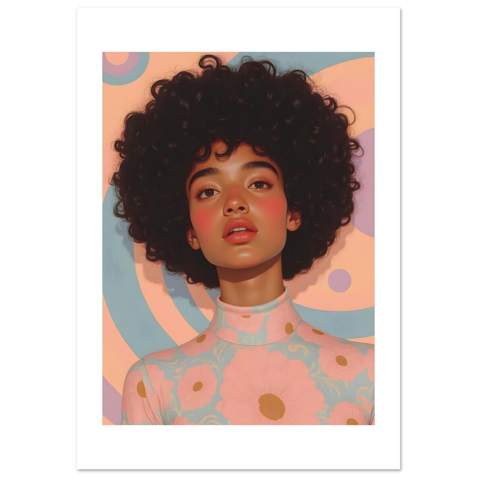 “Ecos del Ayer” es una obra que fusiona moda y arte con un estilo evocador de décadas pasadas. La imagen, que retrata a una figura femenina de expresión suave y mirada enigmática, está enmarcada en un fondo de colores pastel y patrones circulares, representando la esencia vibrante de los años 60 y 70. La calidez de los tonos, el toque floral del atuendo y el peinado afro se combinan para crear una estética que conecta con una época de libertad y exploración.