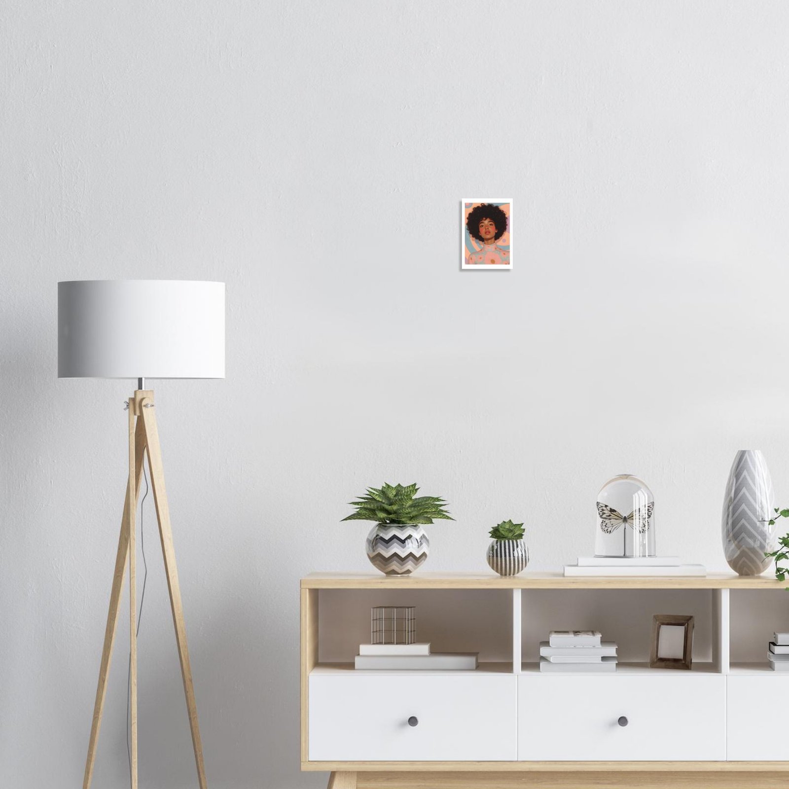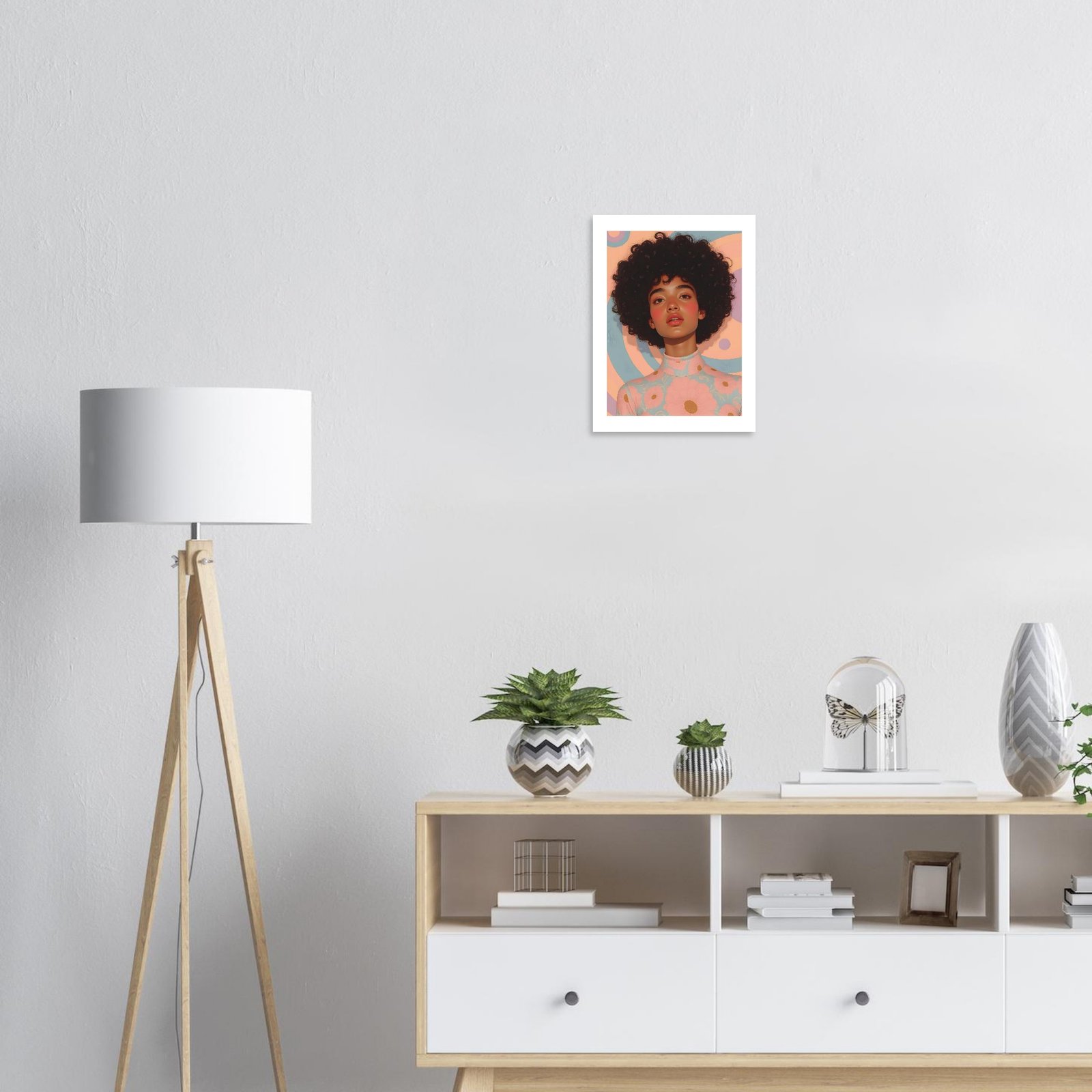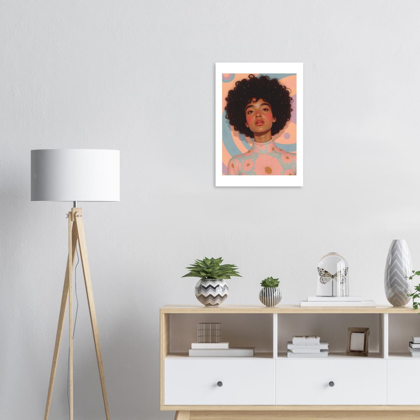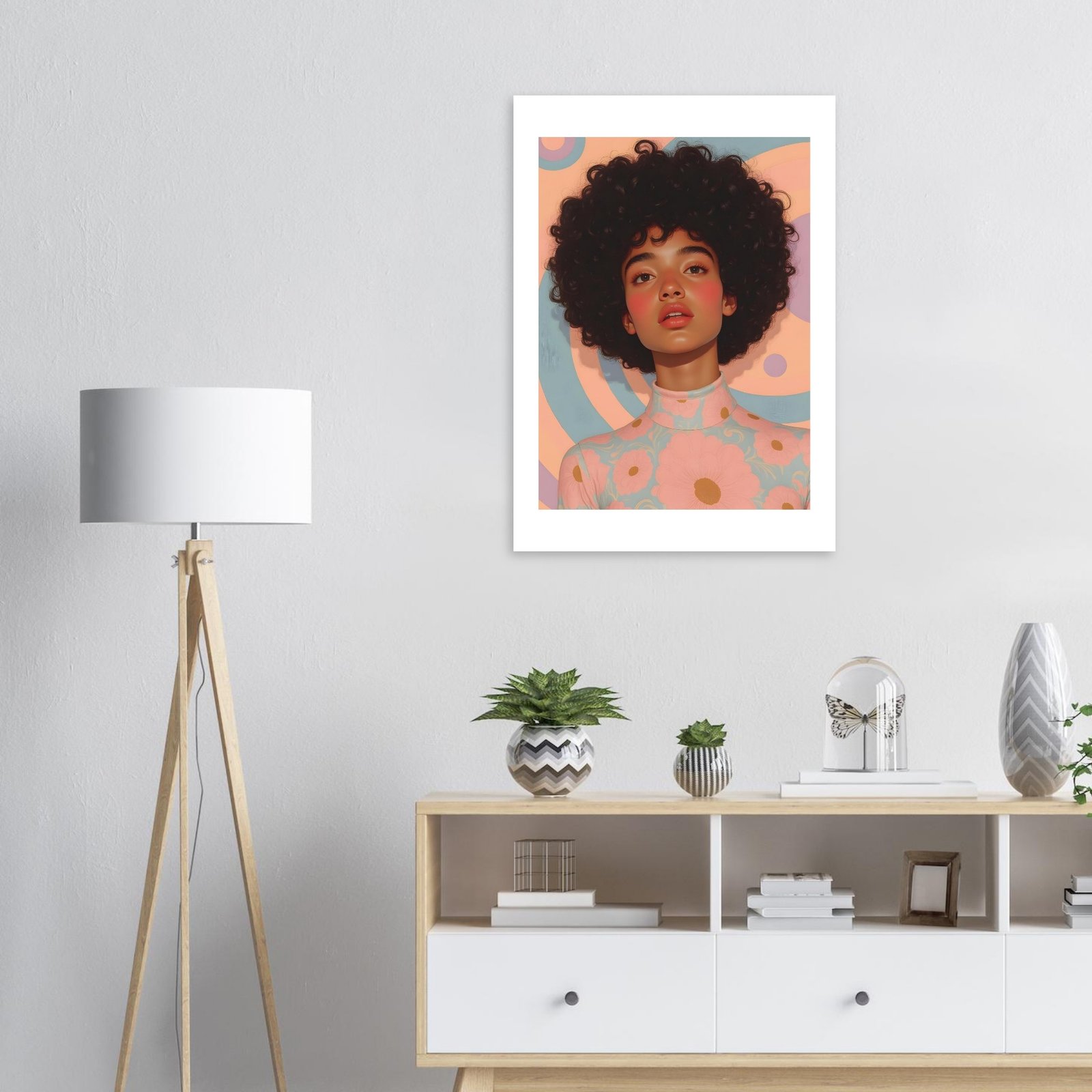 “Ecos del Ayer” es una obra que fusiona moda y arte con un estilo evocador de décadas pasadas. La imagen, que retrata a una figura femenina de expresión suave y mirada enigmática, está enmarcada en un fondo de colores pastel y patrones circulares, representando la esencia vibrante de los años 60 y 70. La calidez de los tonos, el toque floral del atuendo y el peinado afro se combinan para crear una estética que conecta con una época de libertad y exploración.