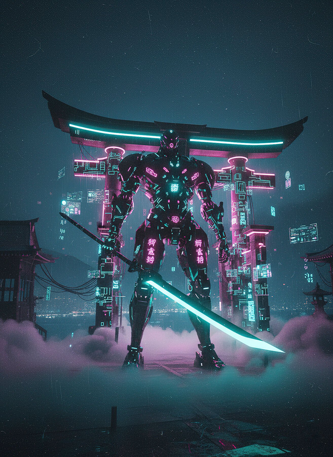 Un coloso robótico custodia un santuario neón rodeado por niebla. Su figura imponente y su luz interna proyectan seguridad y solemnidad. “El Guardián del Santuario Digital” combina espiritualidad, ingeniería y simbolismo protector.