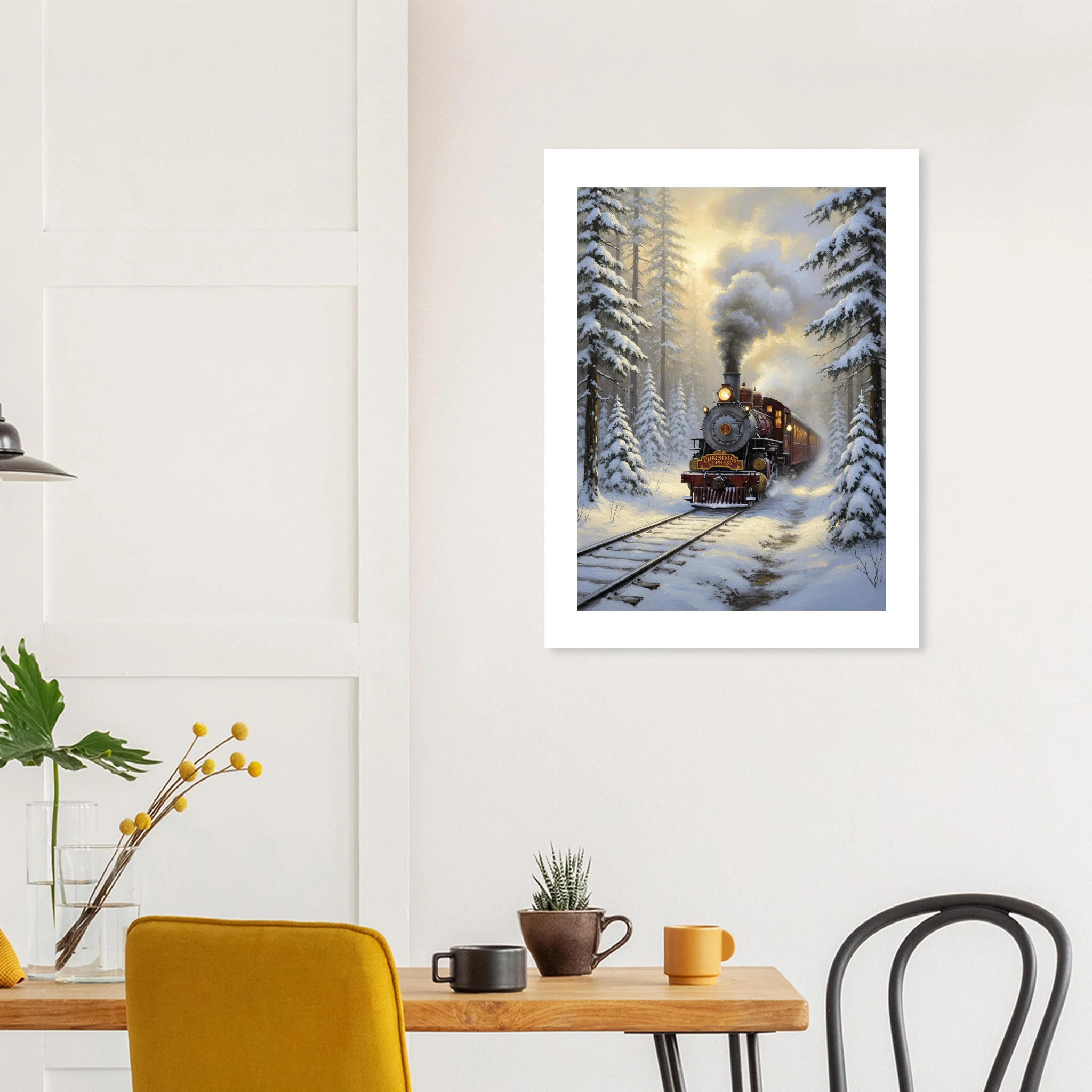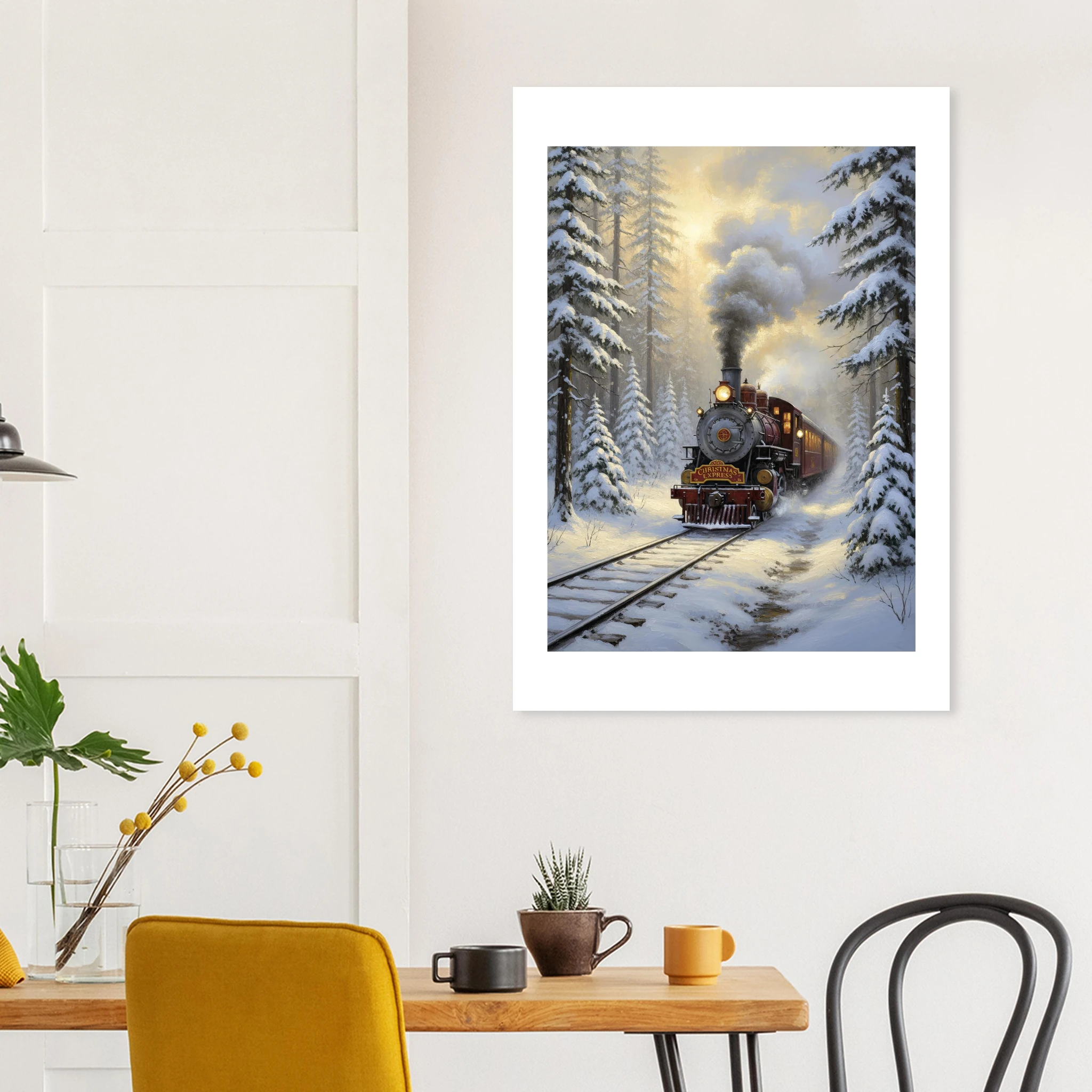Expreso de Invierno captura la magia y el silencio de un bosque cubierto de nieve mientras un tren de vapor avanza majestuoso entre los árboles. Su calidez y atmósfera nostálgica evocan los viajes clásicos y el espíritu de las navidades de antaño.