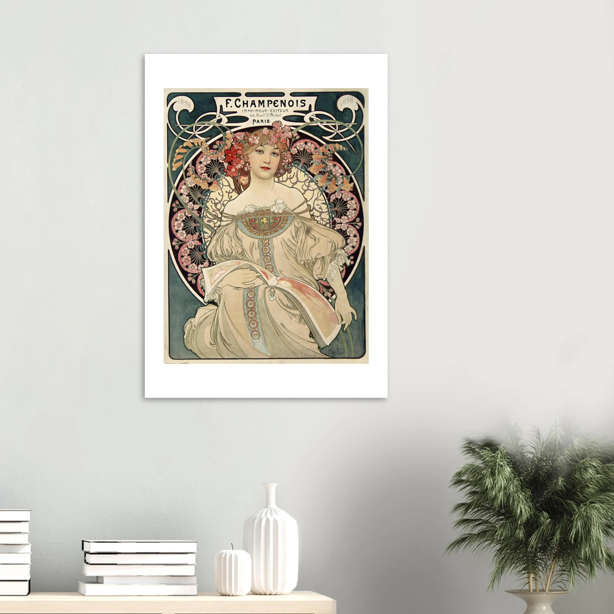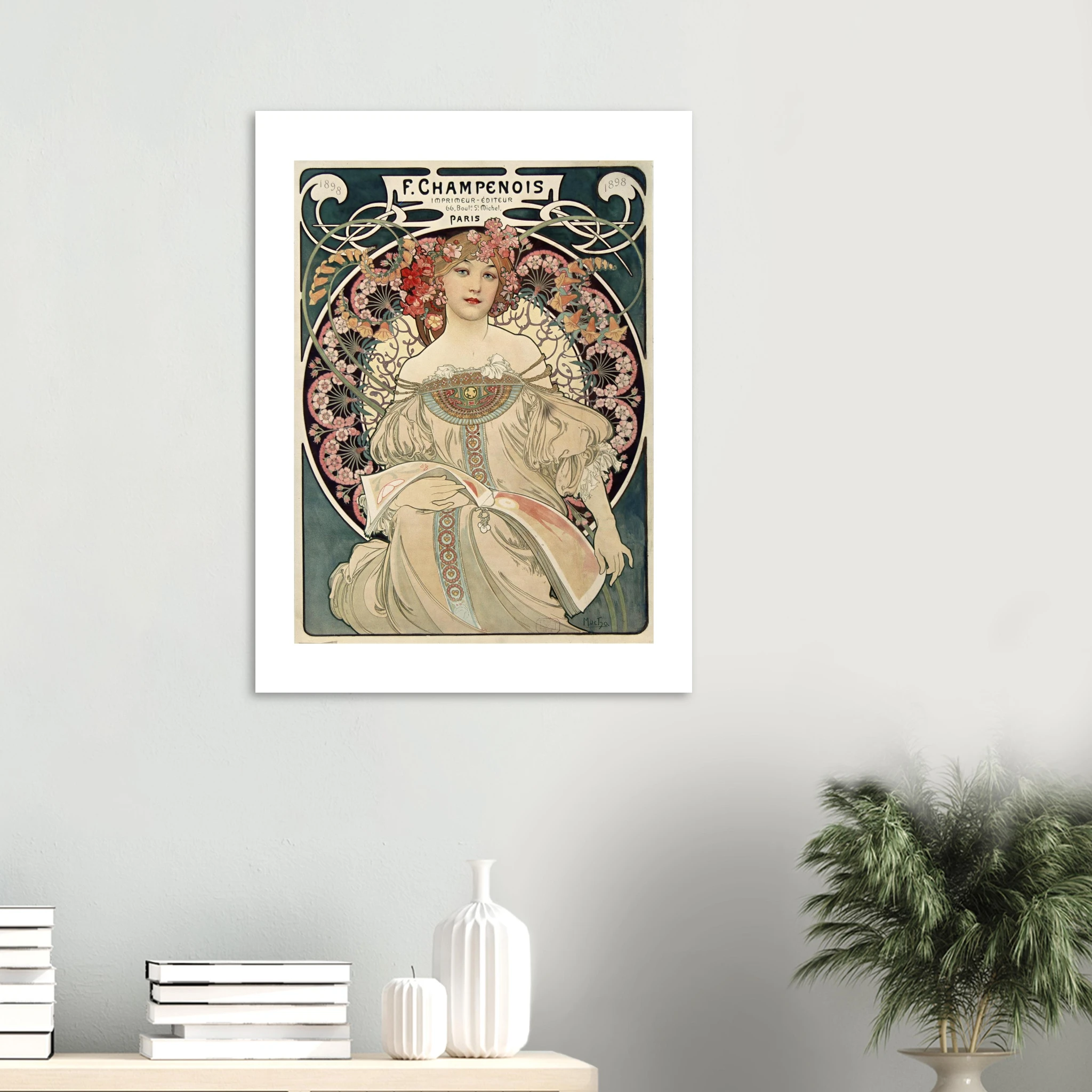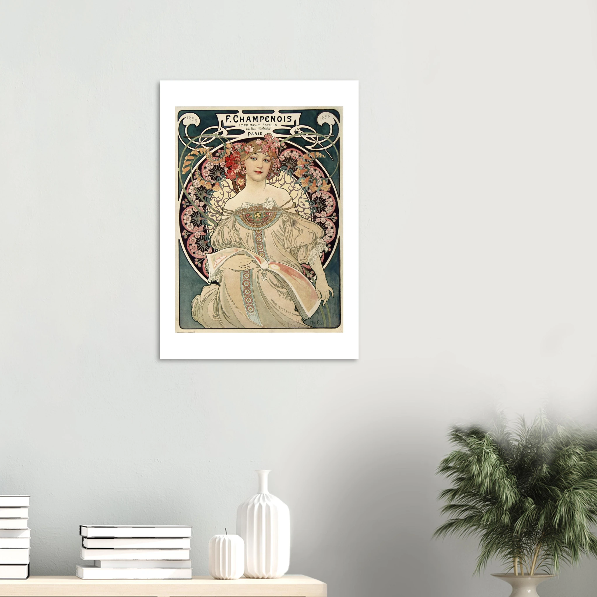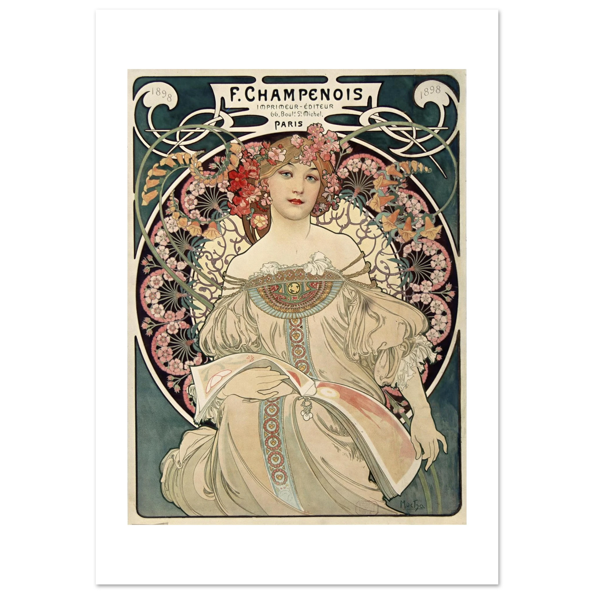 F. Champenois fue el principal editor de las obras de Mucha, y este cartel publicitario no solo promocionaba sus servicios de impresión, sino que servía como muestra del arte litográfico de máxima calidad que su establecimiento podía producir. La obra original fue impresa en técnica litográfica a múltiples colores, una innovación técnica de la época.