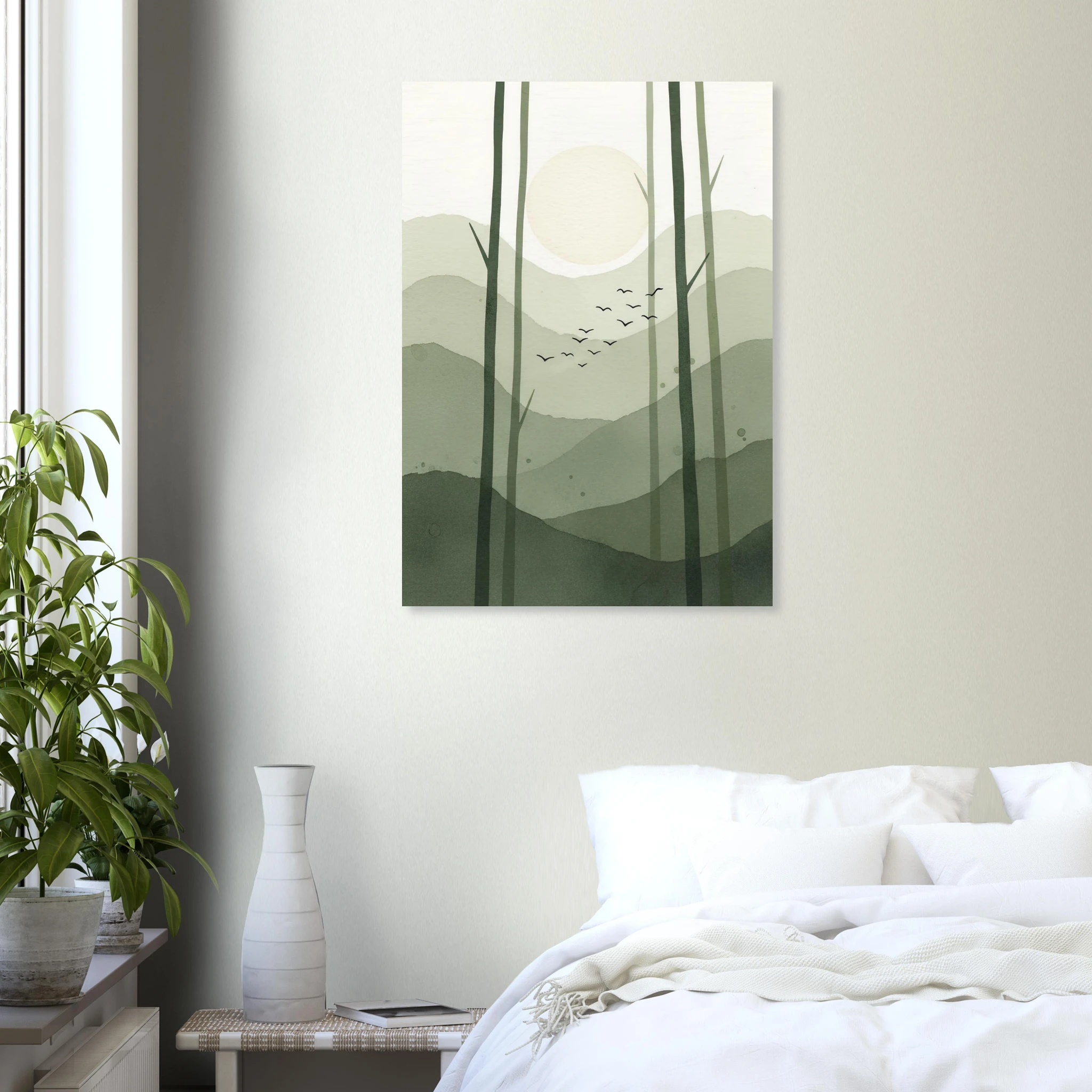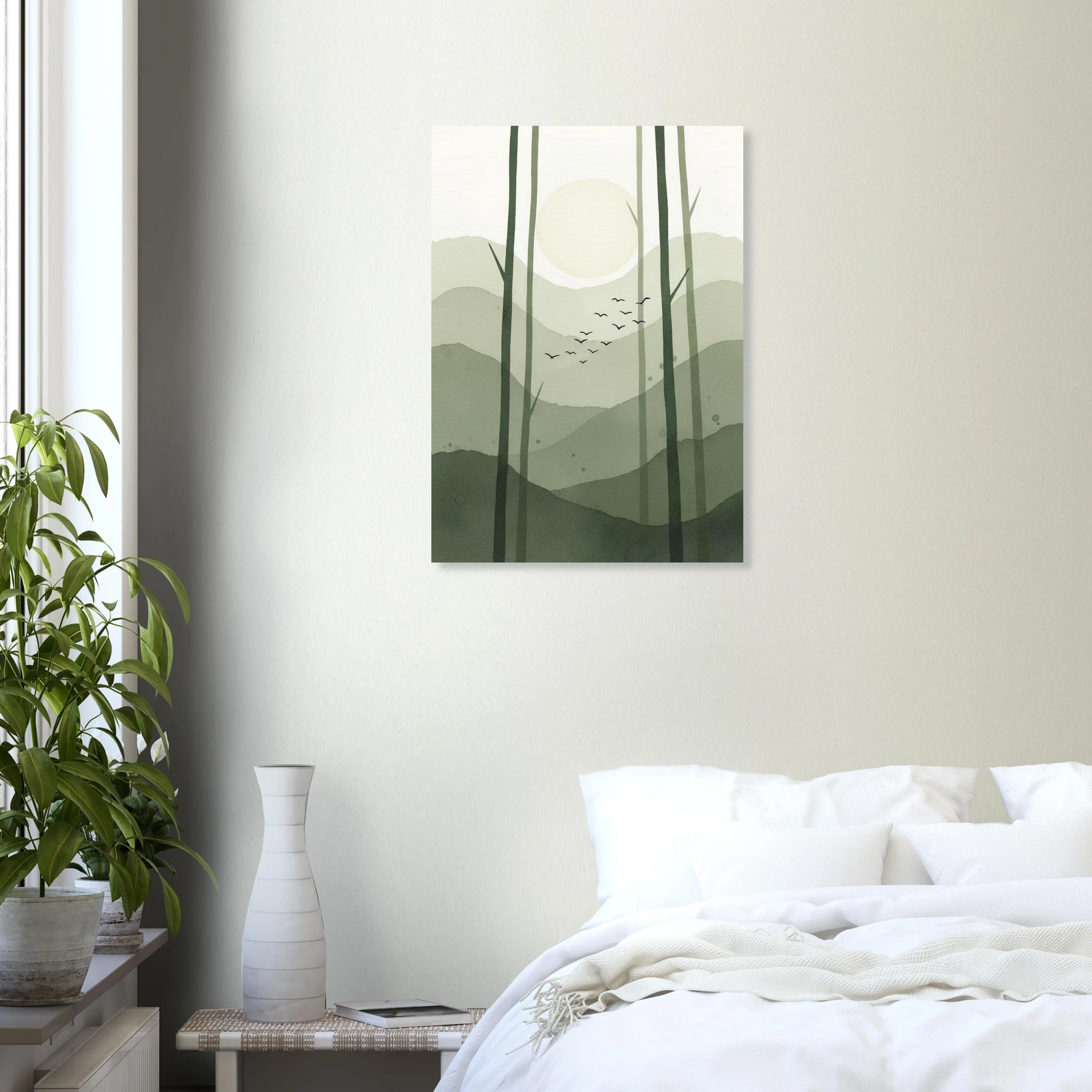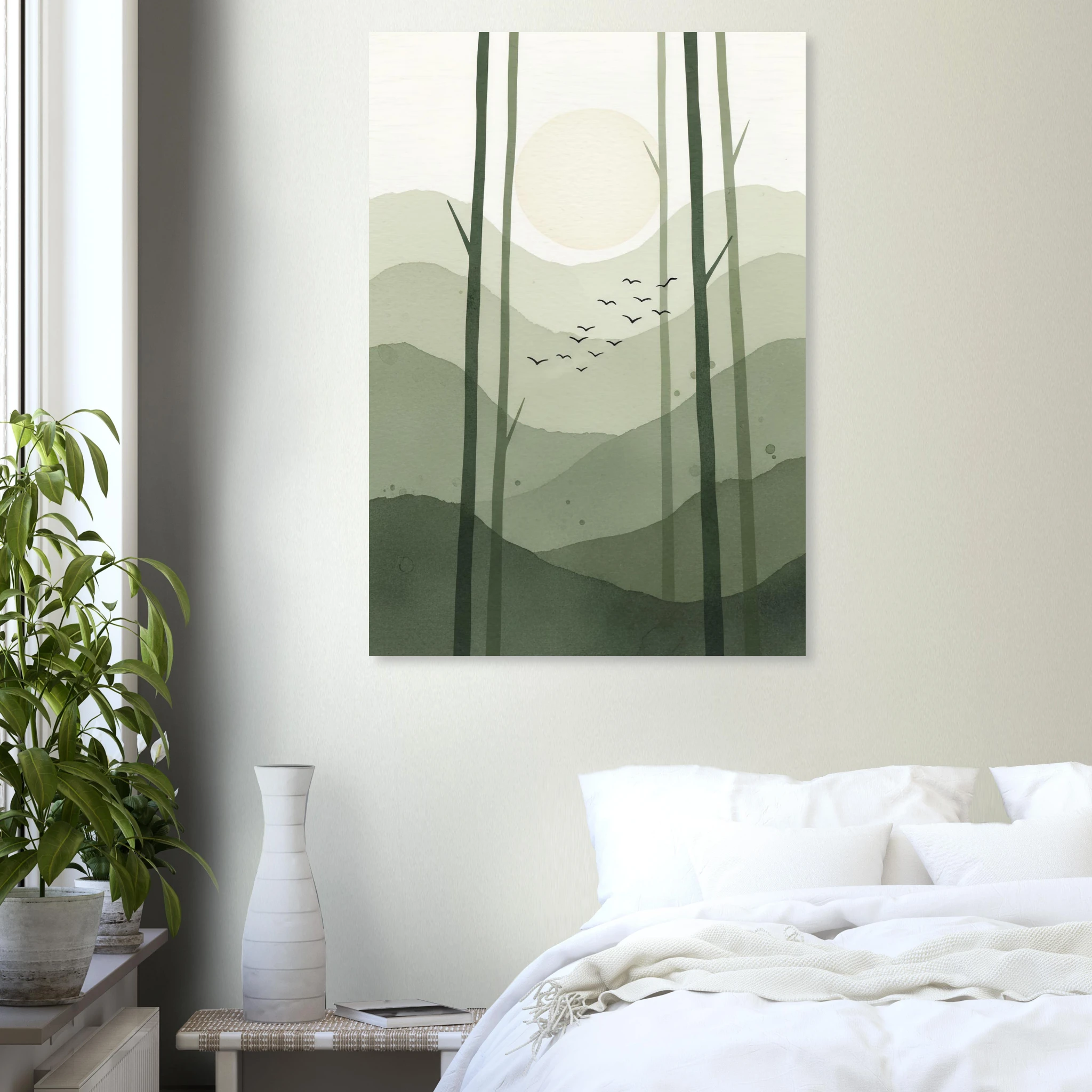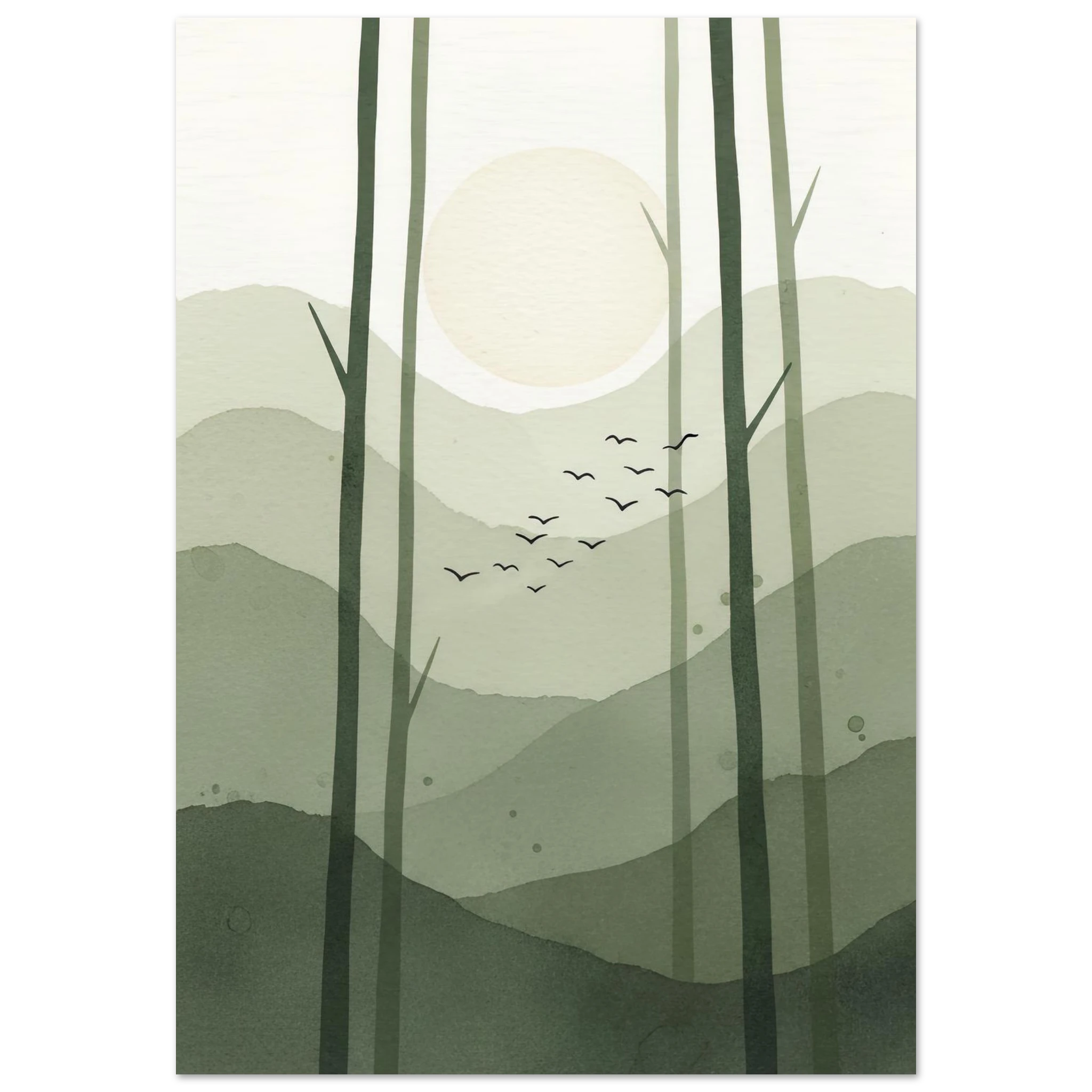 Bosque abstracto con troncos verticales en verde oliva. Luna crema entre árboles, pájaros volando. Composición vertical serena. Texturas acuarela naturales.