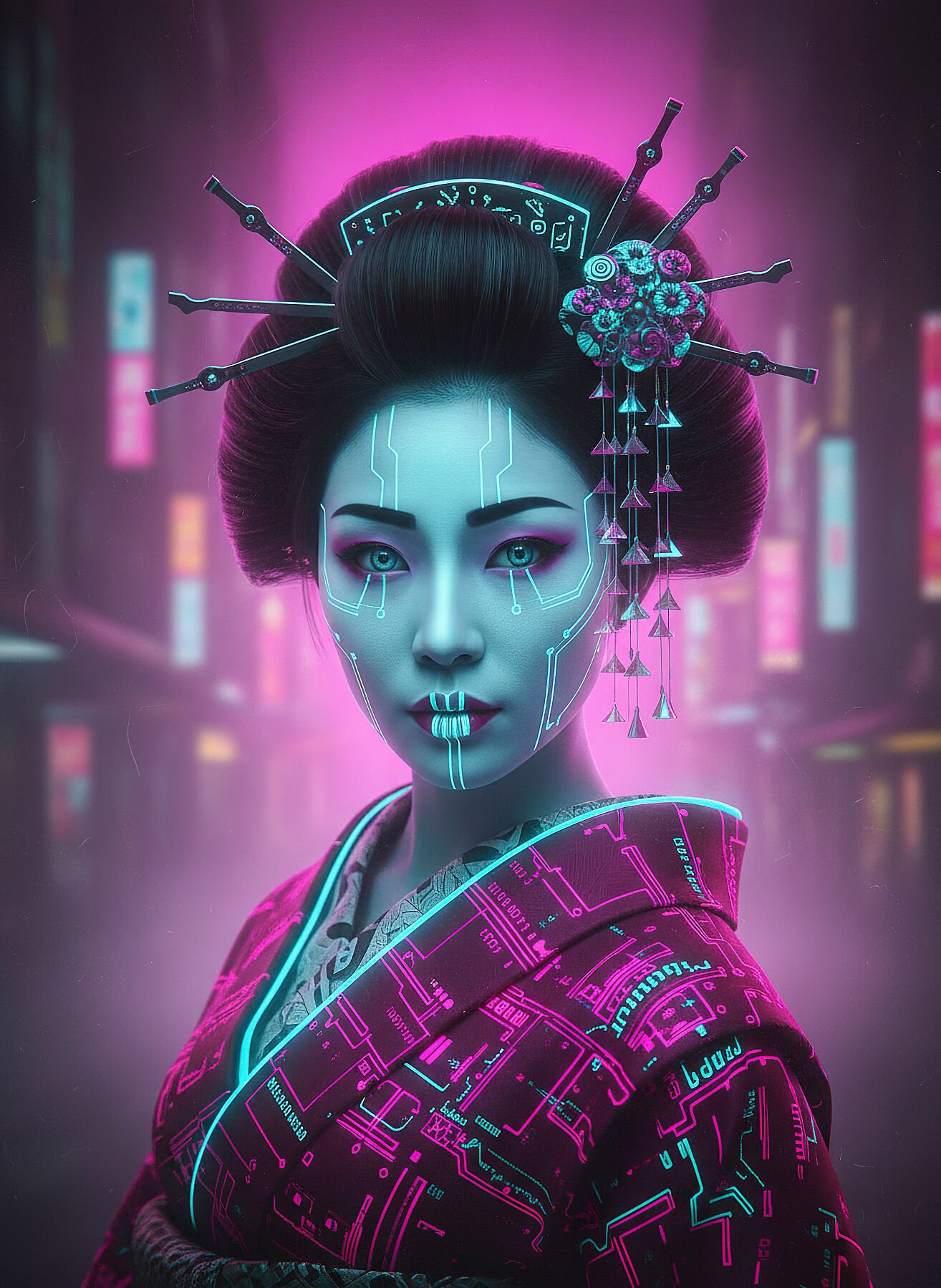 Geisha del Circuito Lunar | RetroArtHub Geisha futurista con detalles cibernéticos y luces neón. Arte elegante y sci-fi. Ideal para decoración