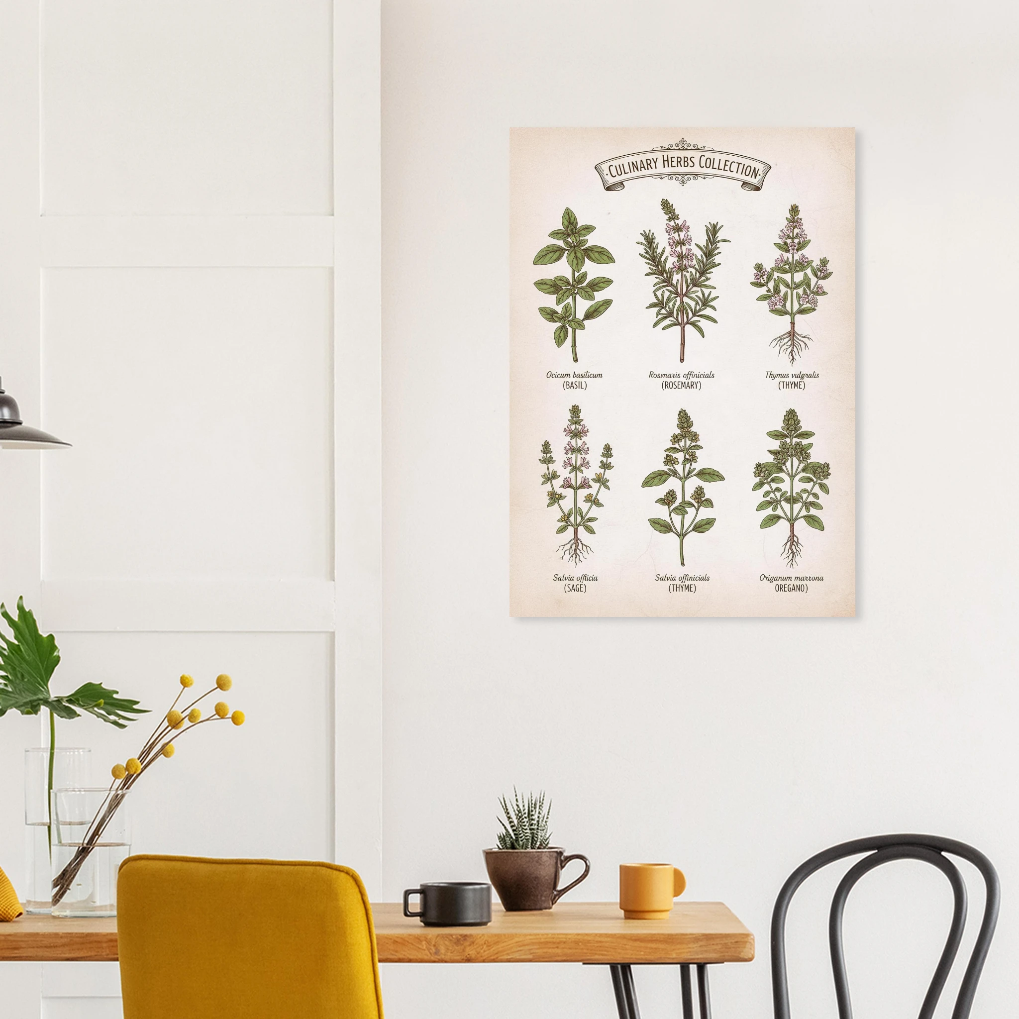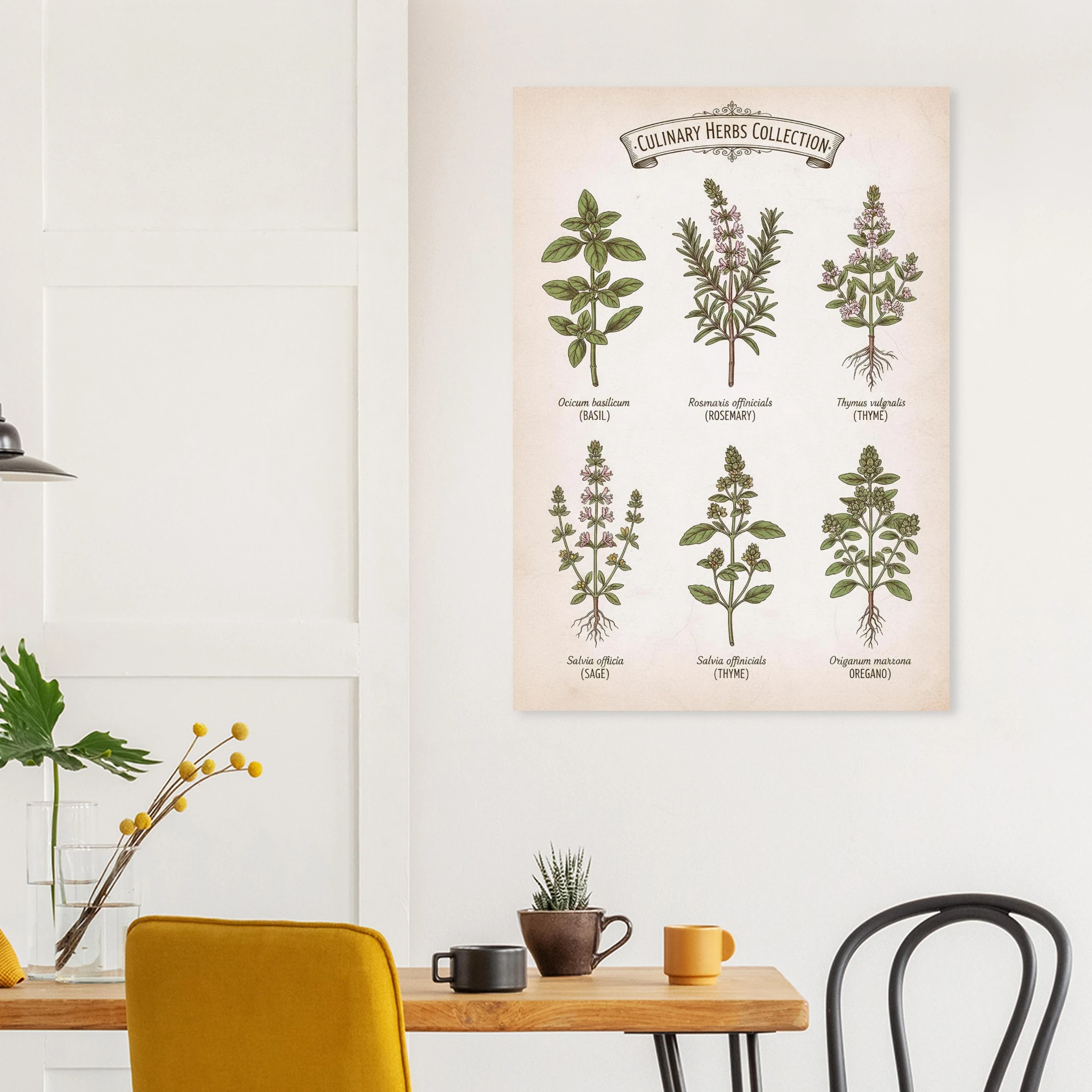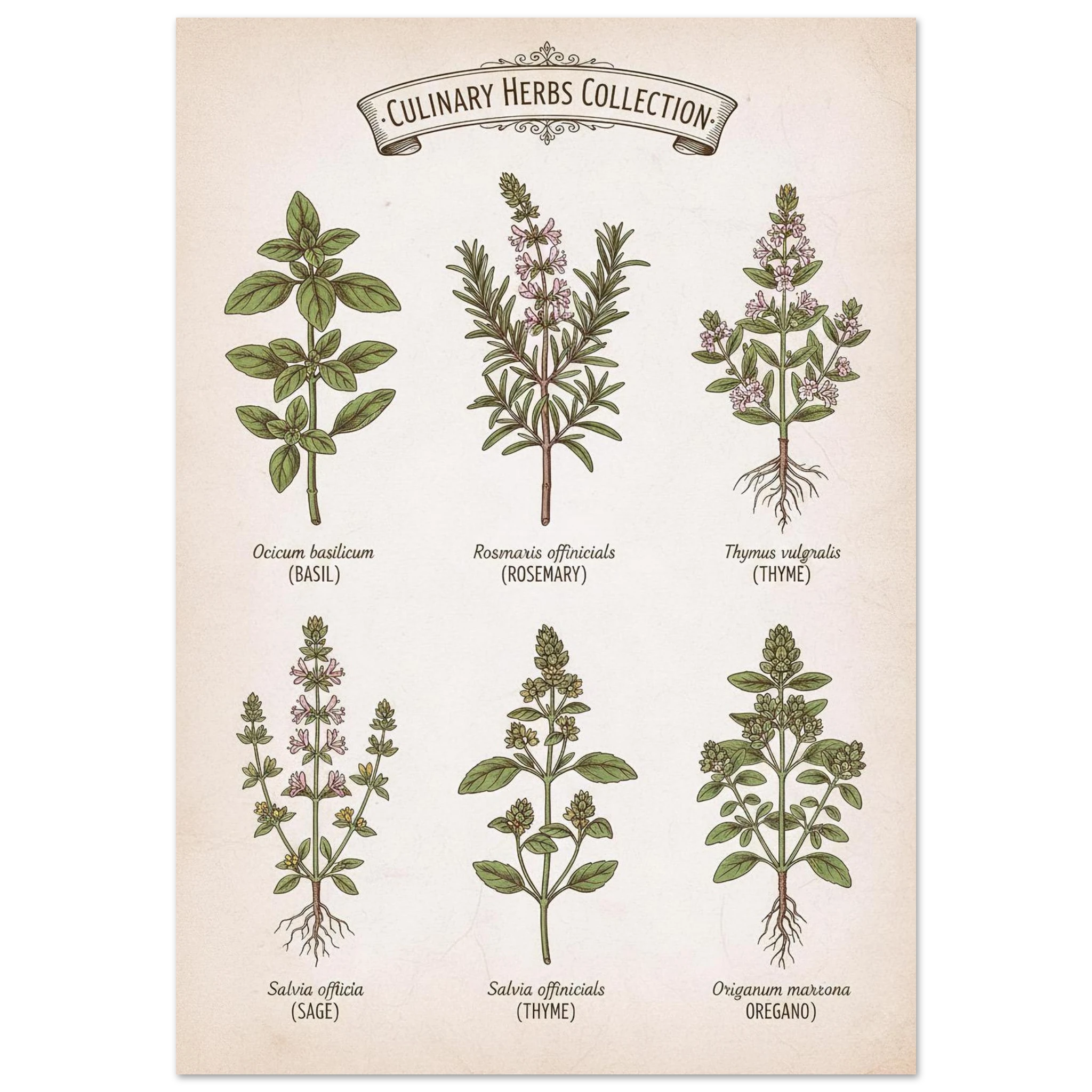 Hierbas de Cocina celebra las plantas que dan sabor a nuestra vida. Esta lámina presenta una colección de hierbas aromáticas ilustradas con precisión botánica: albahaca, romero, tomillo, salvia y orégano, cada una con su nombre en tipografía elegante.