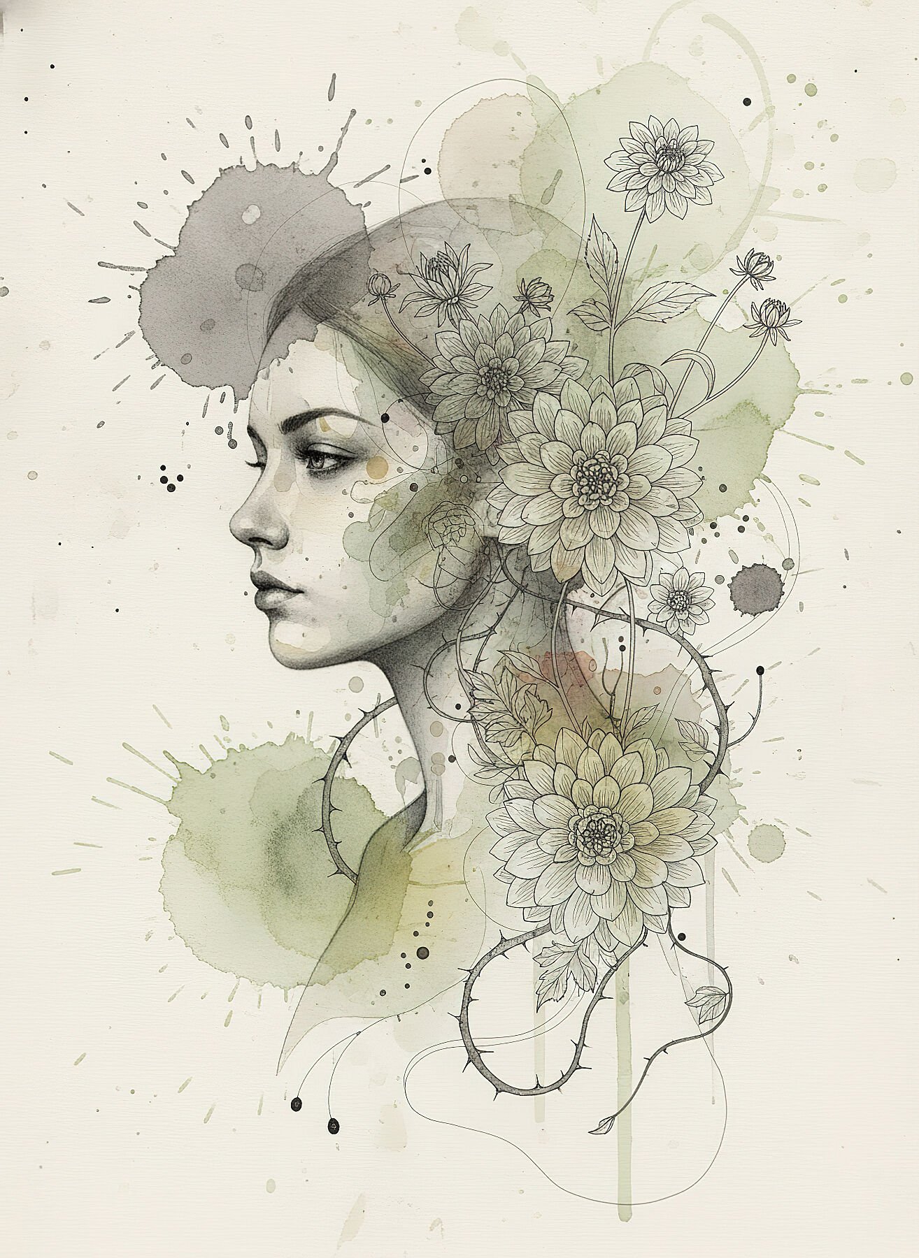 “Jardín Interior” representa la conexión íntima entre la psique femenina y el mundo natural. En esta obra, el perfil de una mujer emerge orgánicamente de un jardín caótico de dalias y flores silvestres, dibujadas con exquisito detalle en tinta china. Las aguadas de acuarela en verdes apagados y grises crean atmósferas que fluyen entre lo onírico y lo real. Las texturas de papel rasgado añaden profundidad táctil, mientras que las líneas fluidas guían la mirada a través de esta simbiosis visual. Una metáfora perfecta del crecimiento personal y la transformación interior.