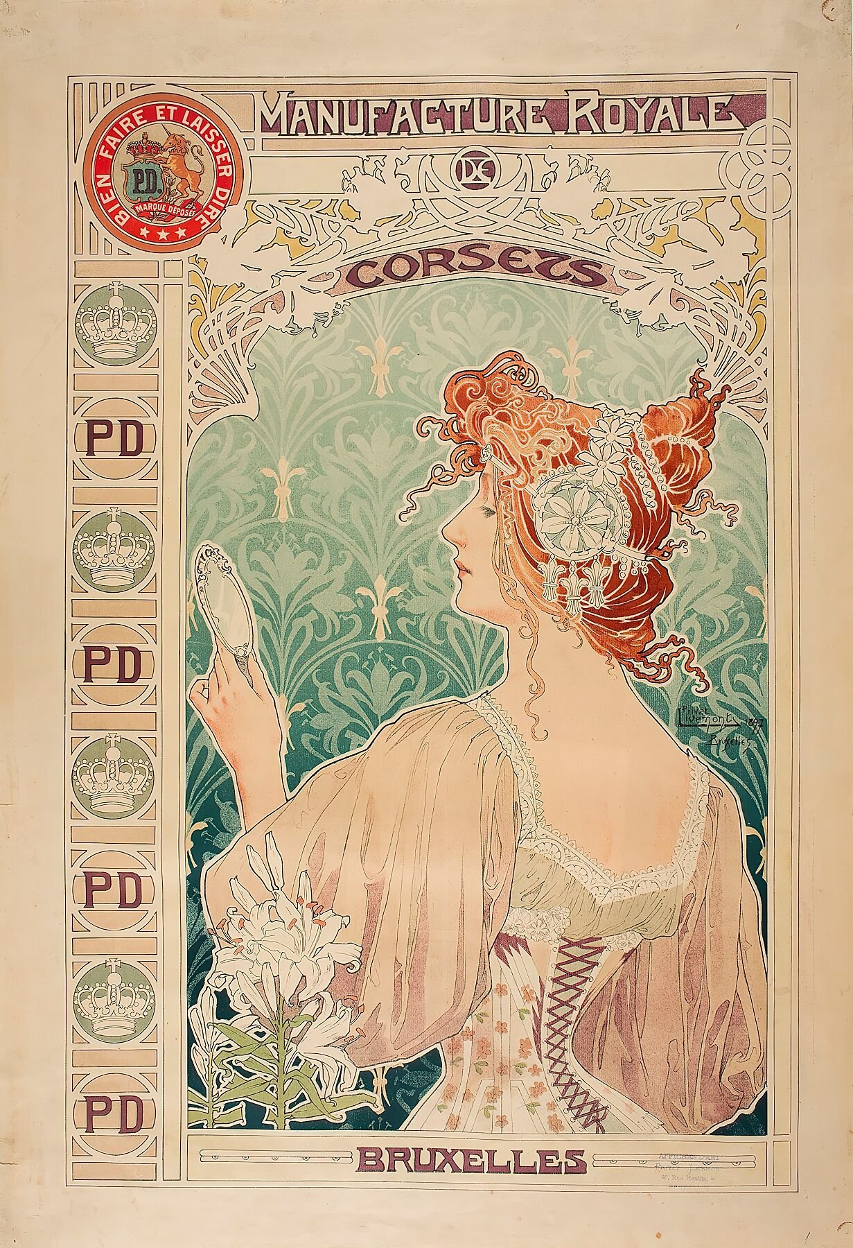 Contexto histórico: En la Belle Époque, el corsé era una prenda esencial del guardarropa femenino. Este cartel de Mucha ayudó a posicionar la marca como símbolo de elegancia parisina, demostrando el poder del Art Nouveau para transformar la percepción de productos cotidianos.