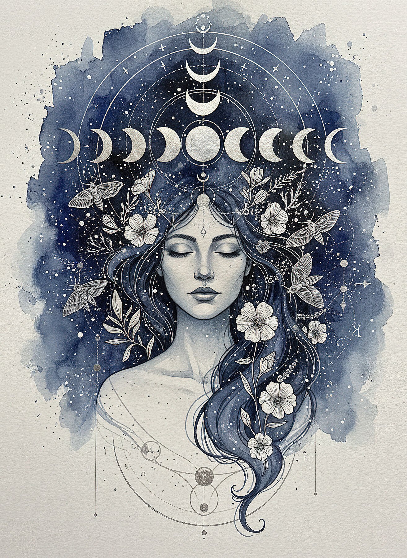 “Metamorfosis Lunar” honra la conexión ancestral entre los ciclos femeninos y las fases de la luna. En esta obra, el rostro de la mujer se integra con lunas crecientes que adornan su cabello y hombros, mientras polillas delicadamente dibujadas vuelan entre flores nocturnas como damas de noche y moonflowers. Las capas translúcidas de acuarela en índigo y azul medianoche crean una atmósfera de misterio nocturno, mientras que los efectos iridiscentes y los acentos plateados capturan la luz lunar. Las salpicaduras de tinta blanca evocan estrellas en el cielo nocturno. Los símbolos de calendario lunar sutilmente integrados hablan de ciclos, renovación y el poder transformador de la noche. Una pieza para conectar con la energía lunar y lo femenino sagrado.