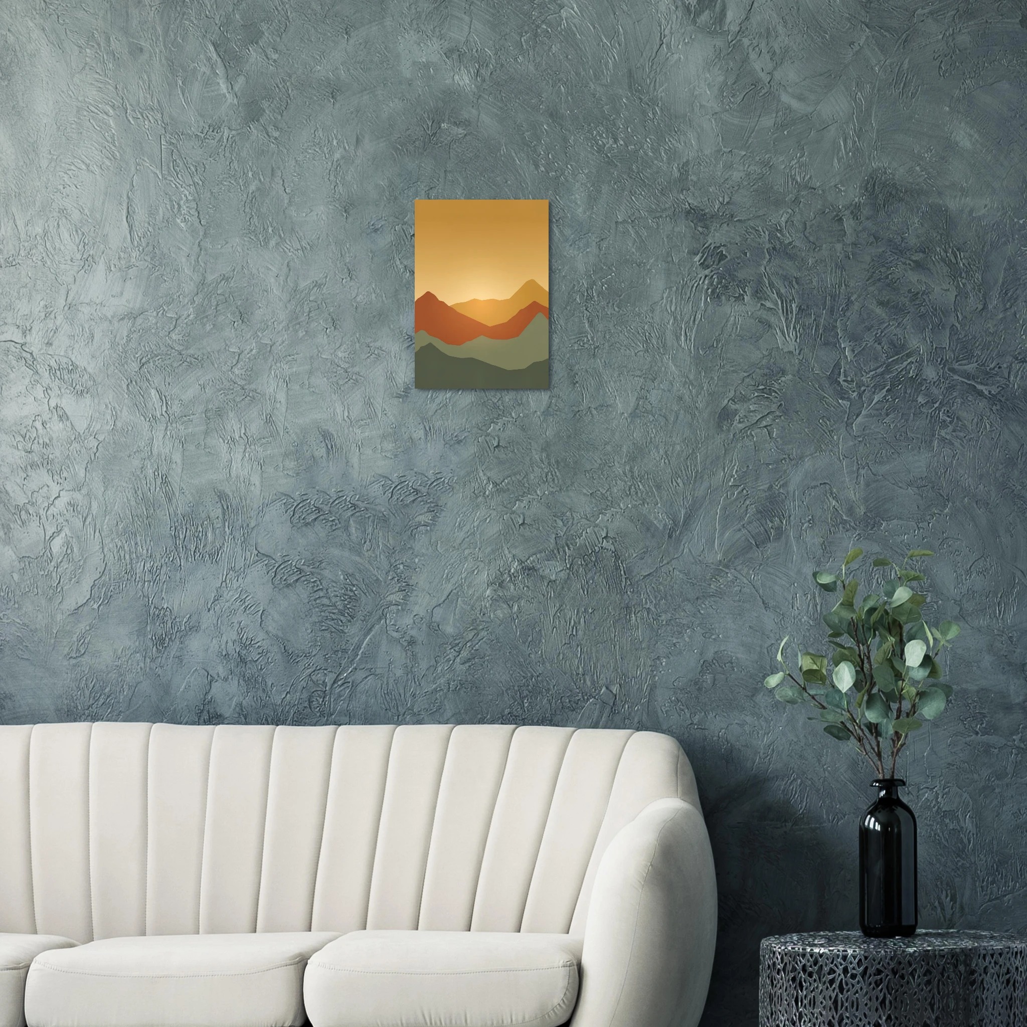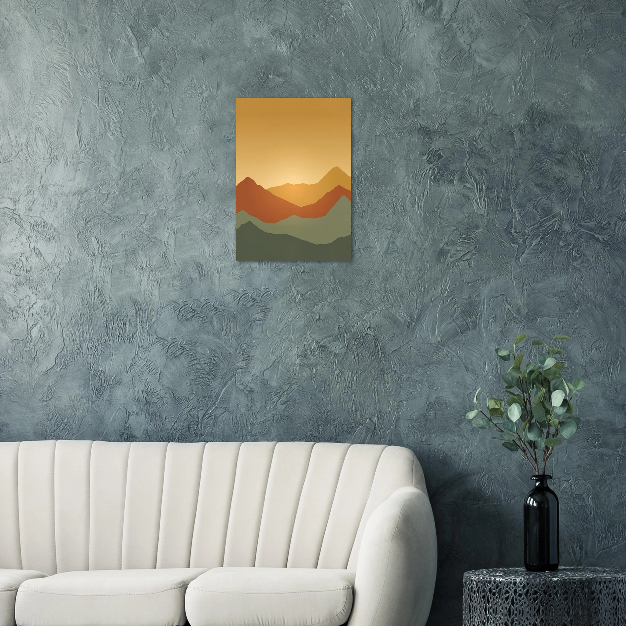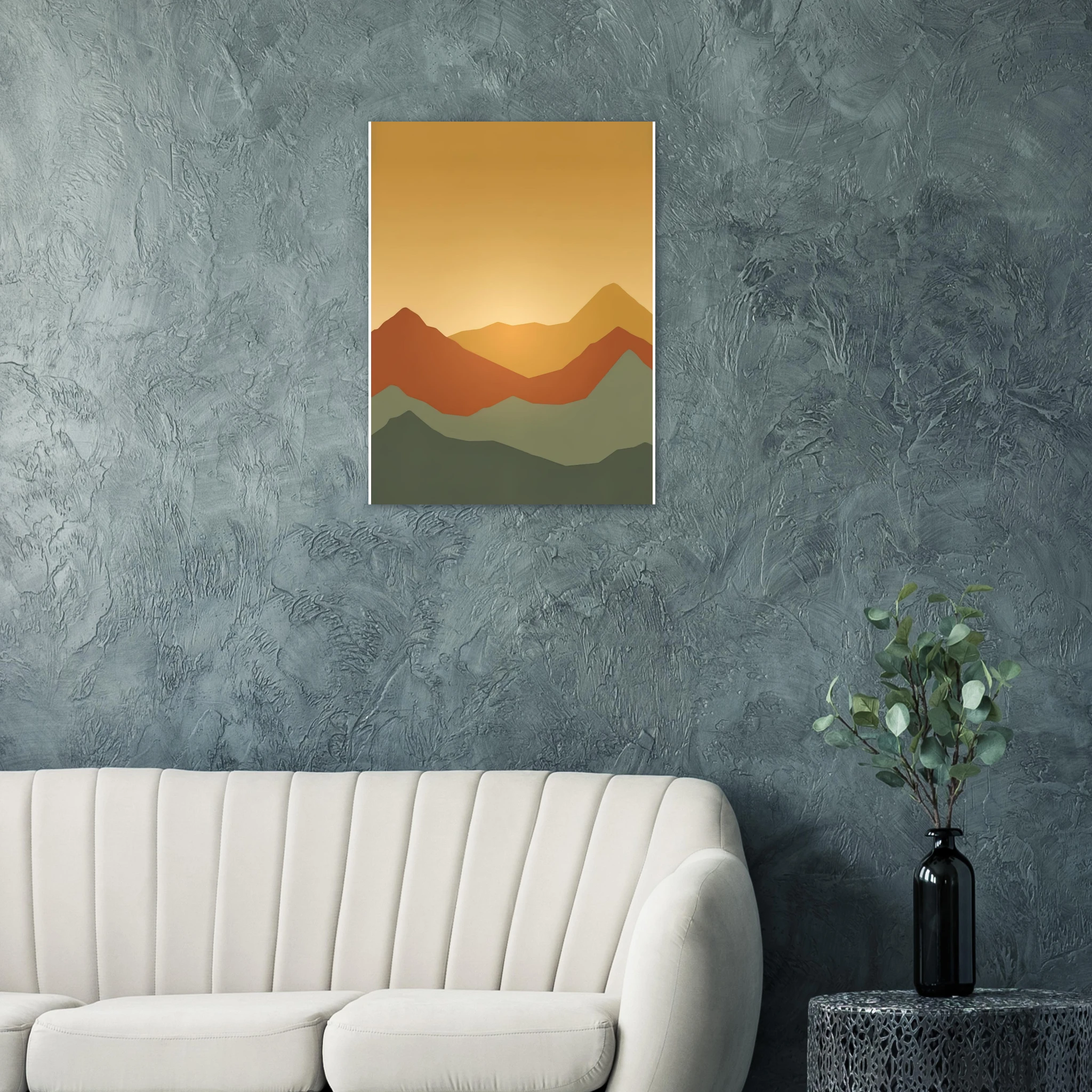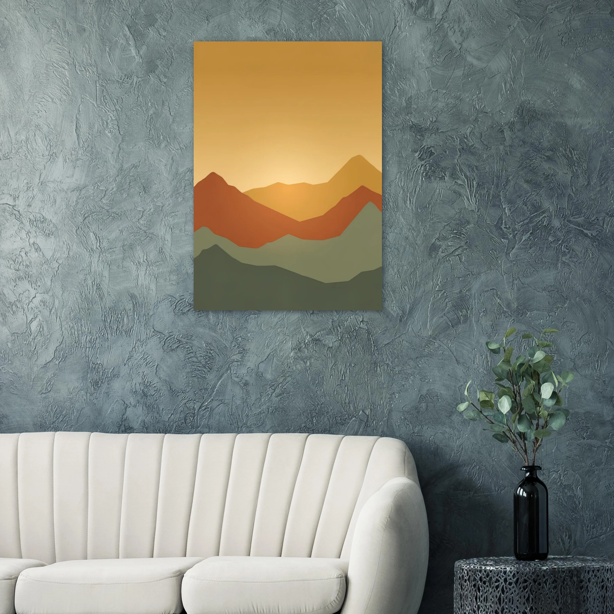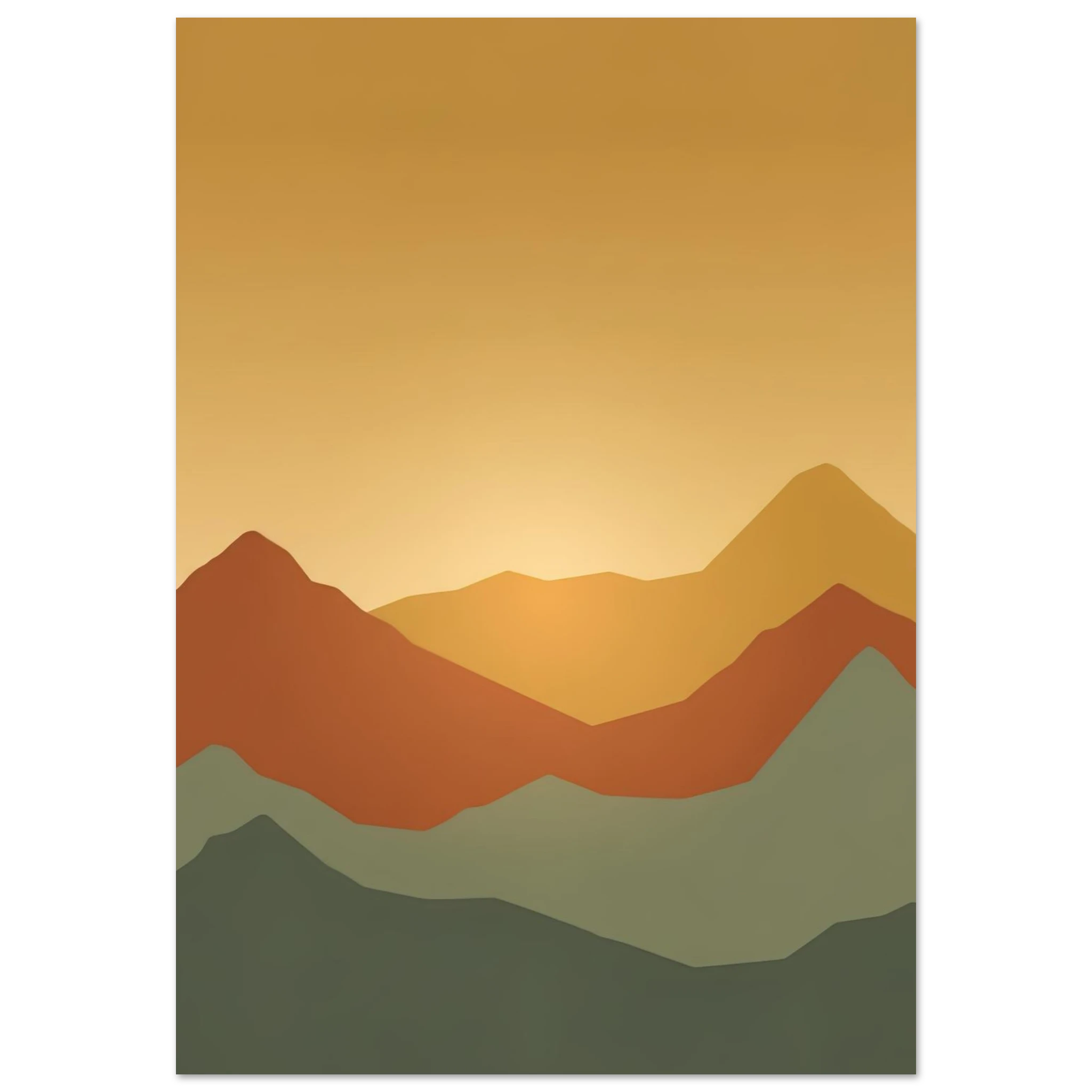 Montañas Doradas captura ese momento mágico cuando el sol poniente baña las montañas en tonos dorados. Picos estilizados se superponen en capas creando profundidad, mientras el gradiente cálido evoca la serenidad de contemplar el atardecer desde las alturas.