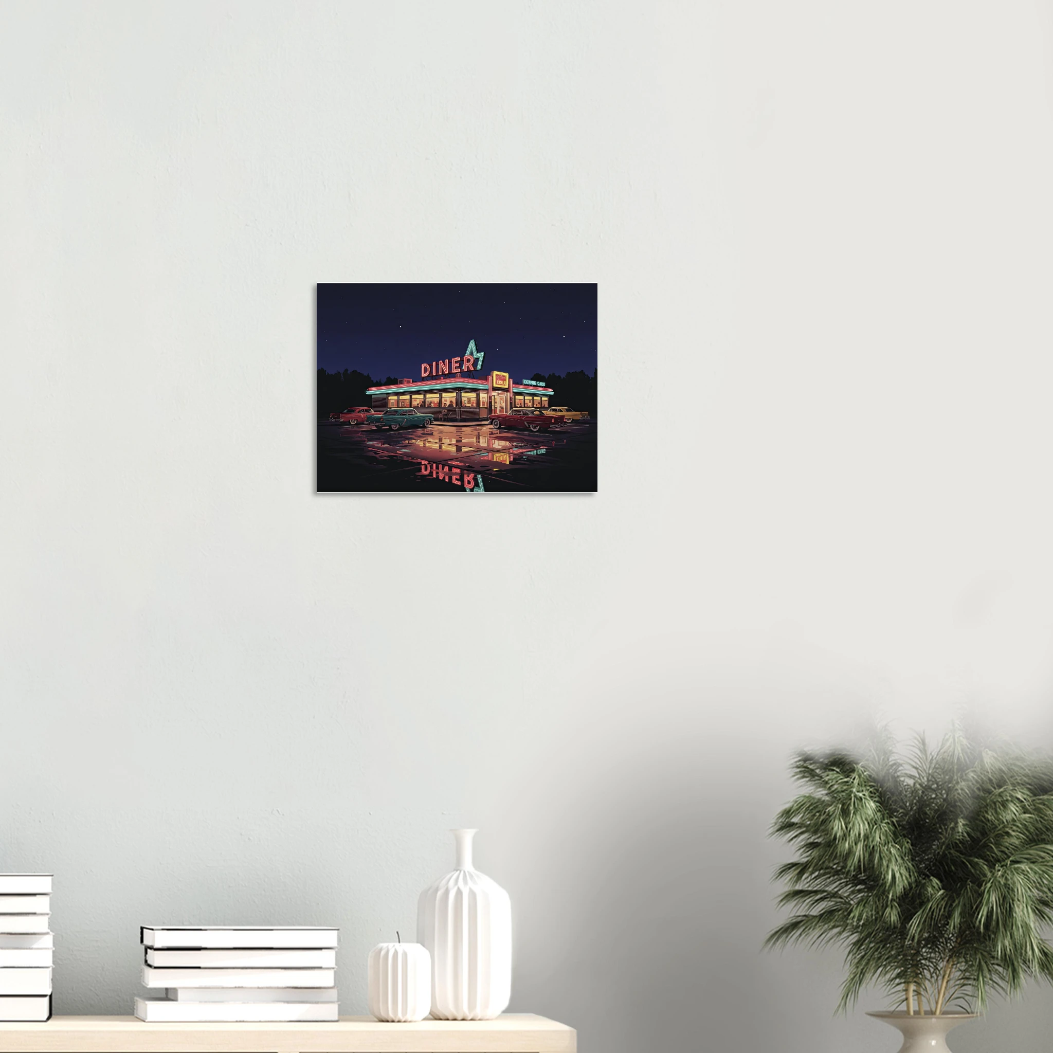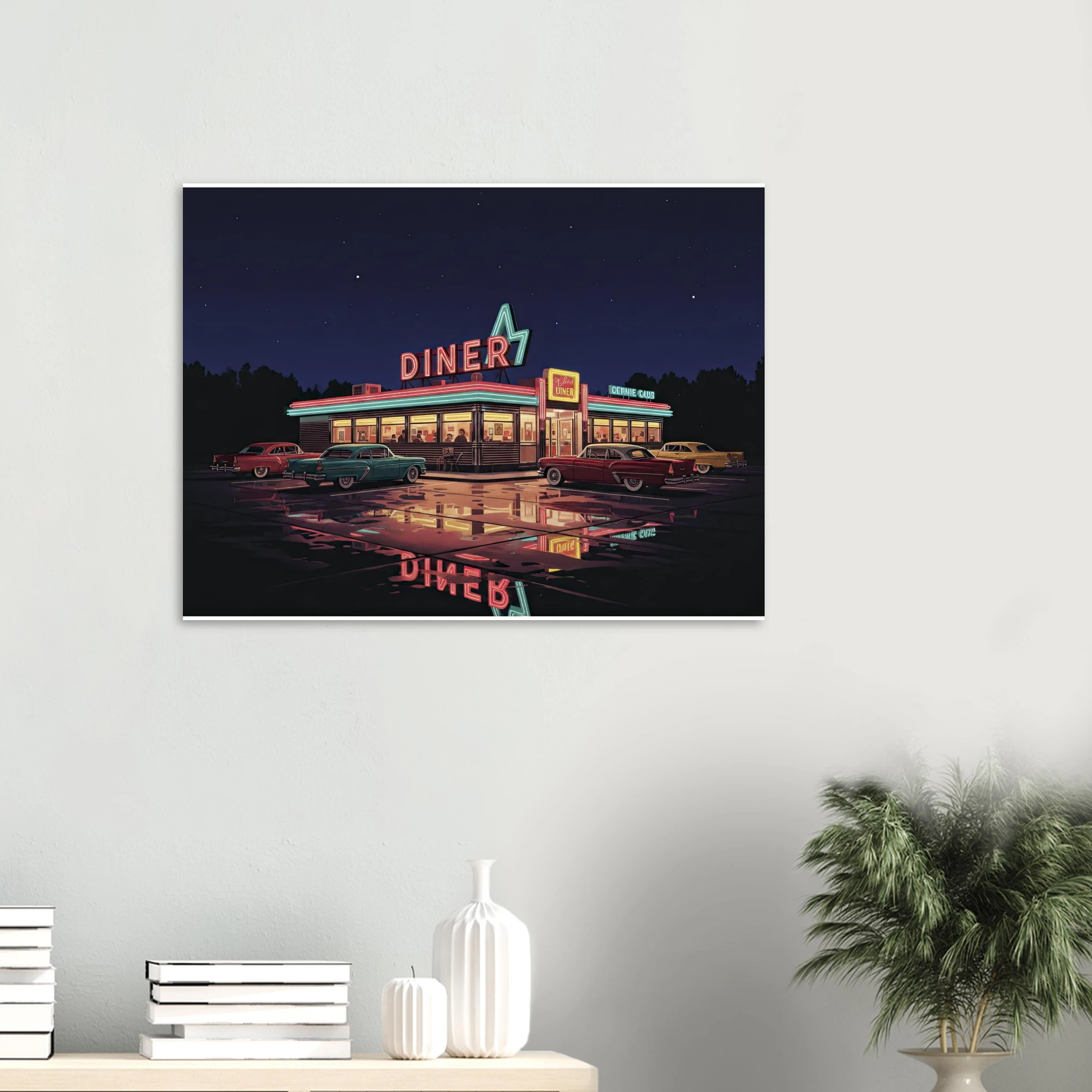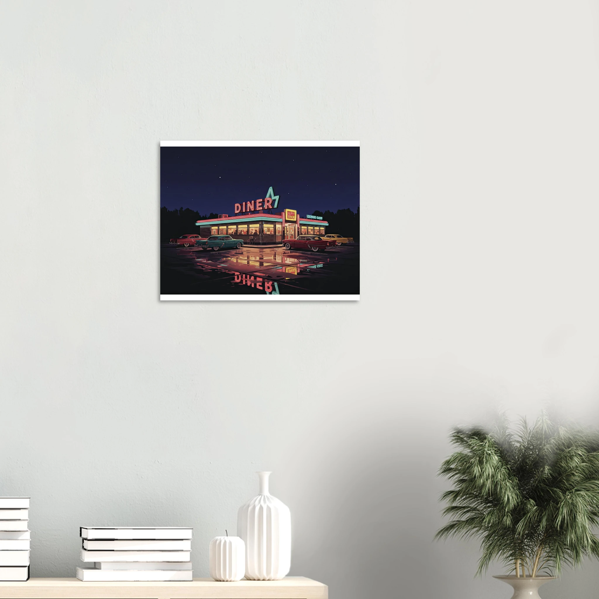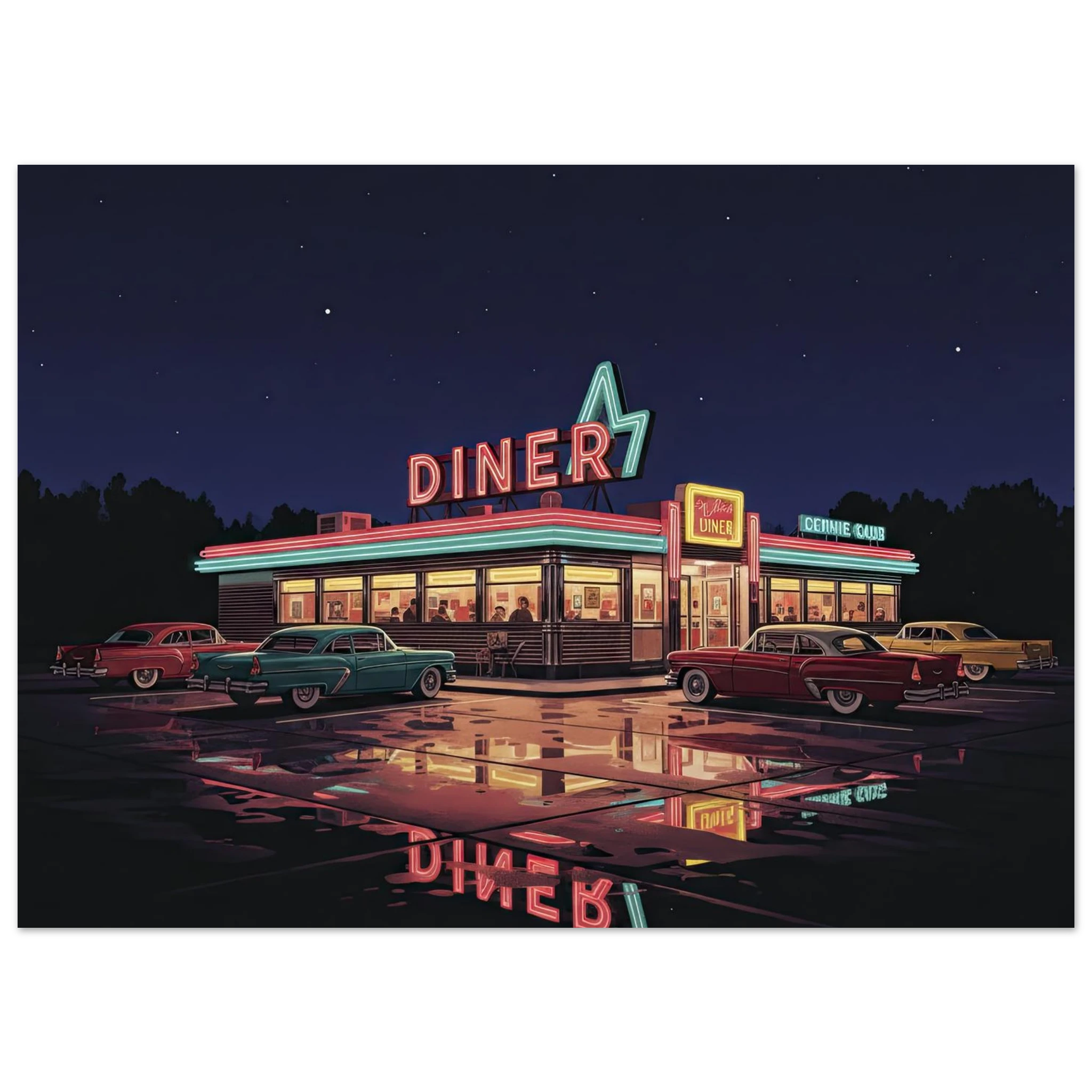 Este poster forma parte de nuestra colección de ilustraciones que celebran la cultura automovilística americana clásica. Desde muscle cars hasta diners neon, cada pieza captura un aspecto de la golden age del automóvil USA.