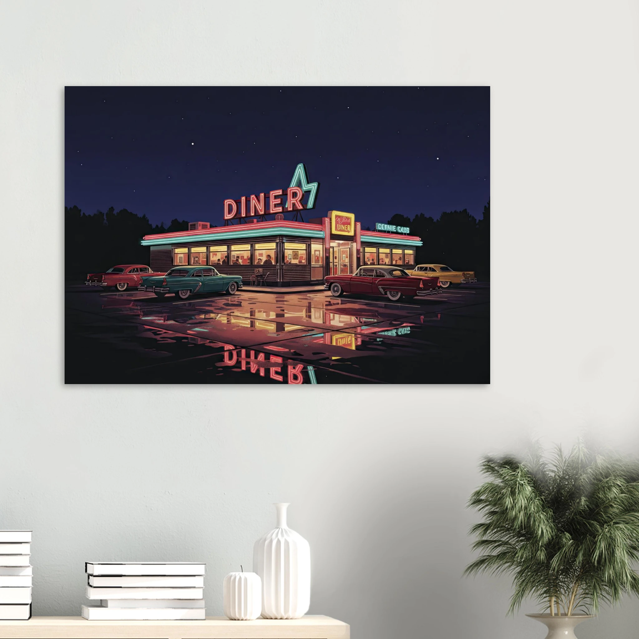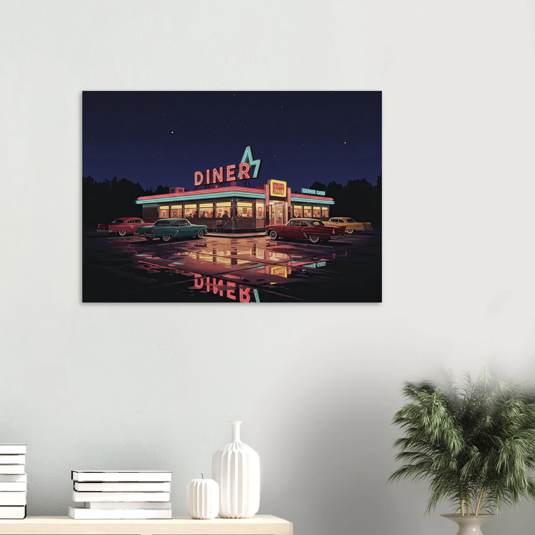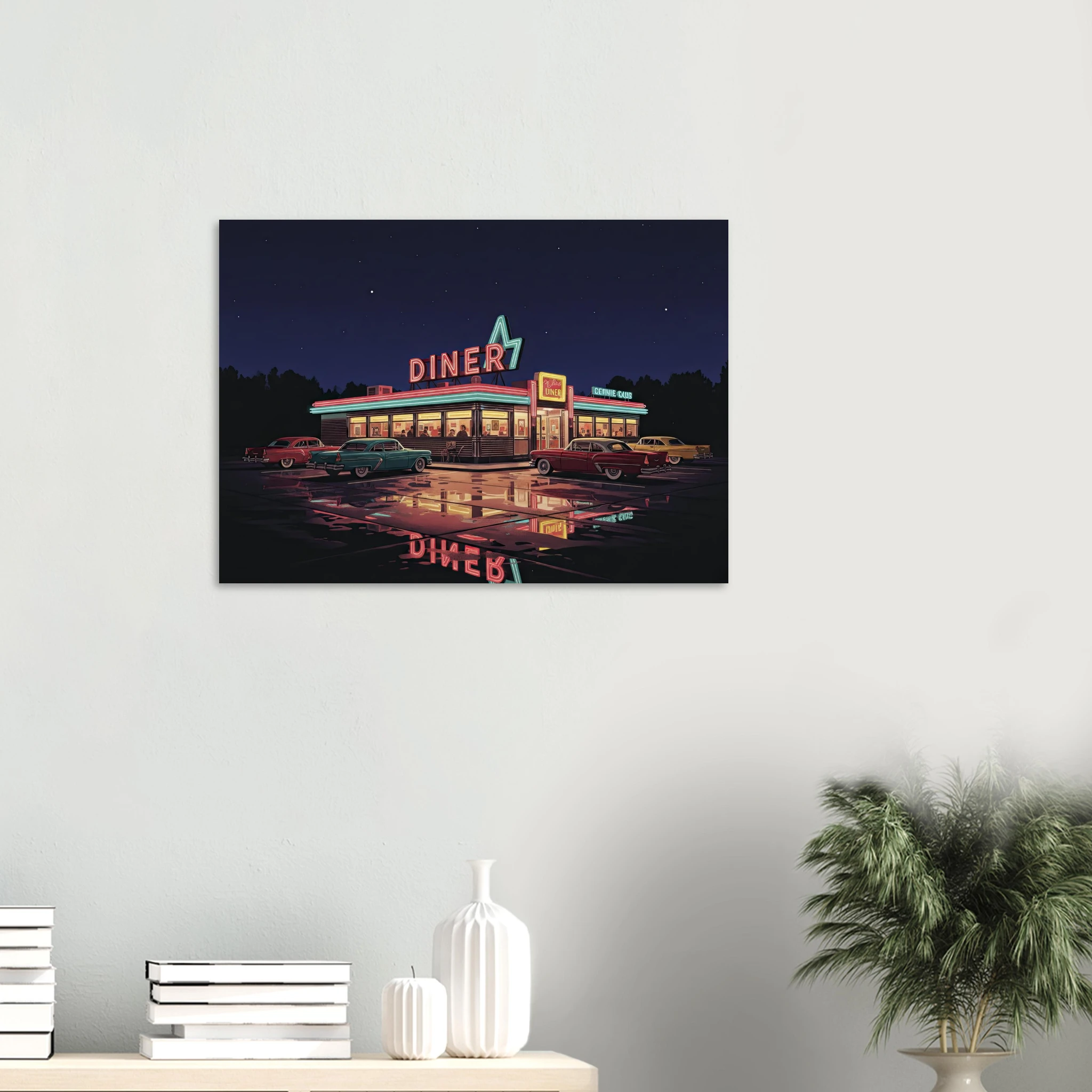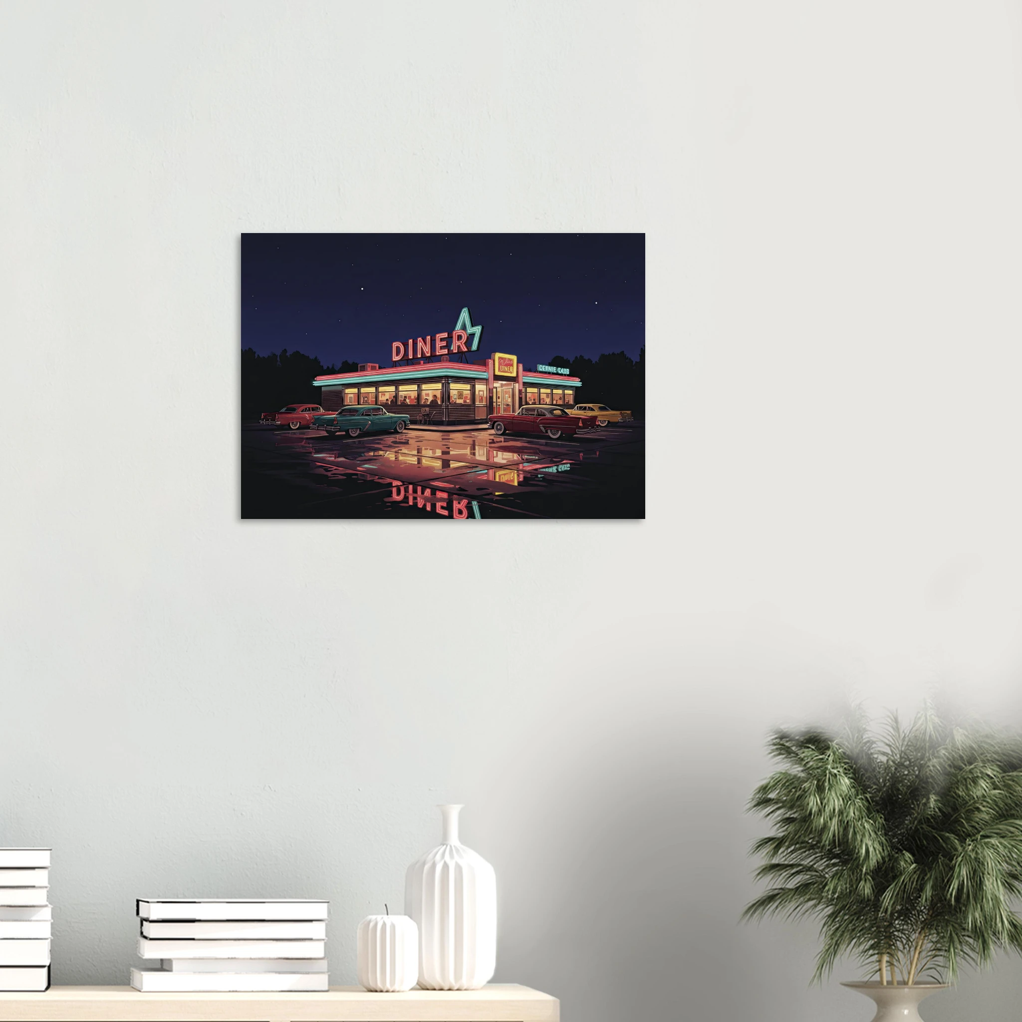 Este poster forma parte de nuestra colección de ilustraciones que celebran la cultura automovilística americana clásica. Desde muscle cars hasta diners neon, cada pieza captura un aspecto de la golden age del automóvil USA.
