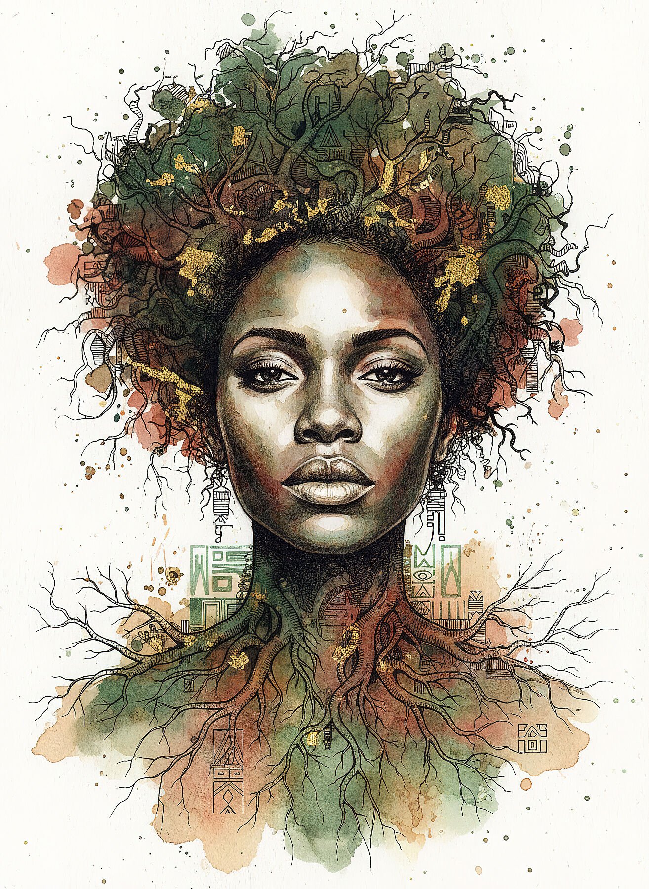 “Raíces Profundas” es una celebración visual de la conexión ancestral y el poder femenino afrodescendiente. En esta obra, el cabello natural de la mujer se metamorfosea en un intrincado sistema de raíces que profundizan en la tierra, simbolizando la conexión inquebrantable con los ancestros y la madre tierra. Los dibujos botánicos detallados de raíces subterráneas se combinan con texturas de papel envejecido con café, creando una pátina que habla del paso del tiempo y la permanencia. Los patrones geométricos abstractos evocan símbolos antiguos africanos, mientras que los acentos en pan de oro añaden un elemento de sacralidad y realeza. Una pieza que honra la herencia, la fuerza y la belleza natural.