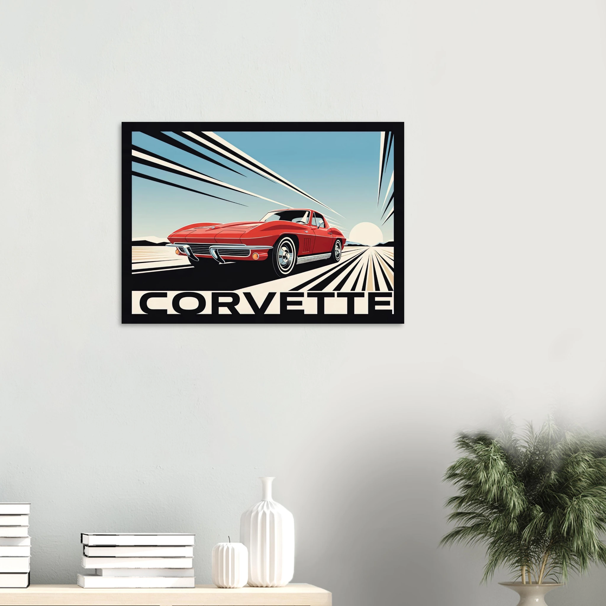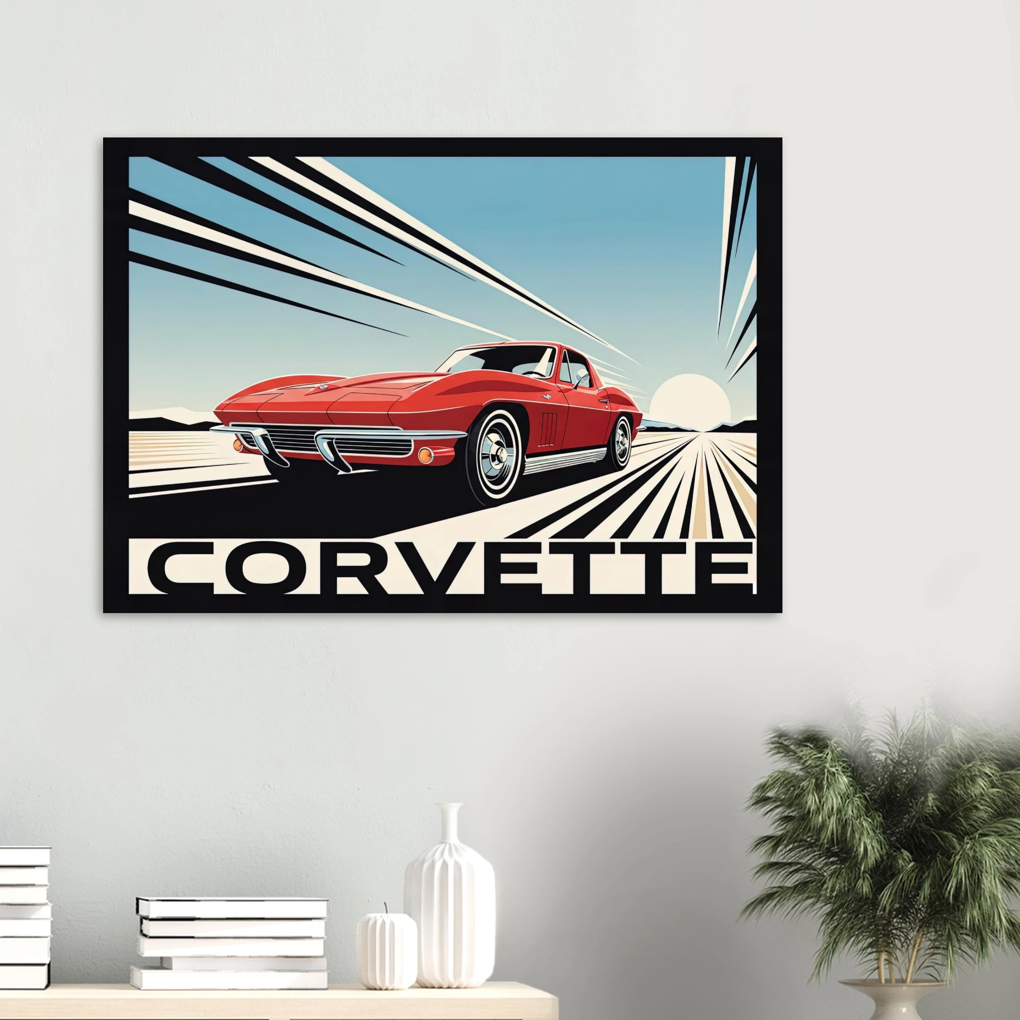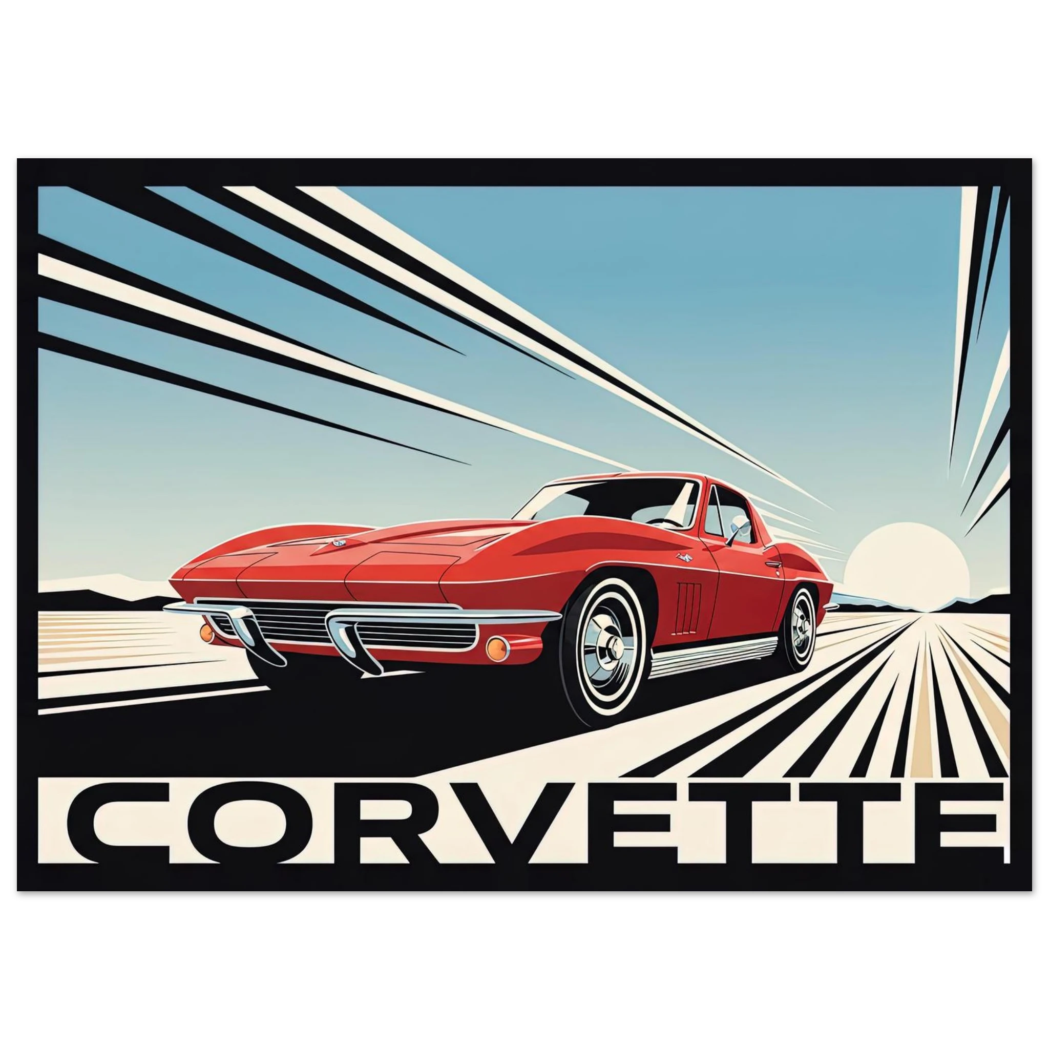 Corvette Stingray rojo en carretera del desierto, perspectiva dramática baja. Chromes brillantes, horizonte infinito. Deportivo americano icónico años 60.
