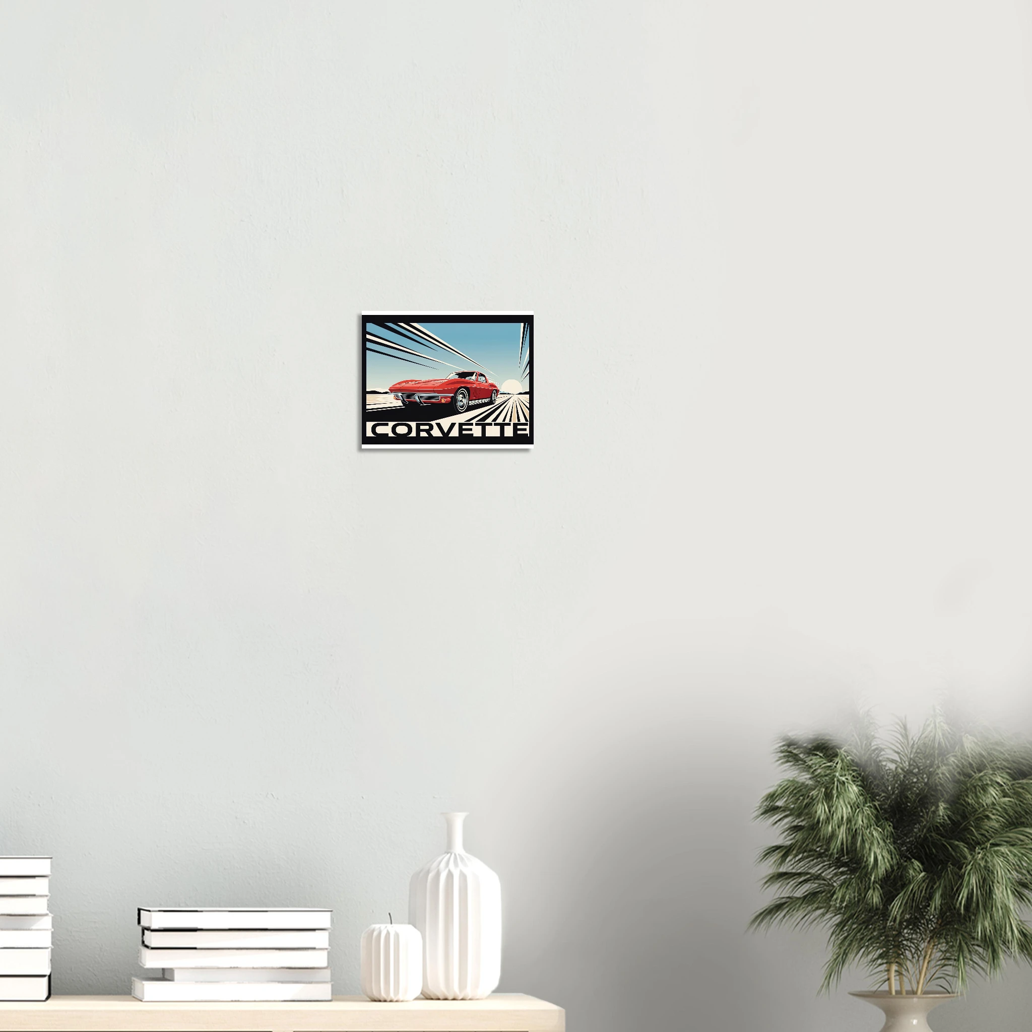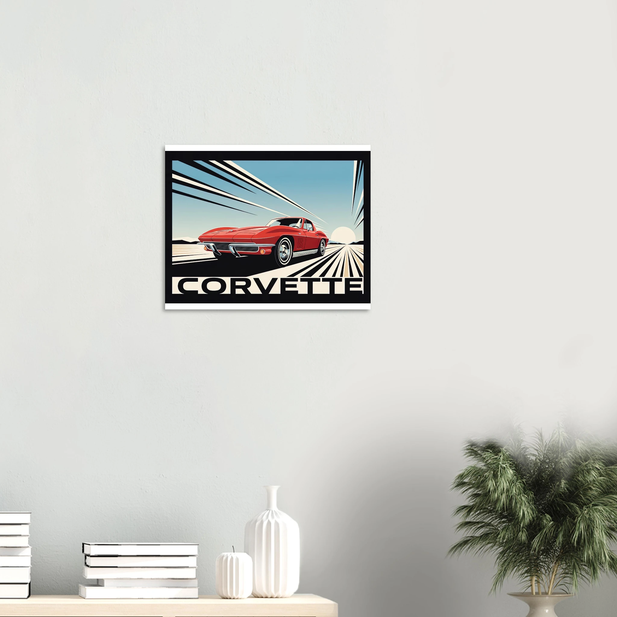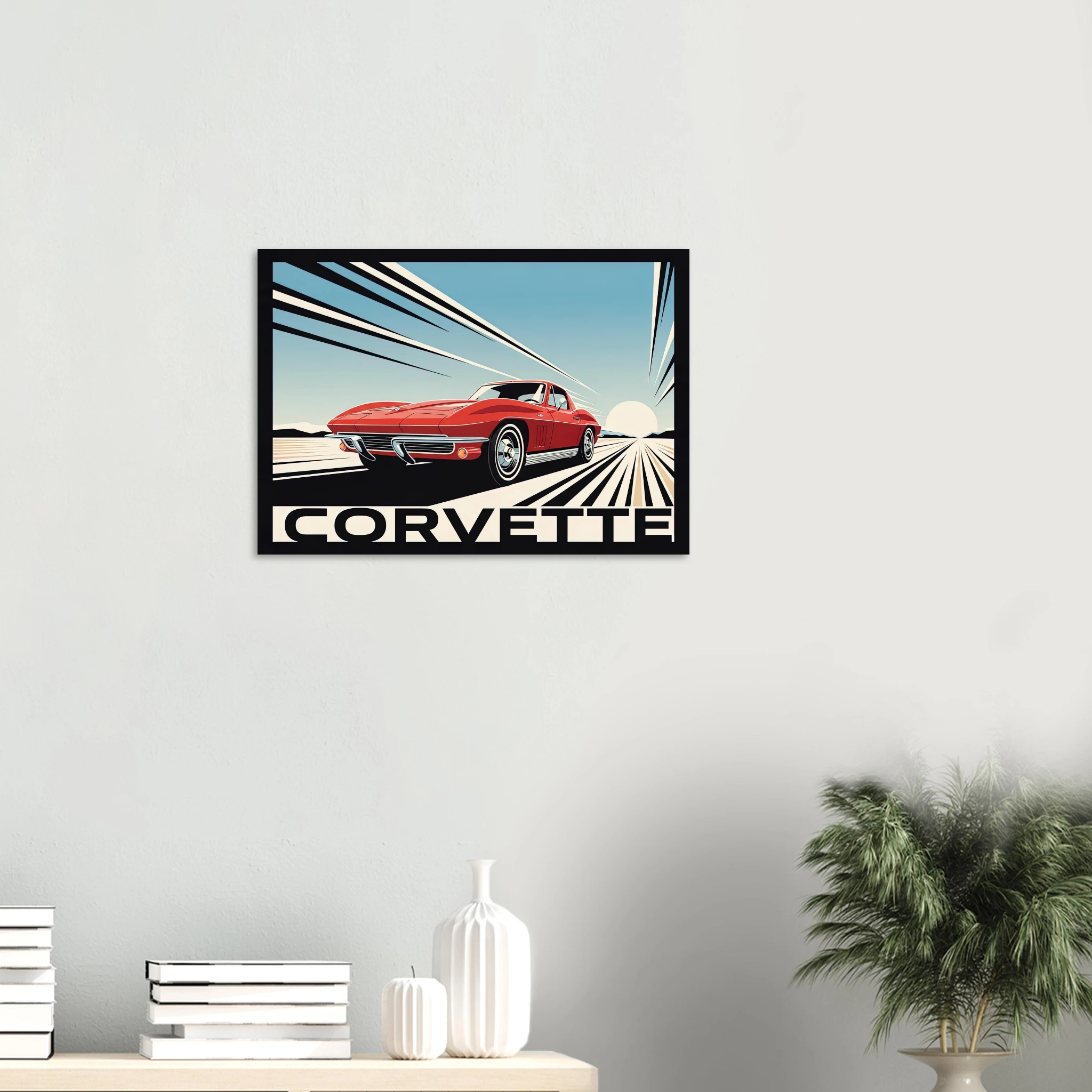 Corvette Stingray rojo en carretera del desierto, perspectiva dramática baja. Chromes brillantes, horizonte infinito. Deportivo americano icónico años 60.