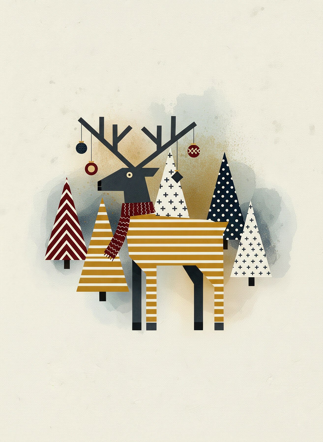 Reno estilizado con cuerpo decorado en rayas horizontales y bufanda chevron, combinando elementos tradicionales nórdicos con diseño contemporáneo. Los ornamentos geométricos en las astas y los pinos decorados en el fondo crean una composición rica en detalles. La paleta escandinava en mostaza y gris aporta sofisticación moderna. Ideal para espacios que buscan fauna invernal con toque hygge y pattern design.