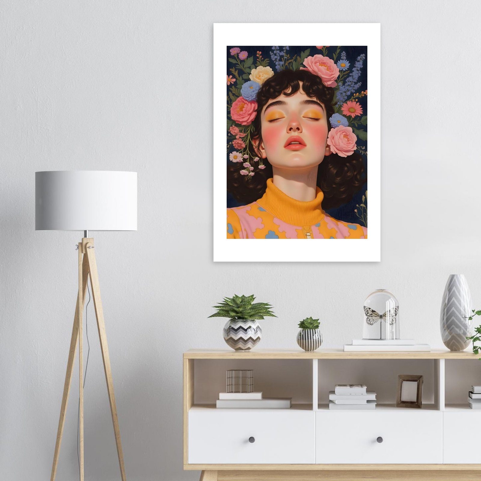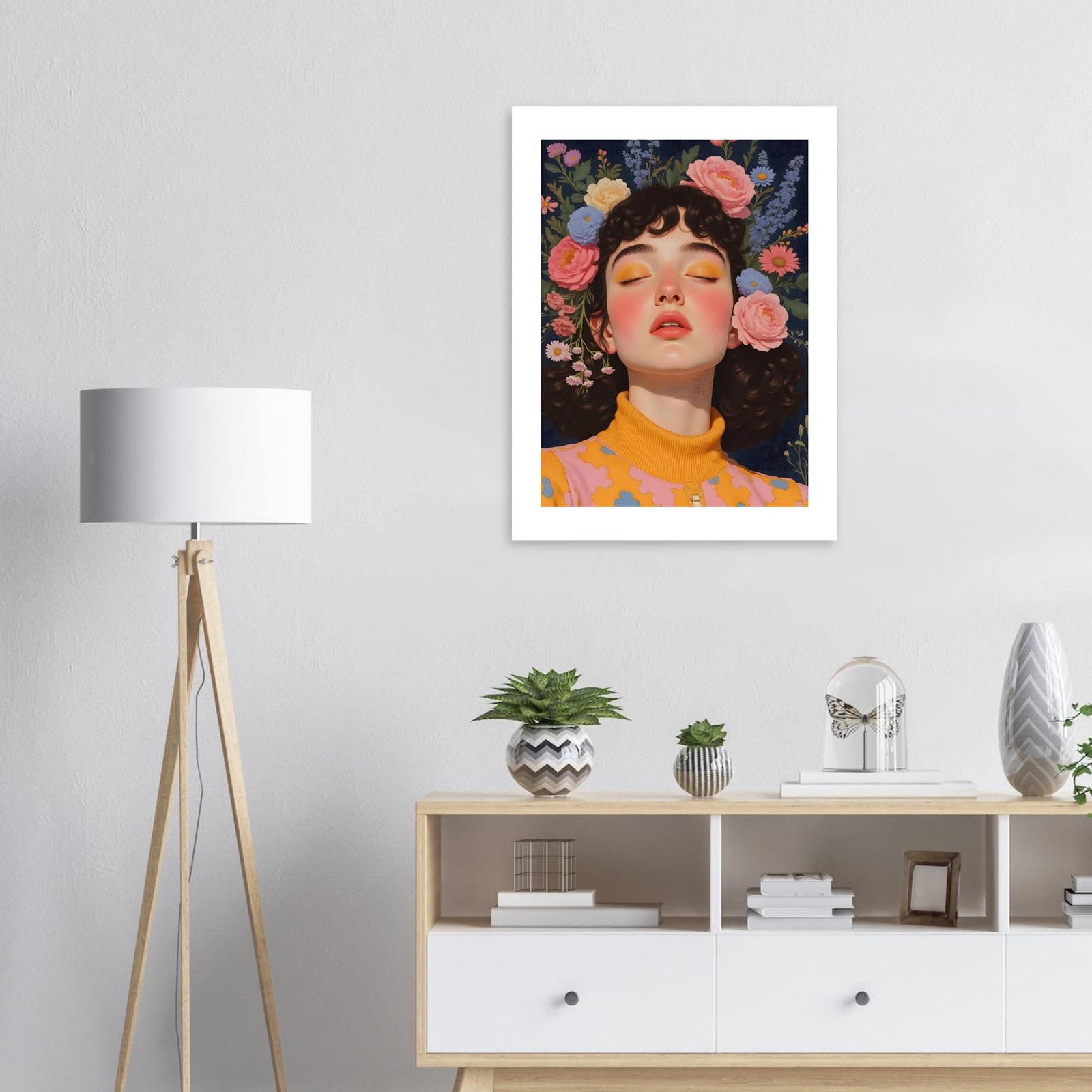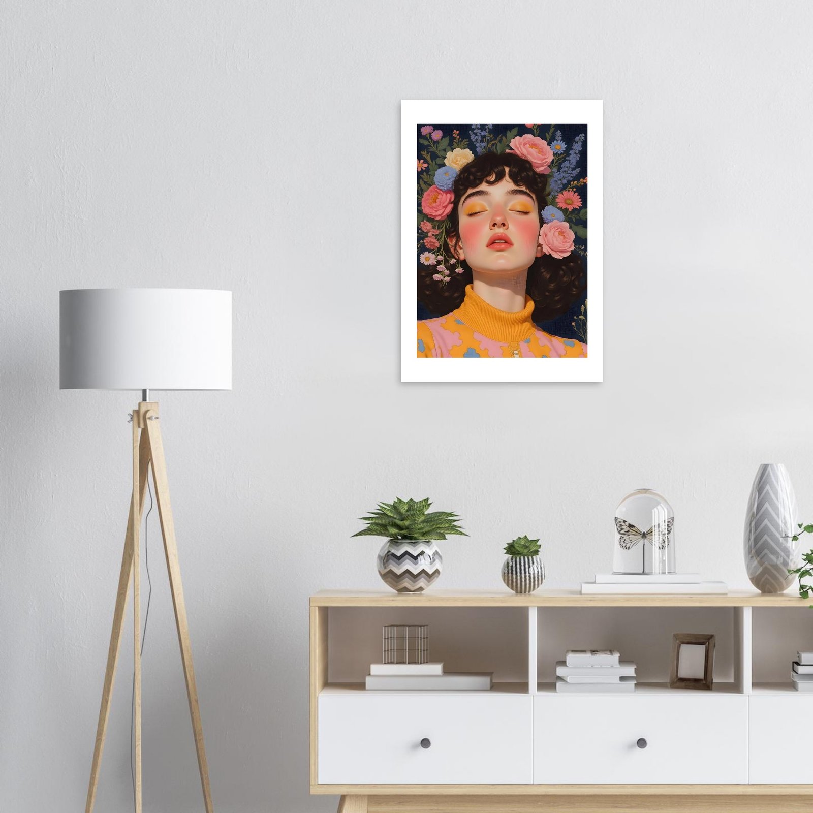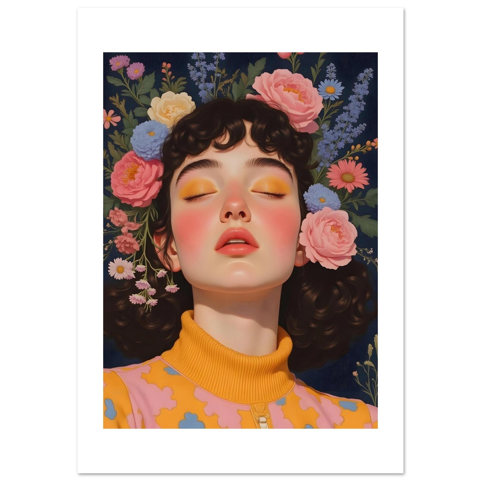 “Sueño Florido” es una obra que evoca la unión perfecta entre la naturaleza y la contemplación interior. El retrato muestra a una joven con los ojos cerrados, inmersa en una profunda paz, con flores vibrantes que parecen crecer de su cabello en un estallido de color y suavidad. La paleta de tonos pasteles y el fondo oscuro crean un contraste exquisito que resalta la delicadeza de cada pétalo y cada curva del rostro.