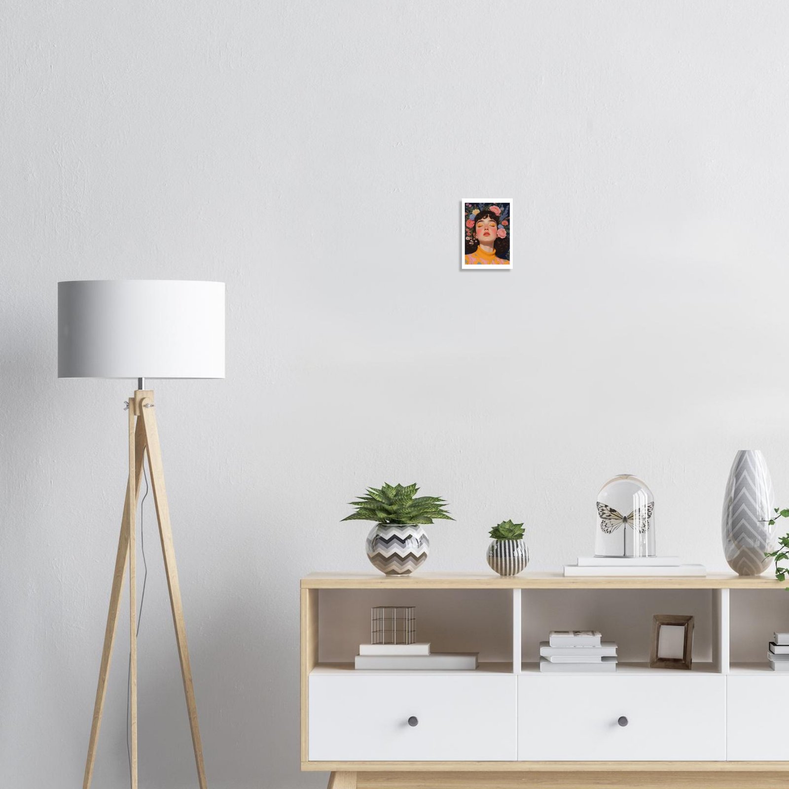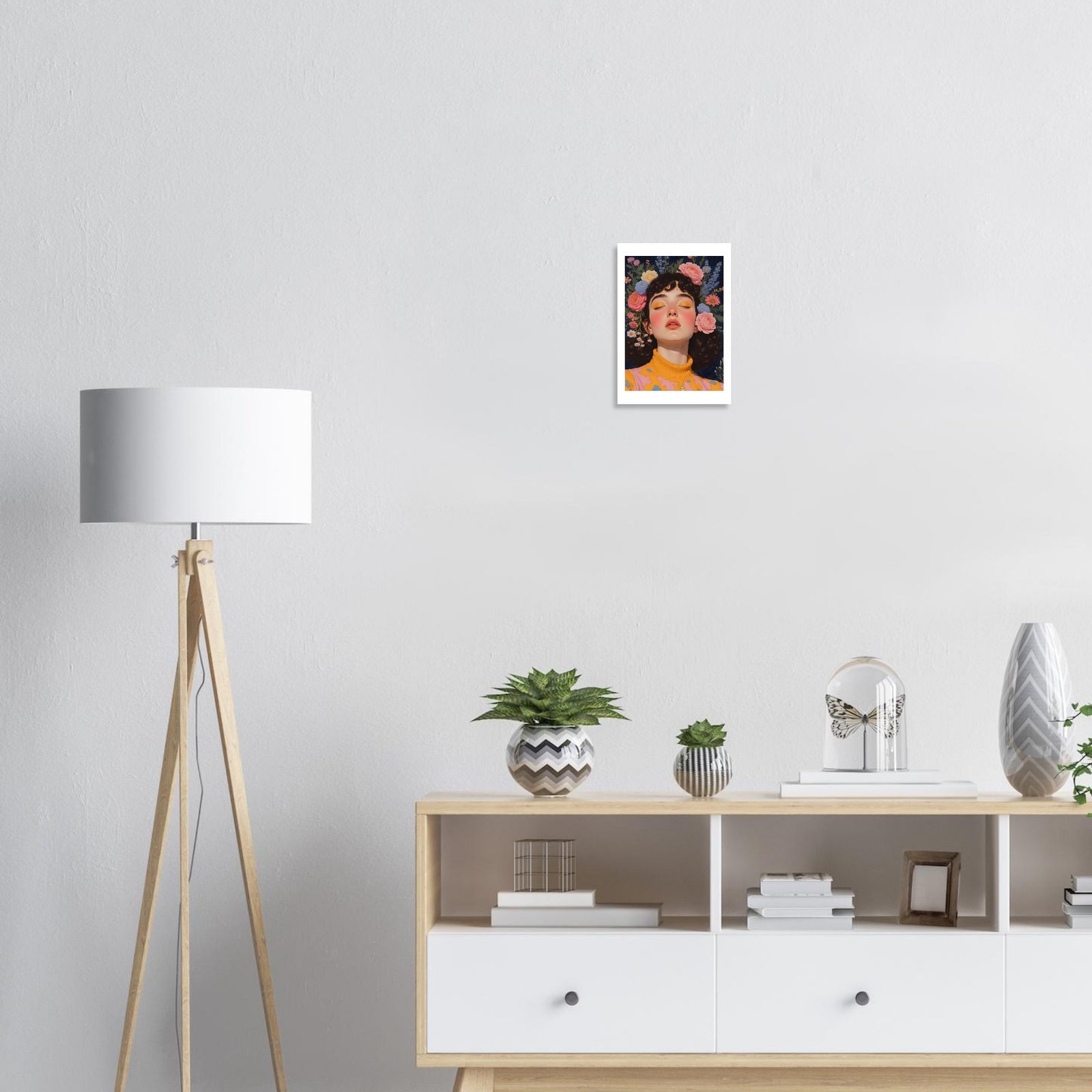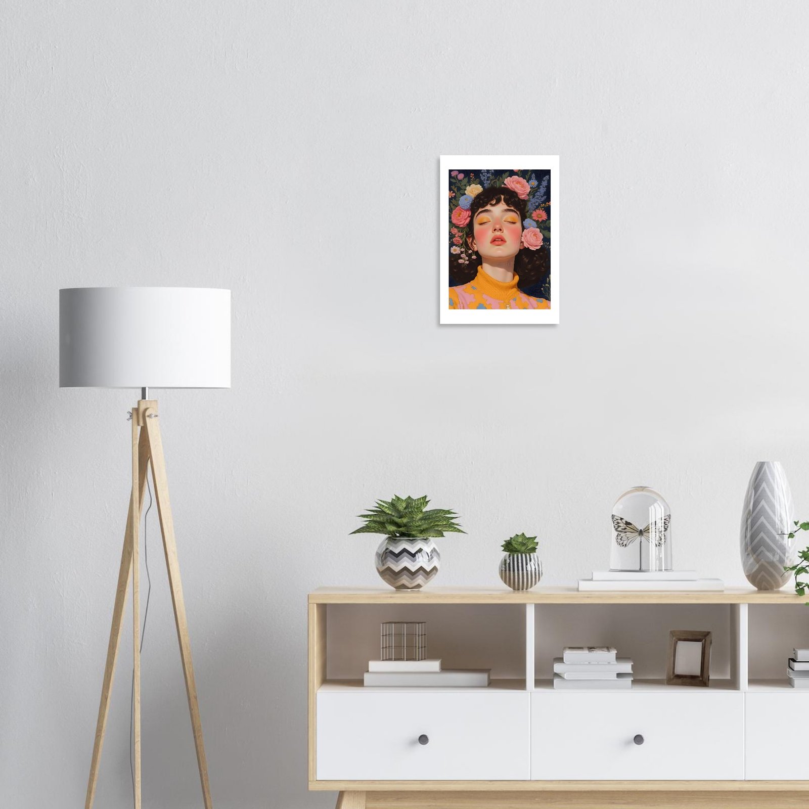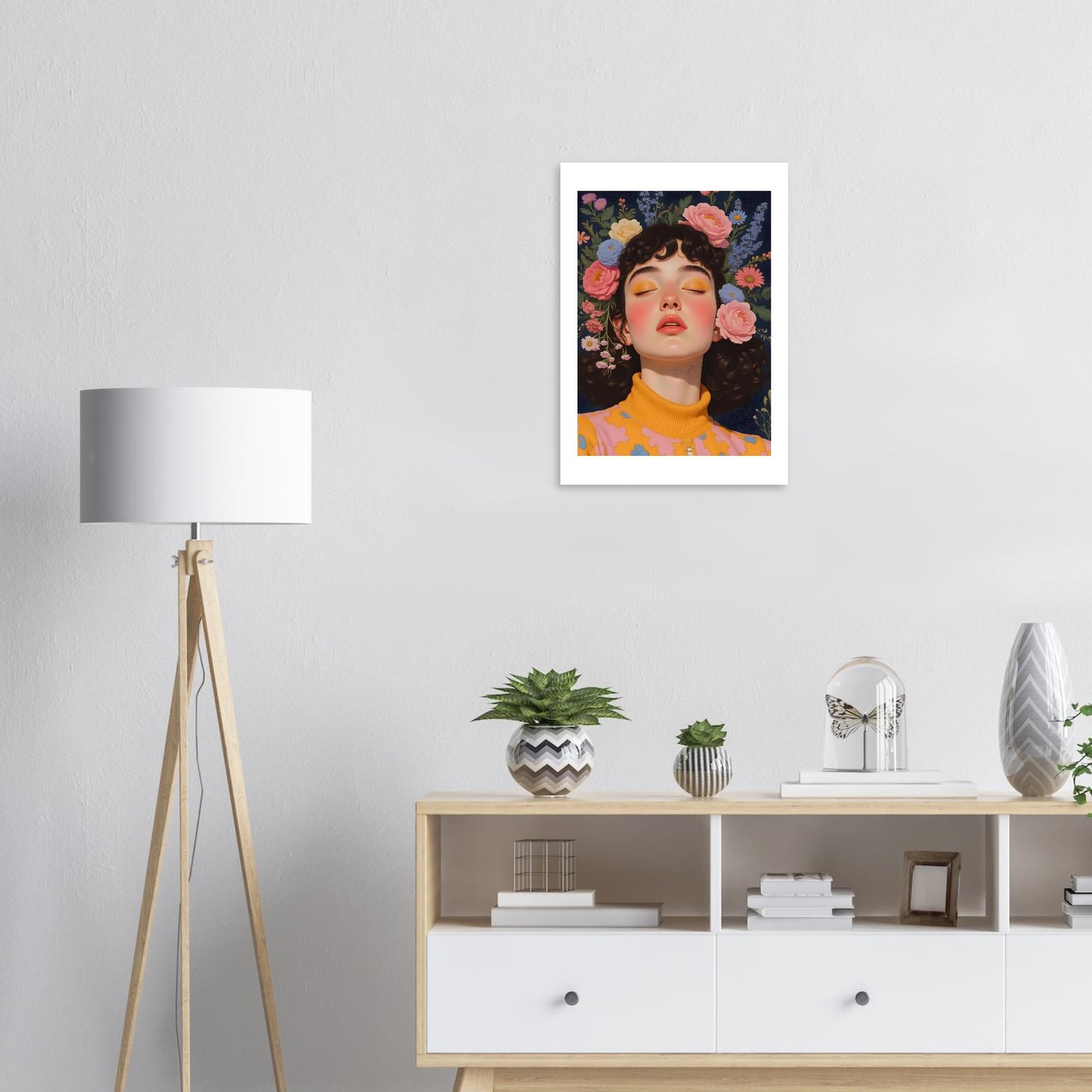 “Sueño Florido” es una obra que evoca la unión perfecta entre la naturaleza y la contemplación interior. El retrato muestra a una joven con los ojos cerrados, inmersa en una profunda paz, con flores vibrantes que parecen crecer de su cabello en un estallido de color y suavidad. La paleta de tonos pasteles y el fondo oscuro crean un contraste exquisito que resalta la delicadeza de cada pétalo y cada curva del rostro.
