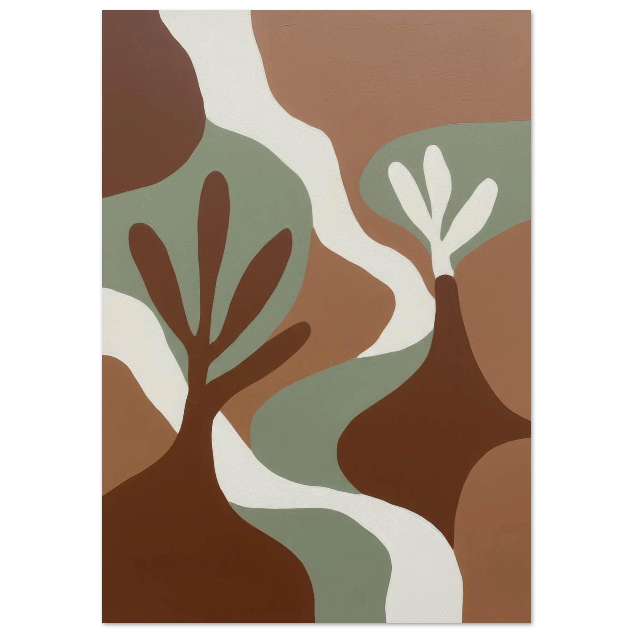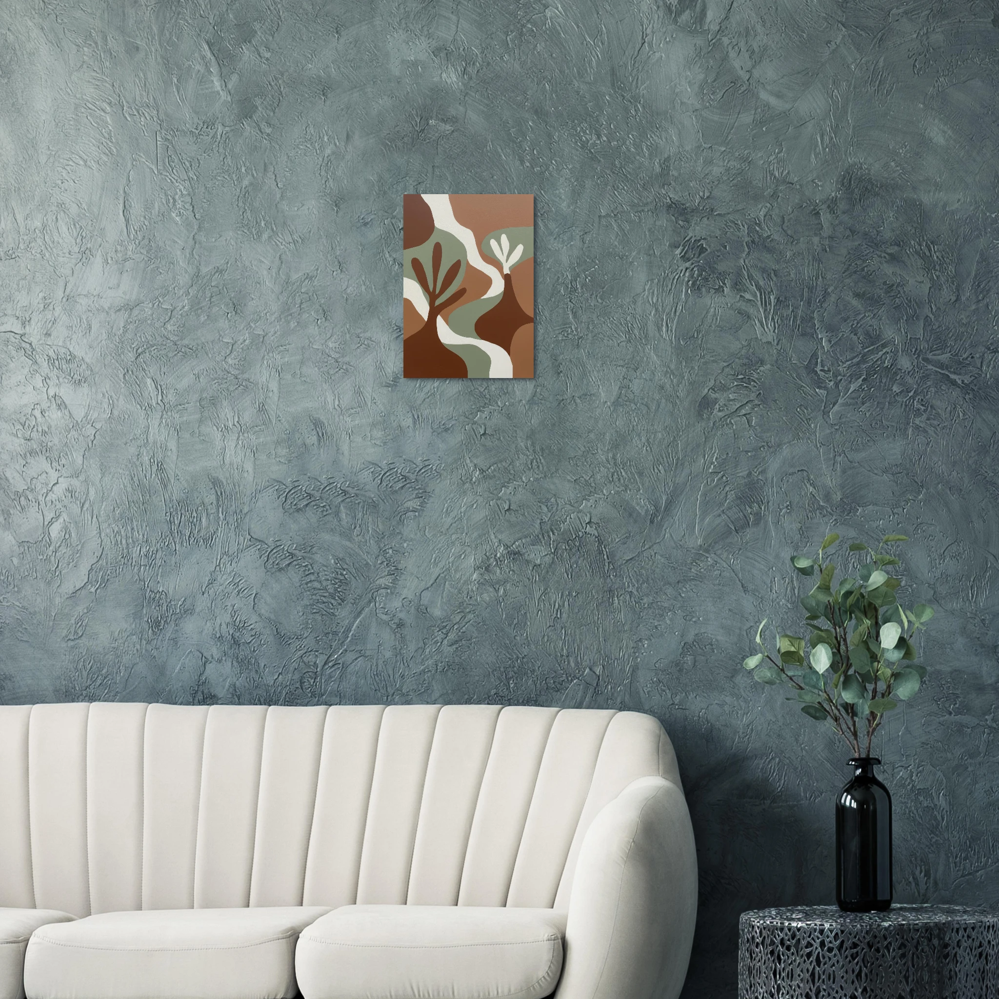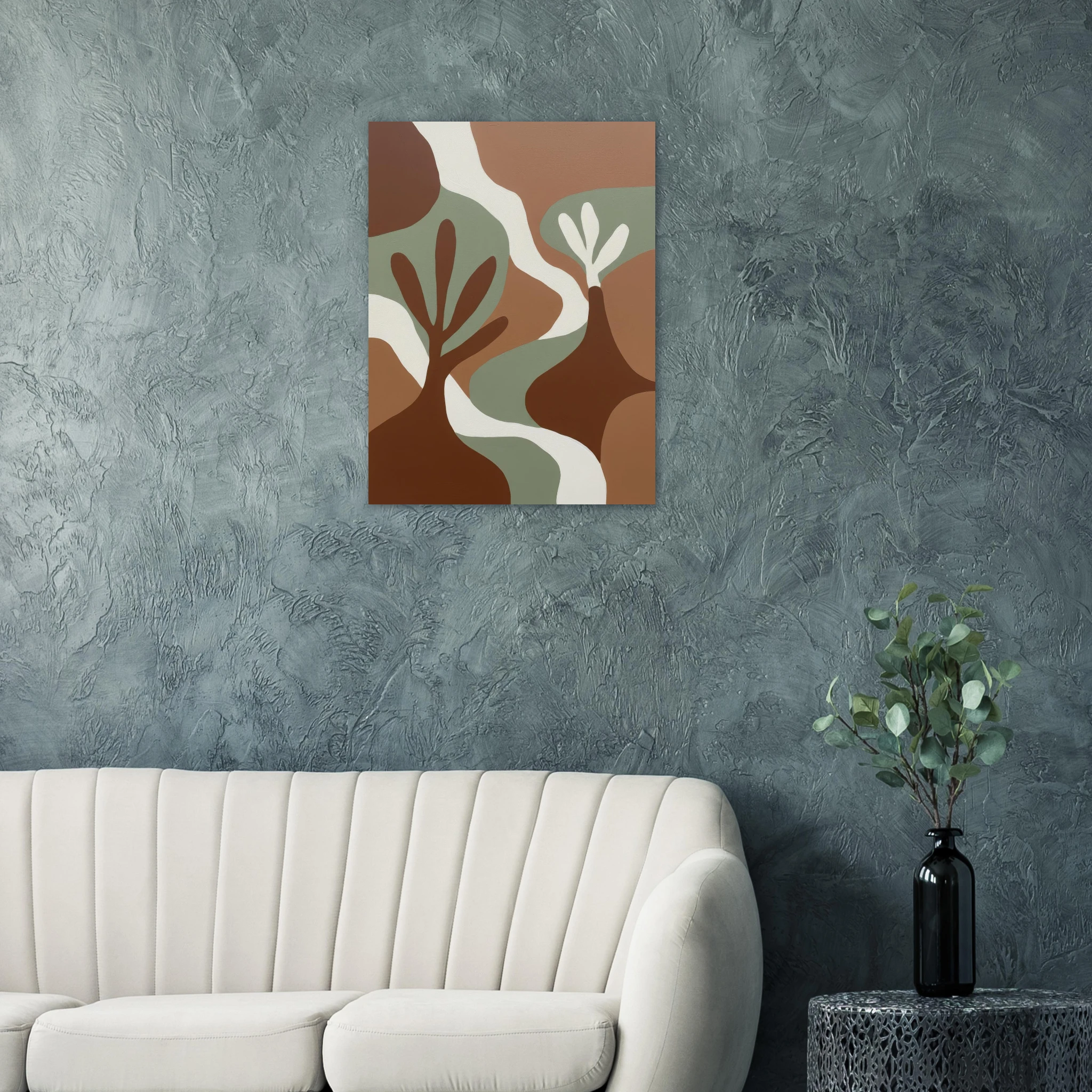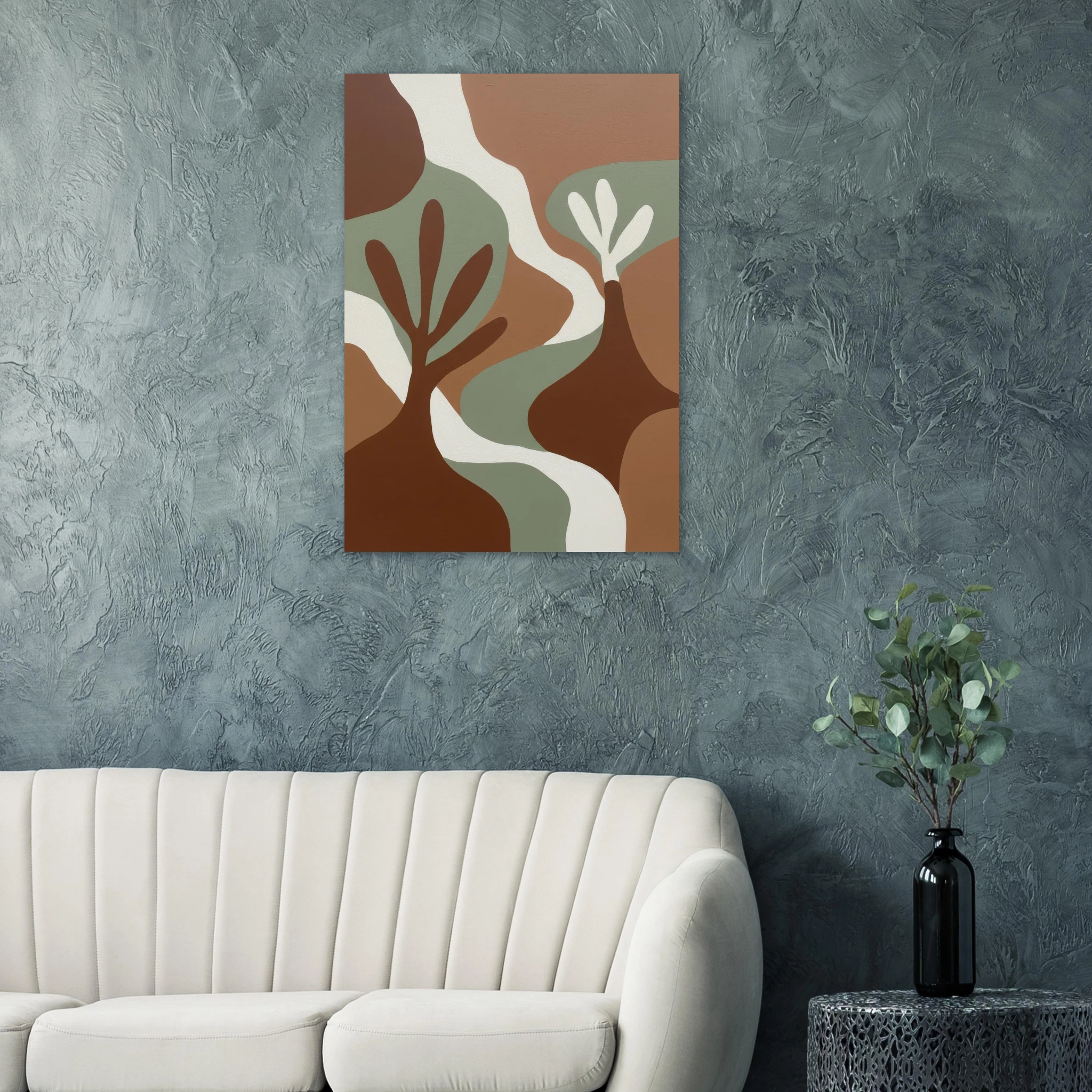 Terranova explora la belleza de los elementos terrestres a través de formas orgánicas que fluyen como capas geológicas o dunas de arena. Los tonos tierra cálidos crean una composición serena que ancla cualquier espacio con sofisticación natural.