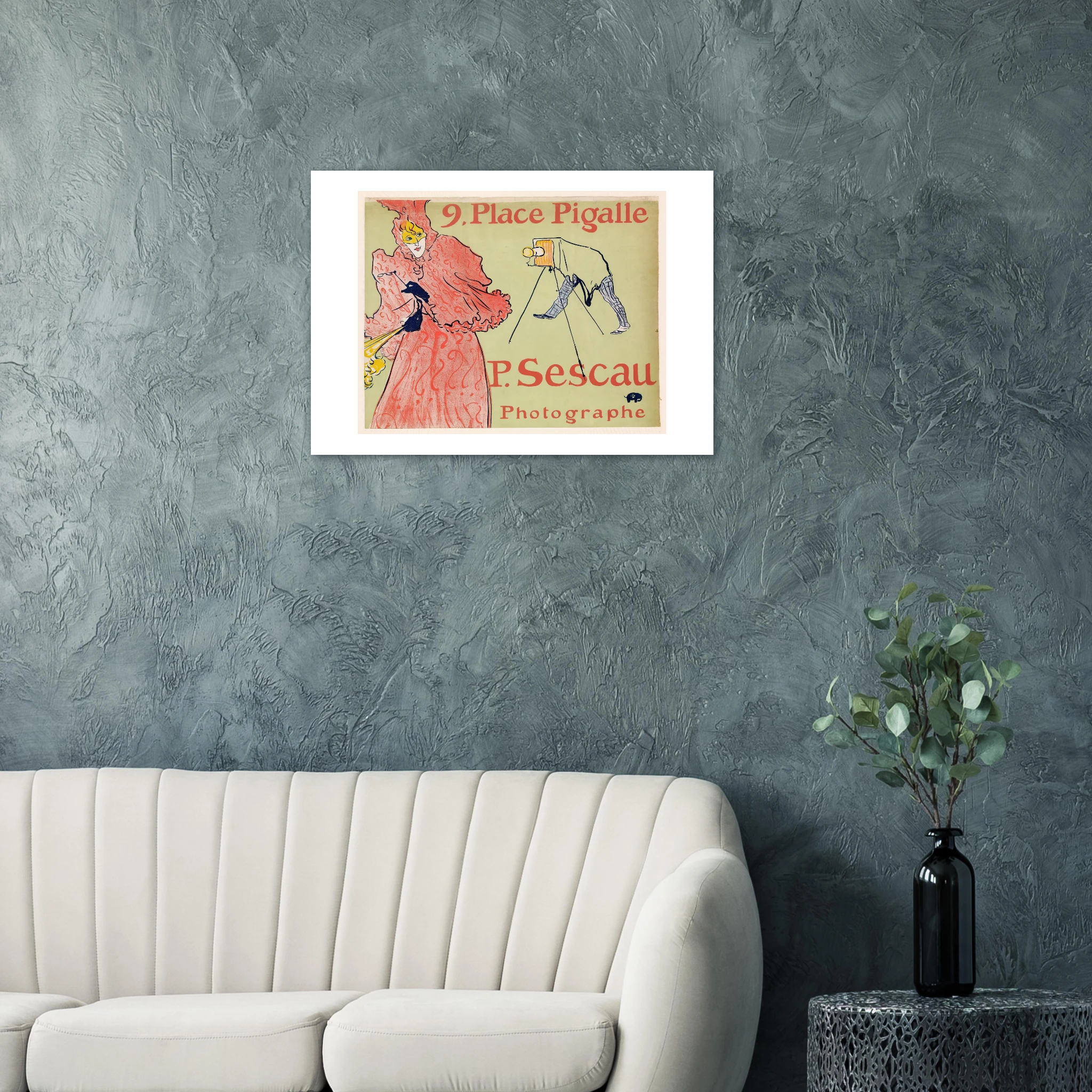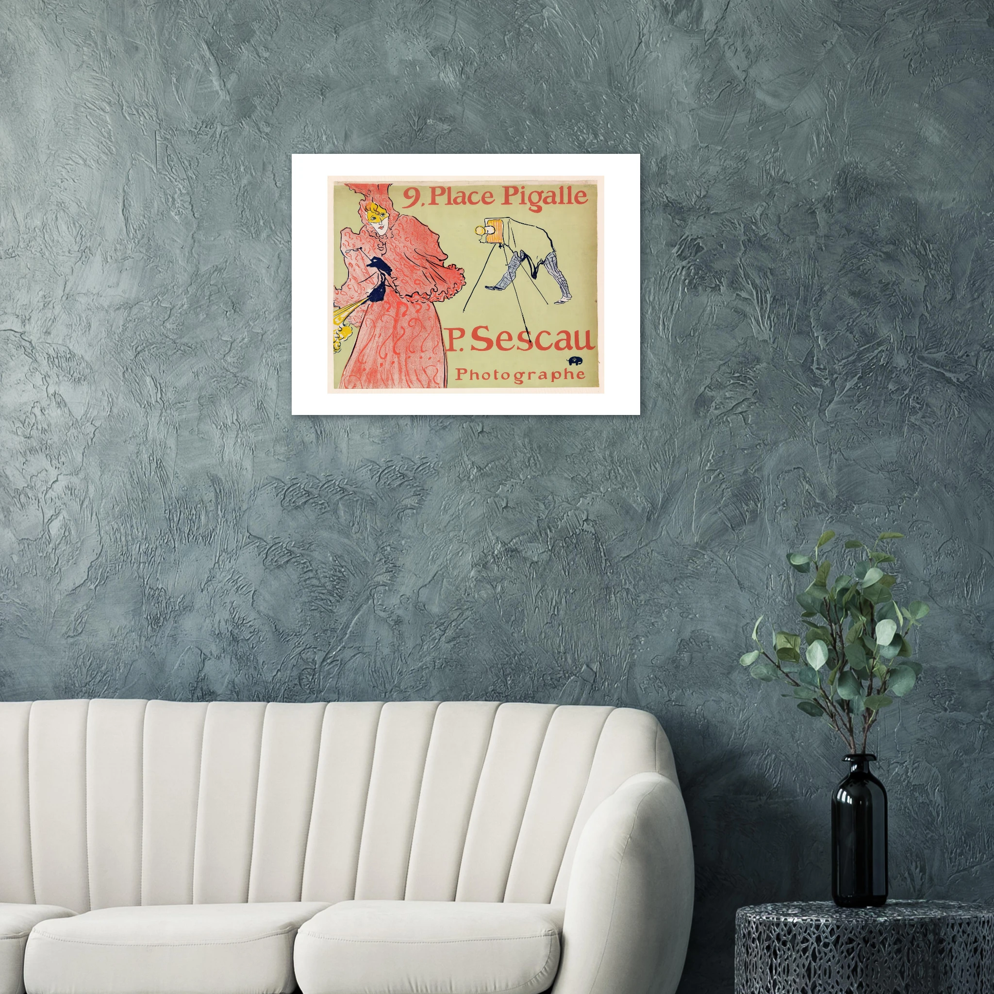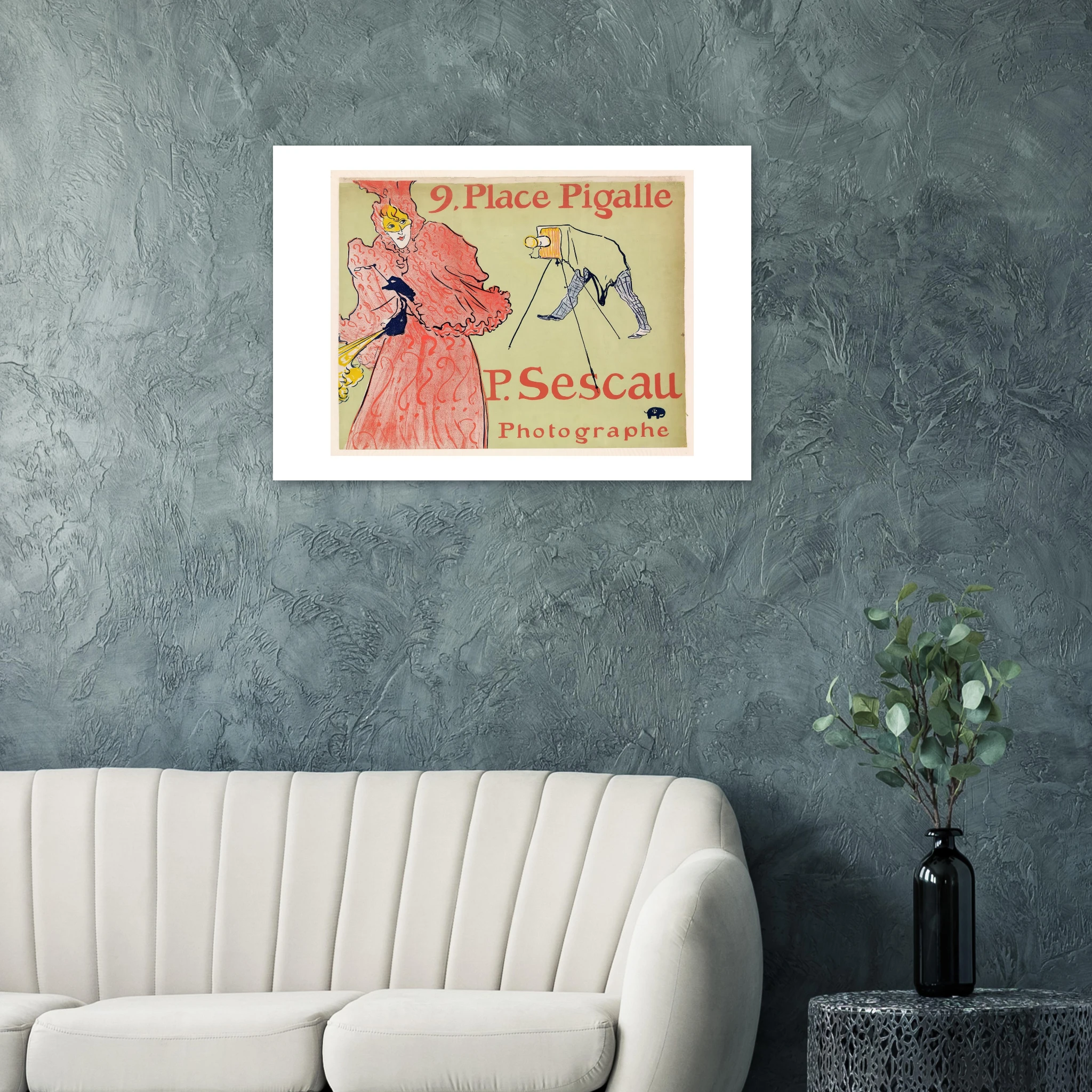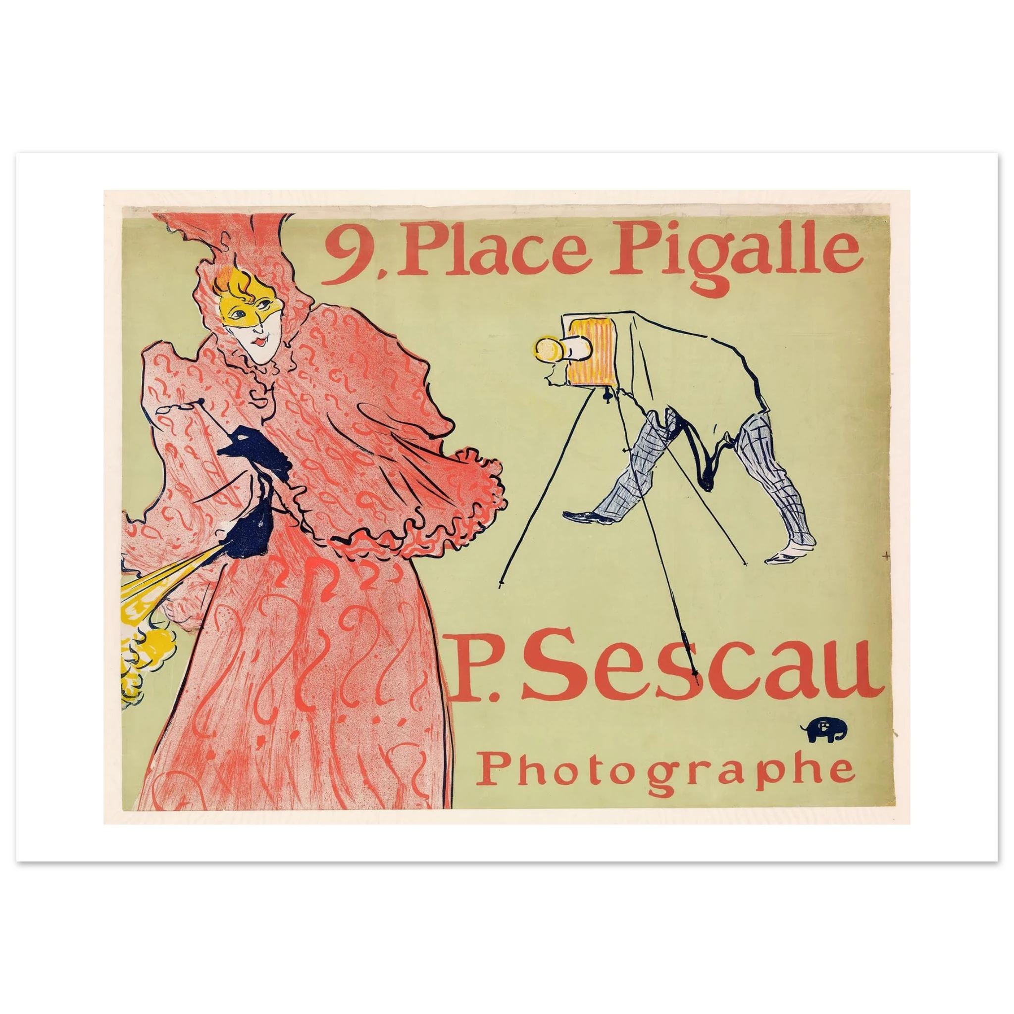 Este póster publicitario de 1894 fue diseñado para promocionar el estudio fotográfico de Paul Sescau, amigo personal de Toulouse-Lautrec y fotógrafo reconocido de la época. La obra representa un punto de inflexión en el diseño publicitario, donde el artista aplica principios del Art Nouveau a la comunicación comercial.
