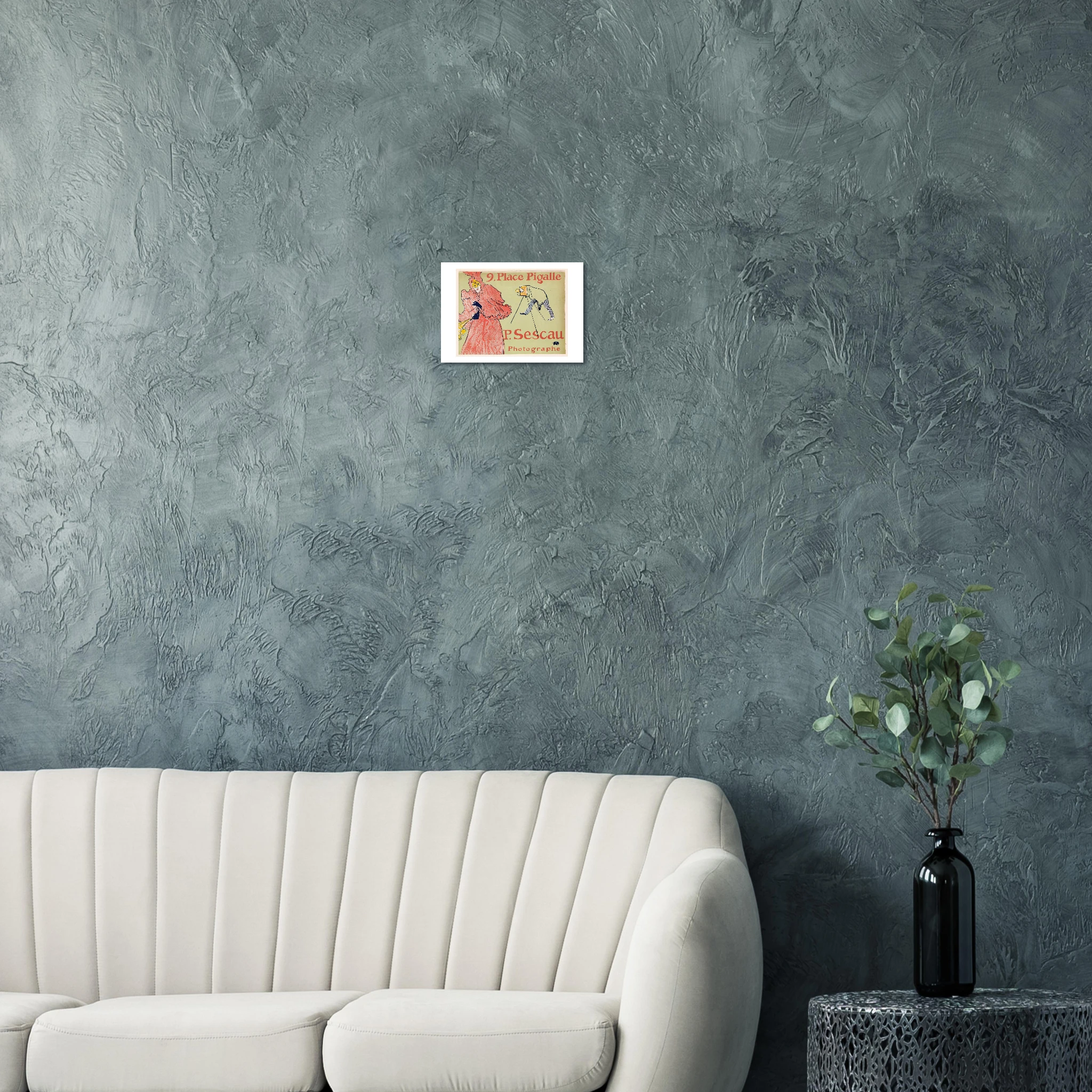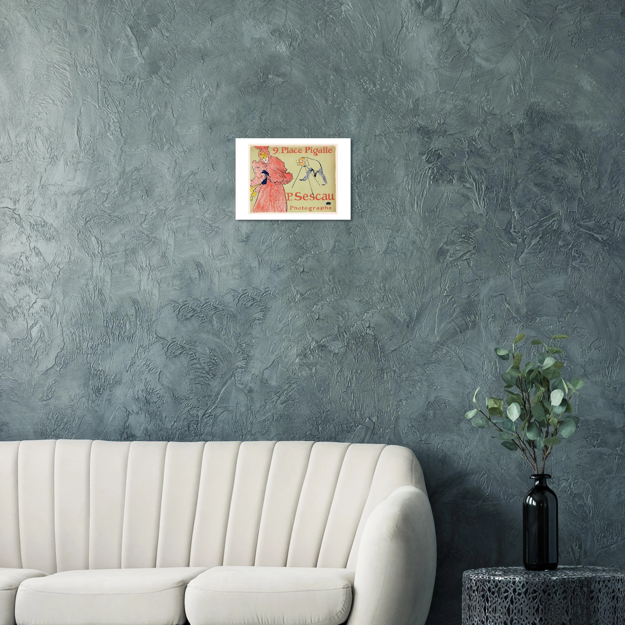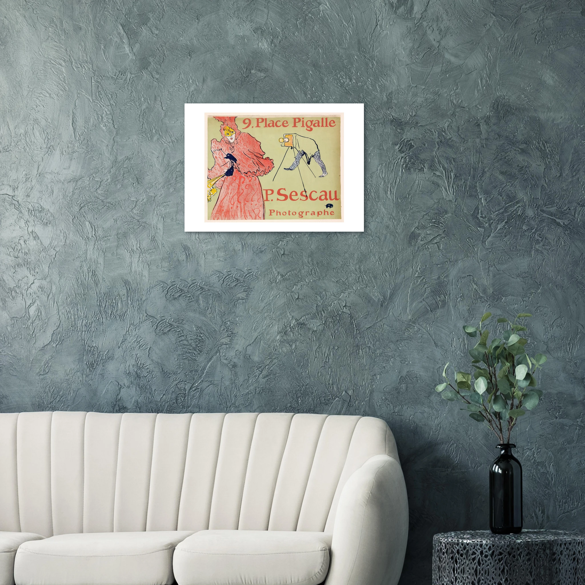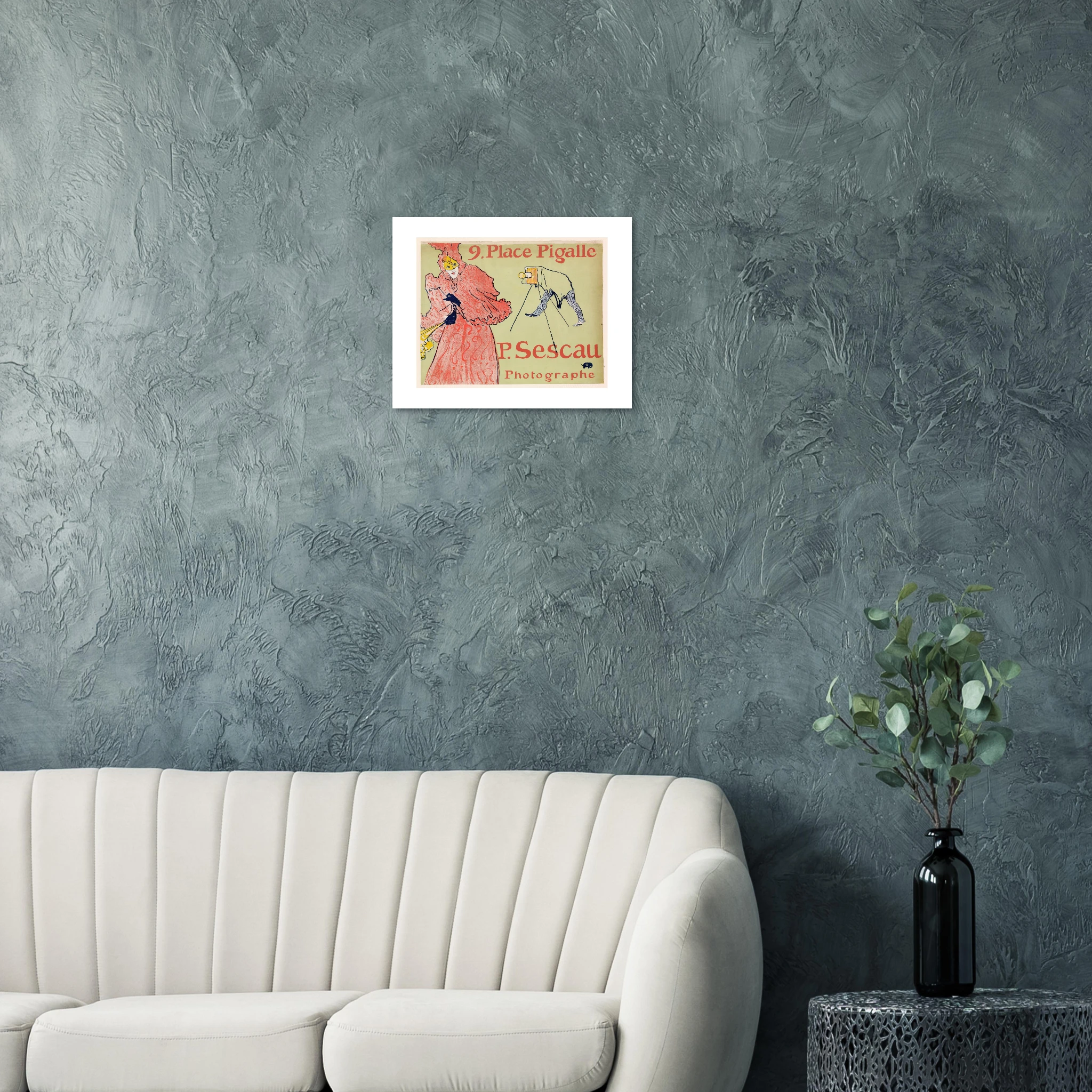 Este póster publicitario de 1894 fue diseñado para promocionar el estudio fotográfico de Paul Sescau, amigo personal de Toulouse-Lautrec y fotógrafo reconocido de la época. La obra representa un punto de inflexión en el diseño publicitario, donde el artista aplica principios del Art Nouveau a la comunicación comercial.