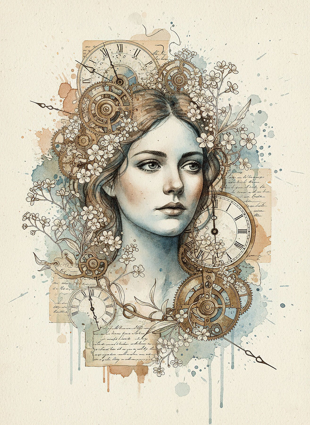 “Tiempo Suspendido” es una meditación visual sobre la memoria y el paso del tiempo. El rostro de la mujer emerge entre capas de esferas de relojes antiguos y mecanismos de relojería, como si flotara en un océano temporal. Las nomeolvides y mosquetas dibujadas en tinta sepia añaden ternura a la composición mecánica, recordándonos que los momentos más preciados son a menudo los más efímeros. Los fragmentos de cartas manuscritas antiguas hablan de amores y pérdidas, mientras que las manecillas de reloj señalan momentos significativos congelados en el tiempo. La paleta apagada de azules y marrones evoca fotografías descoloridas y recuerdos que se desvanecen. Perfecta para amantes de la estética vintage y aquellos que encuentran belleza en la nostalgia.
