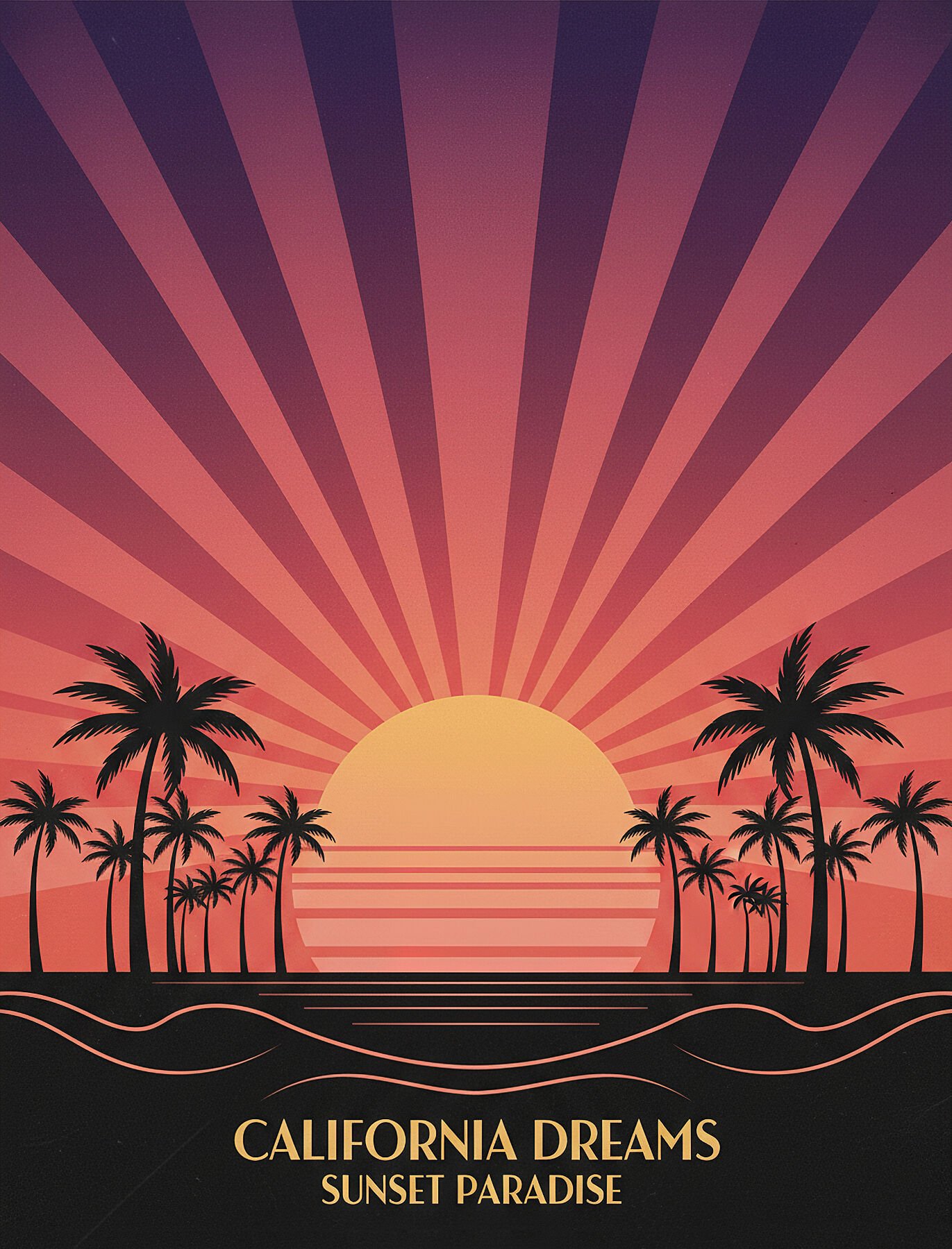 Sunset Boulevard fusiona la sofisticación geométrica del Art Déco de los años 20 con el glamour californiano de los 70. Un sol estilizado se pone tras siluetas de palmeras, creando una escena atemporal que evoca atardeceres dorados y sueños de Hollywood.