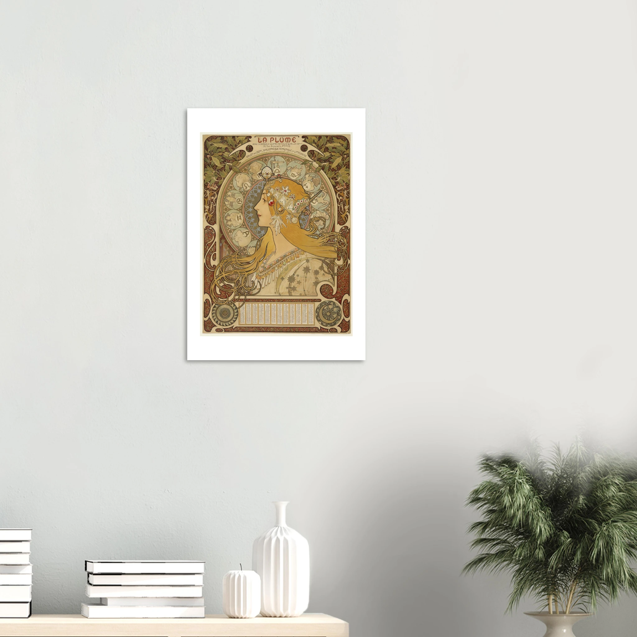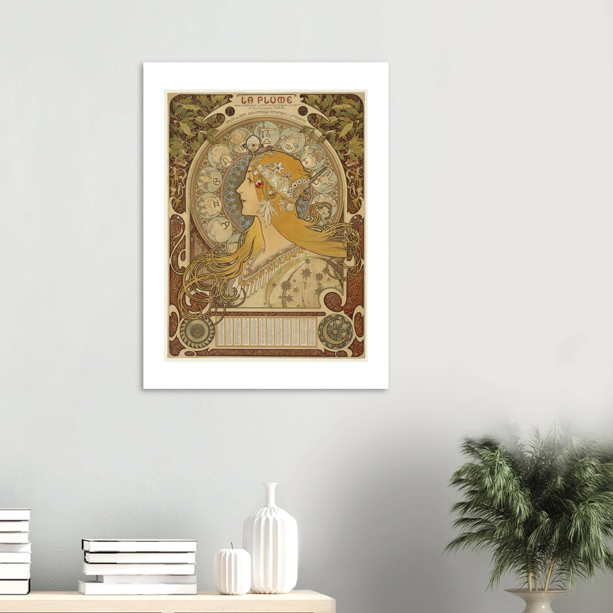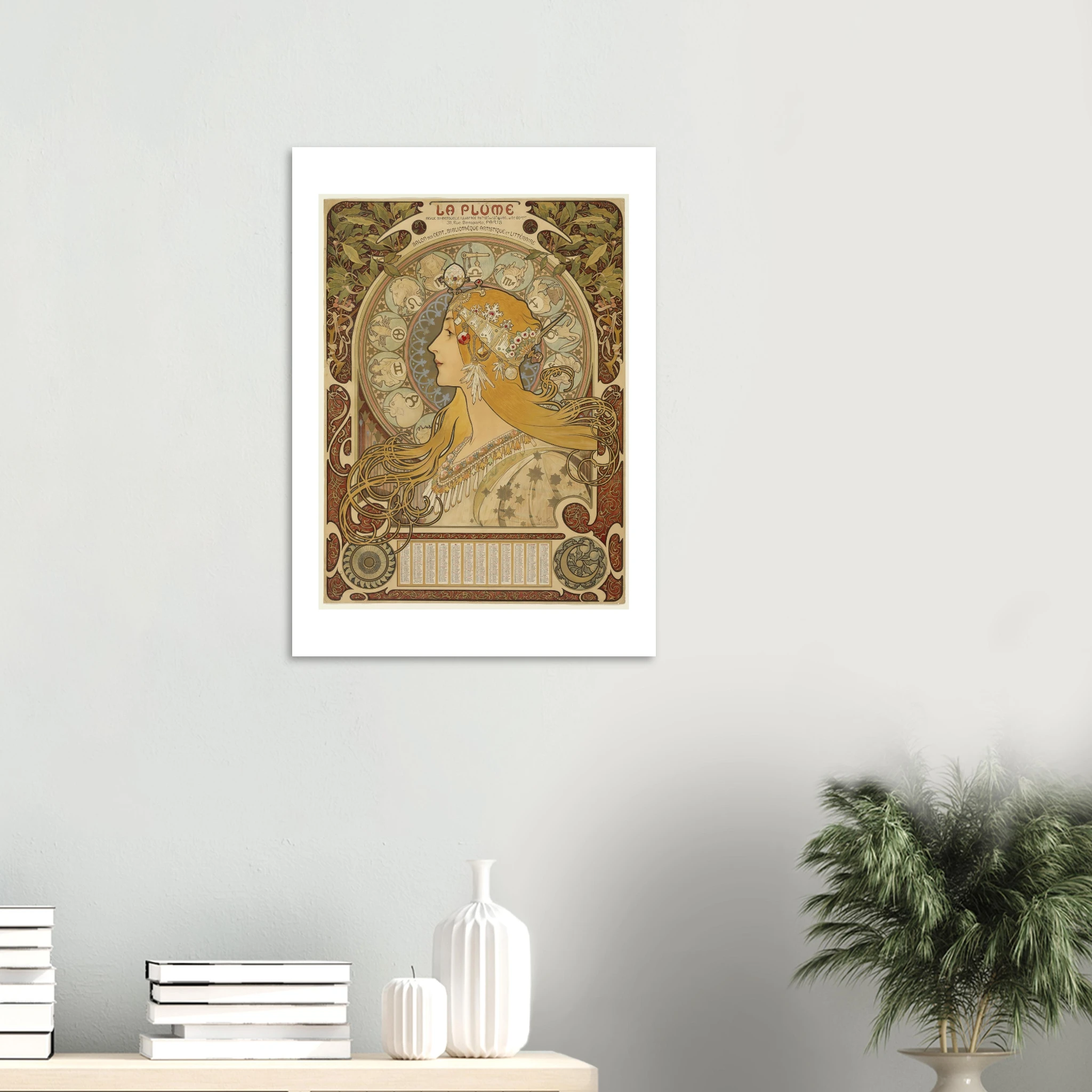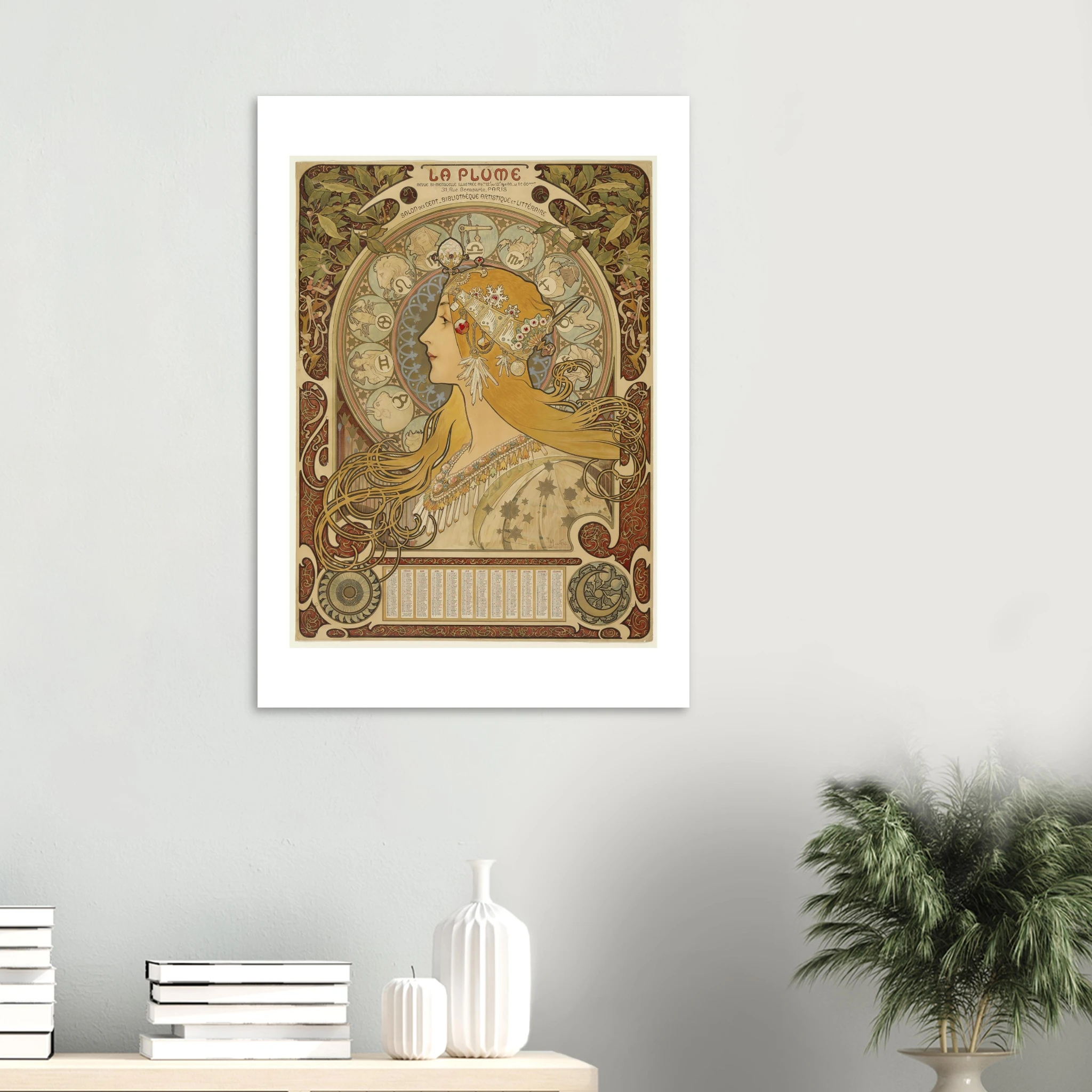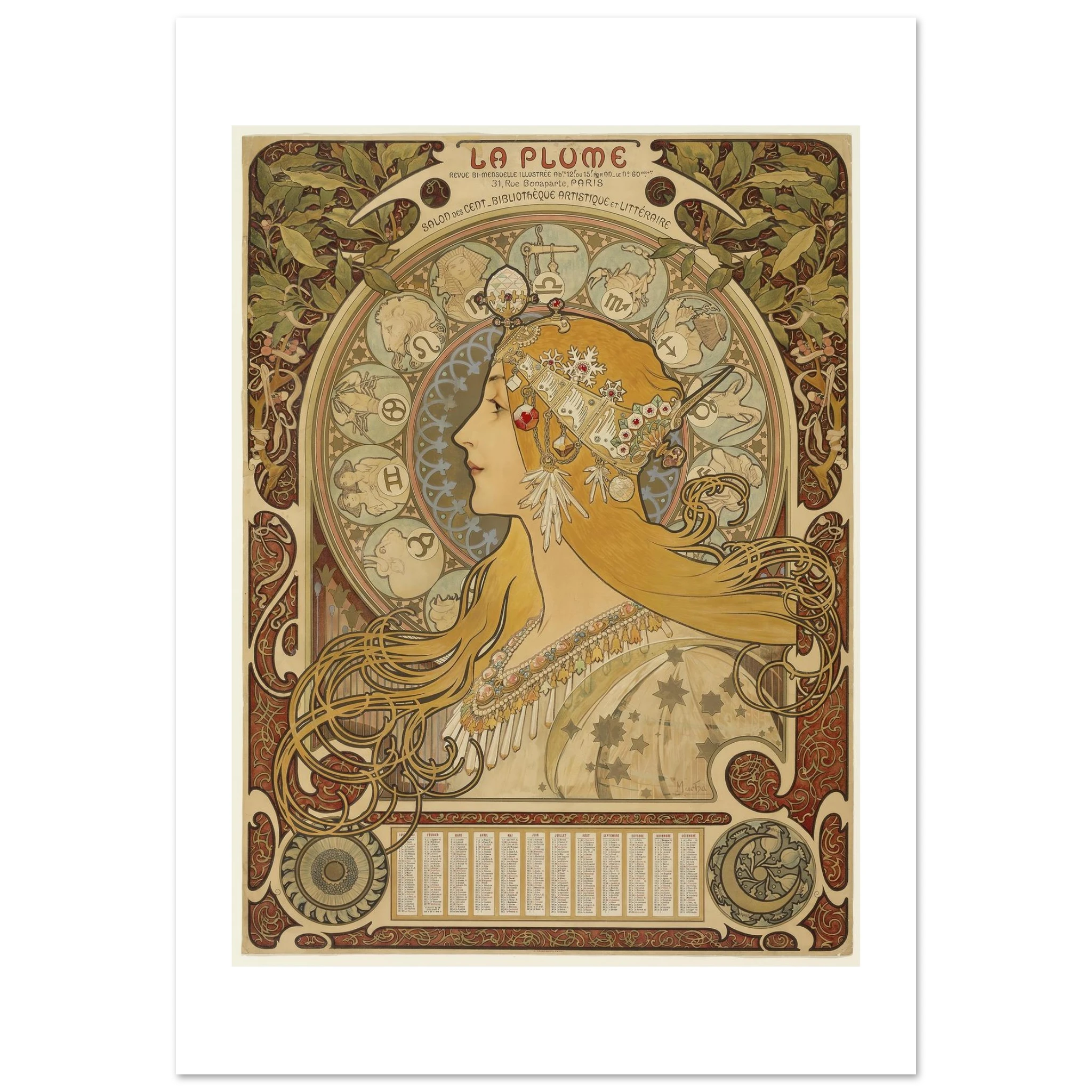 “Zodíaque” es una de las obras más reproducidas y admiradas de Alphonse Mucha, creada originalmente como calendario para la influyente revista artística “La Pluma” entre 1896 y 1897. Esta composición magistral se ha convertido en un ícono del Art Nouveau y del arte esotérico fin de siècle.